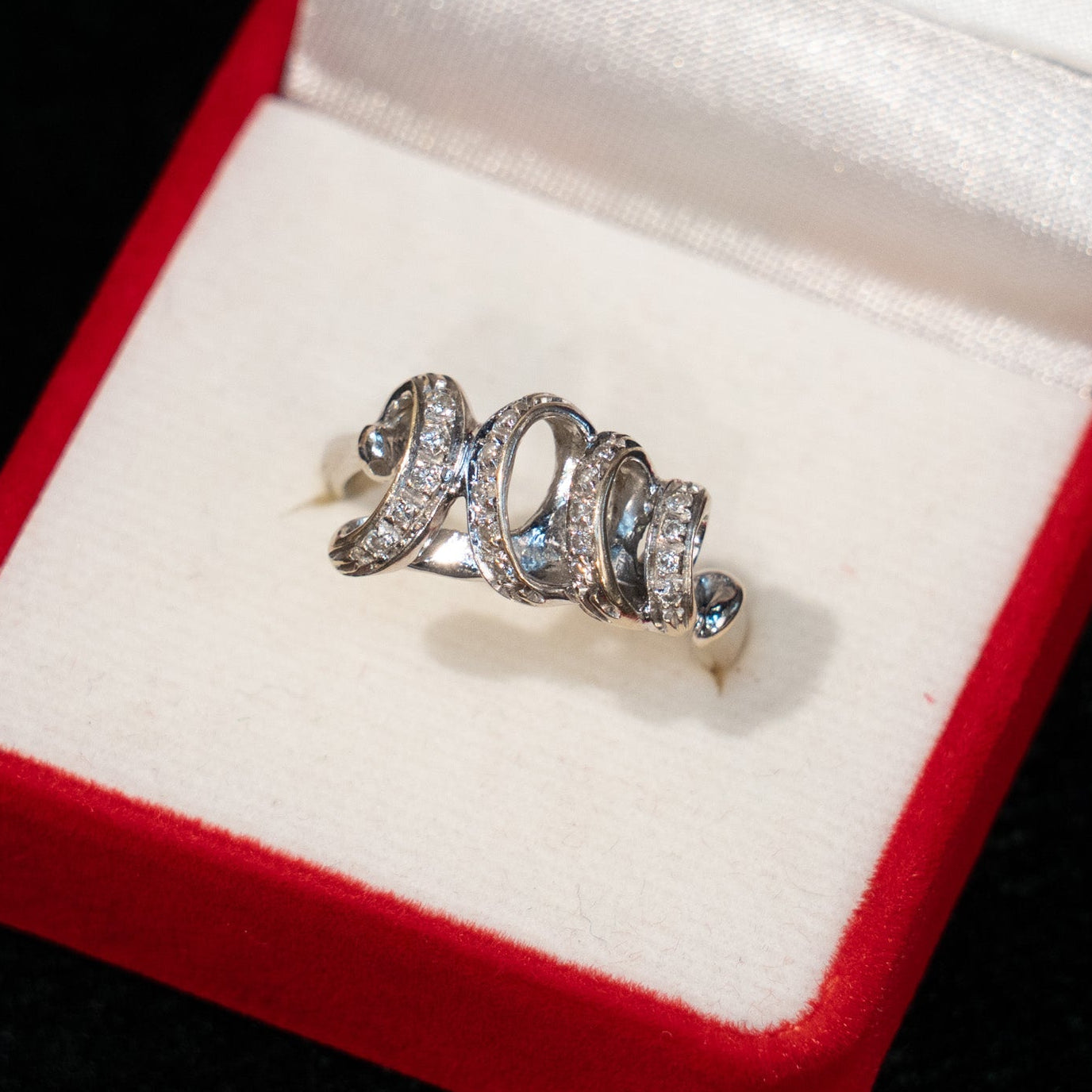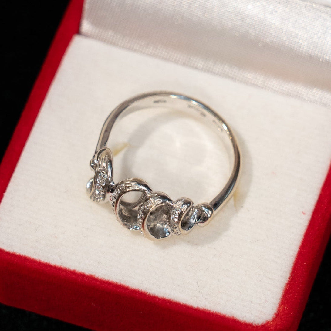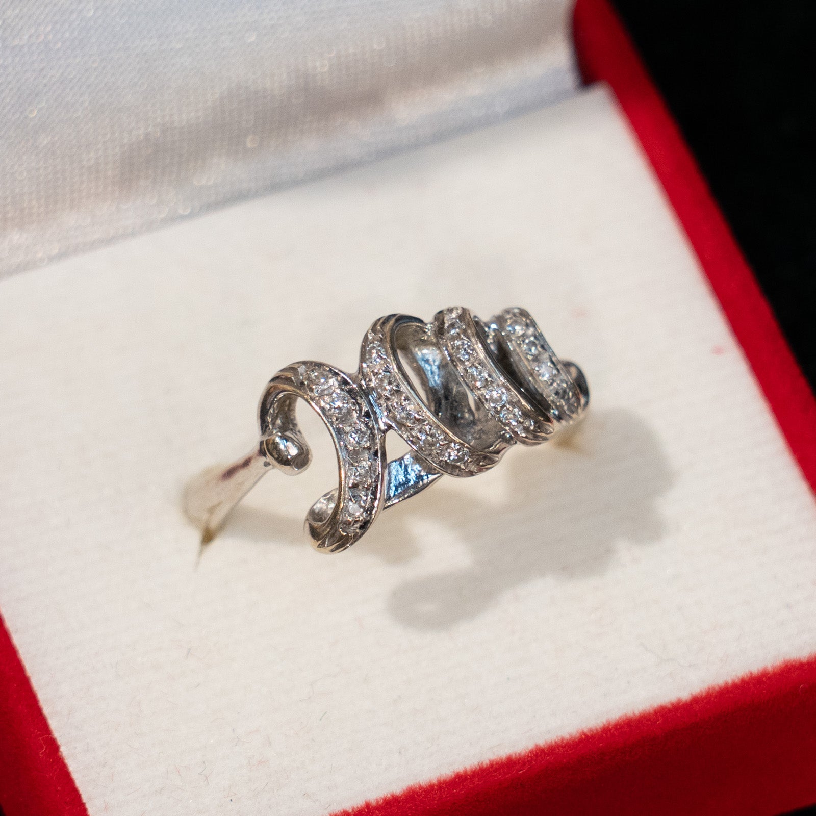 こちらはイギリスから買付けた、優雅な渦巻模様が立体感のある輝きを放つアンティークリングです。