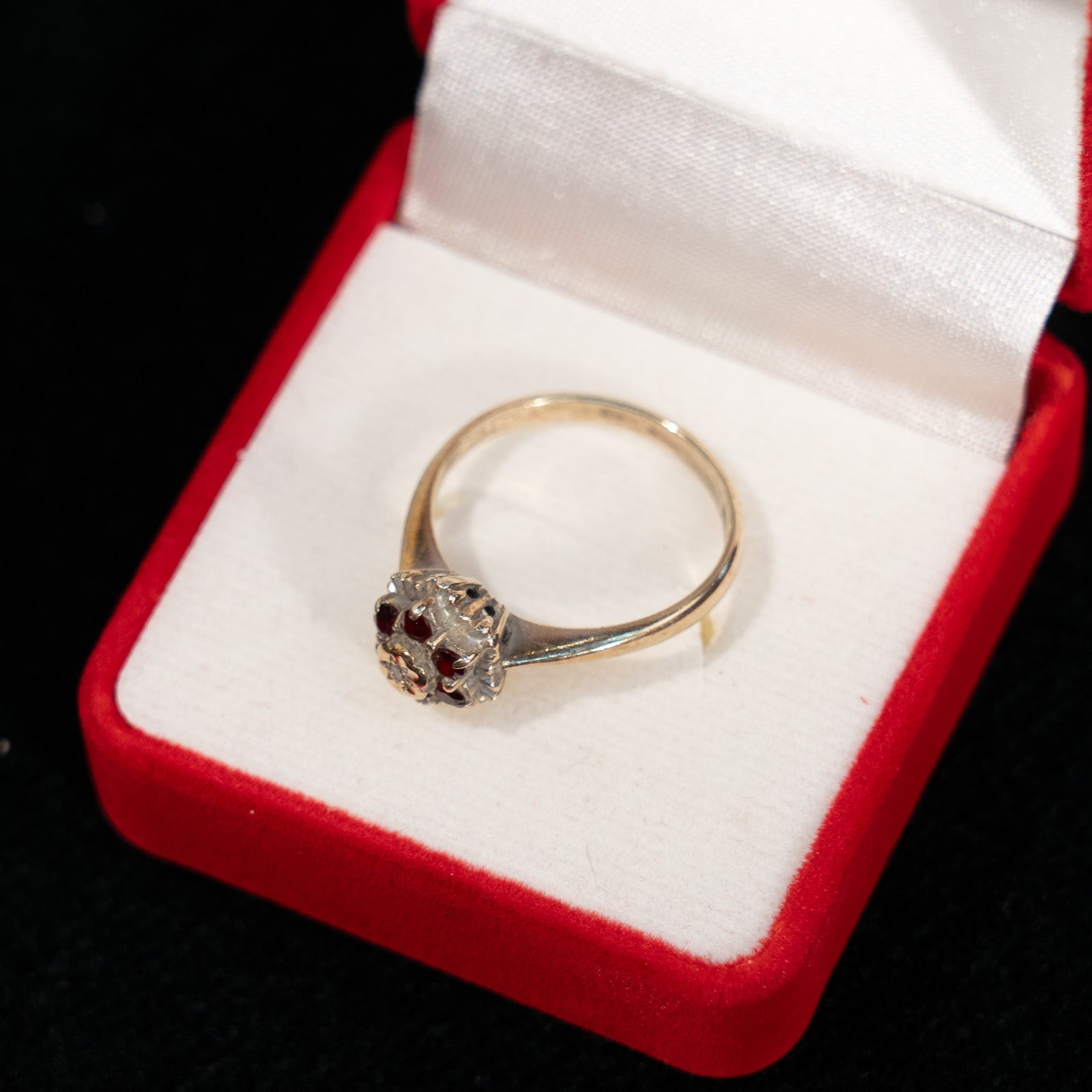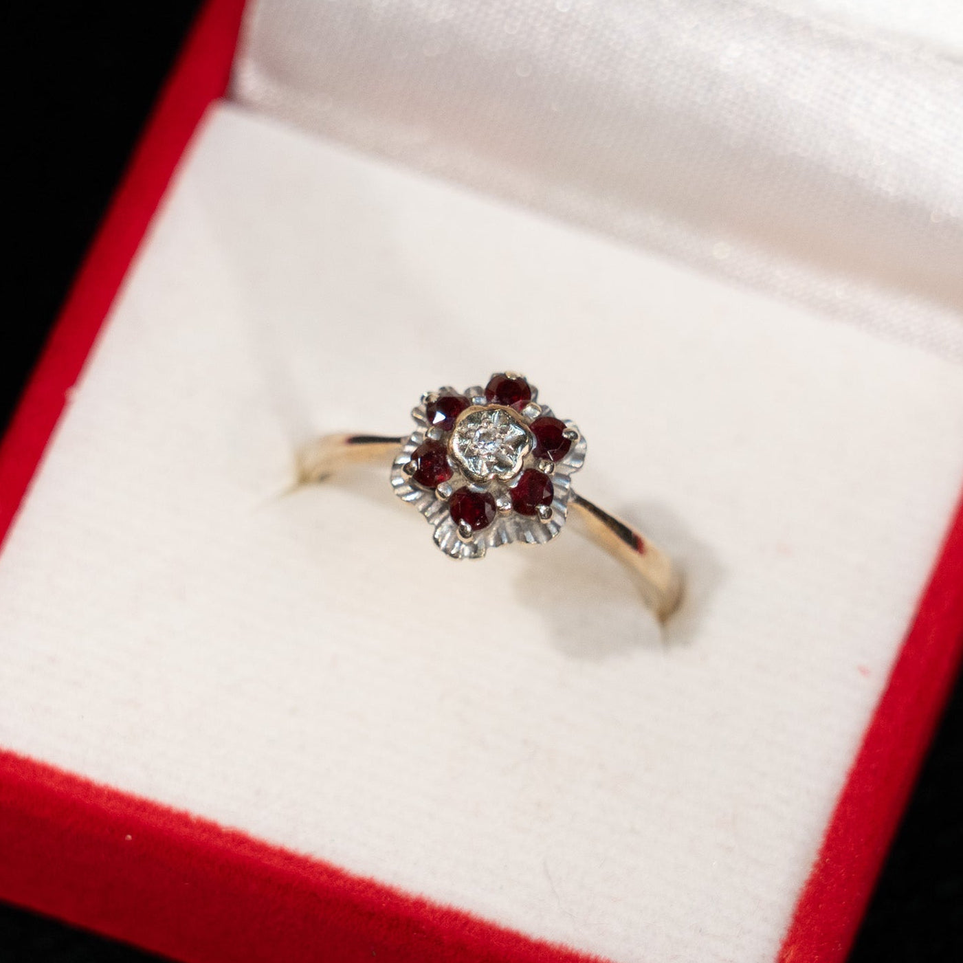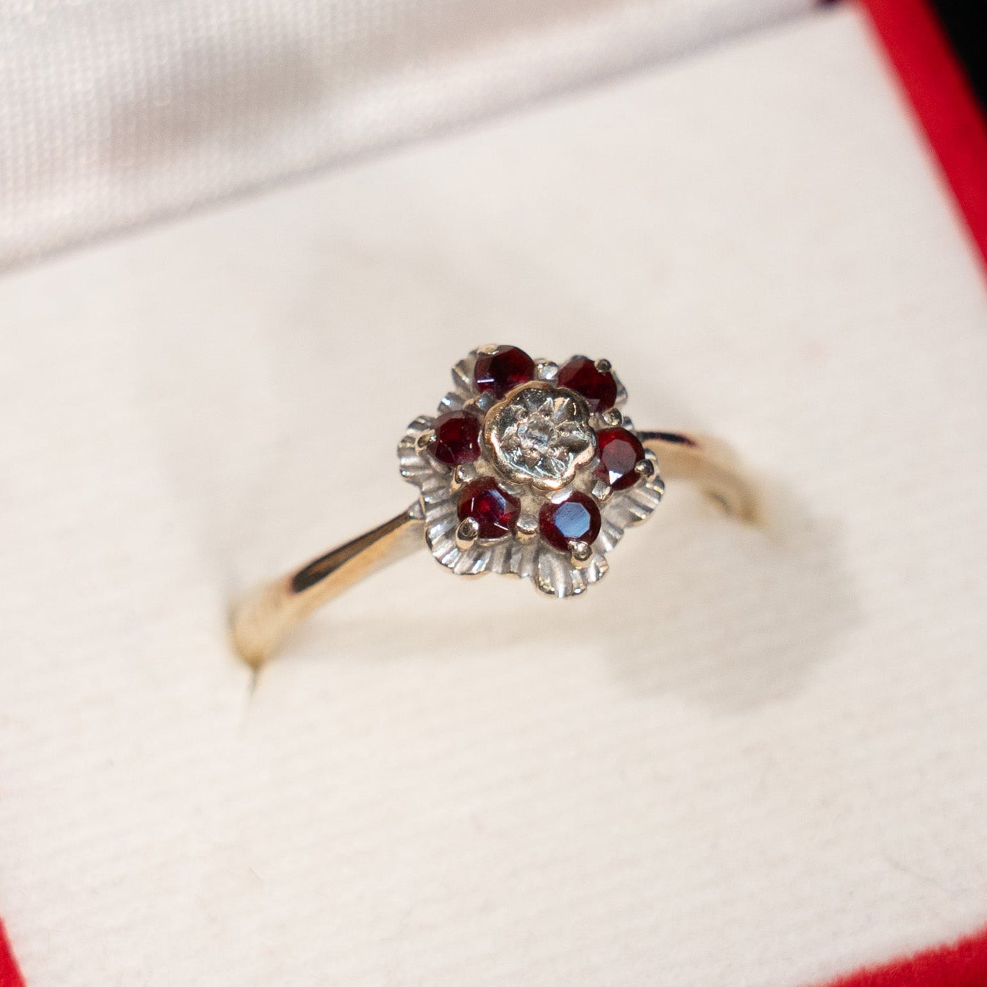 こちらはイギリスから買付けた、深紅のガーネットとダイヤモンドが花びらのように輝く優雅なアンティークリングです。