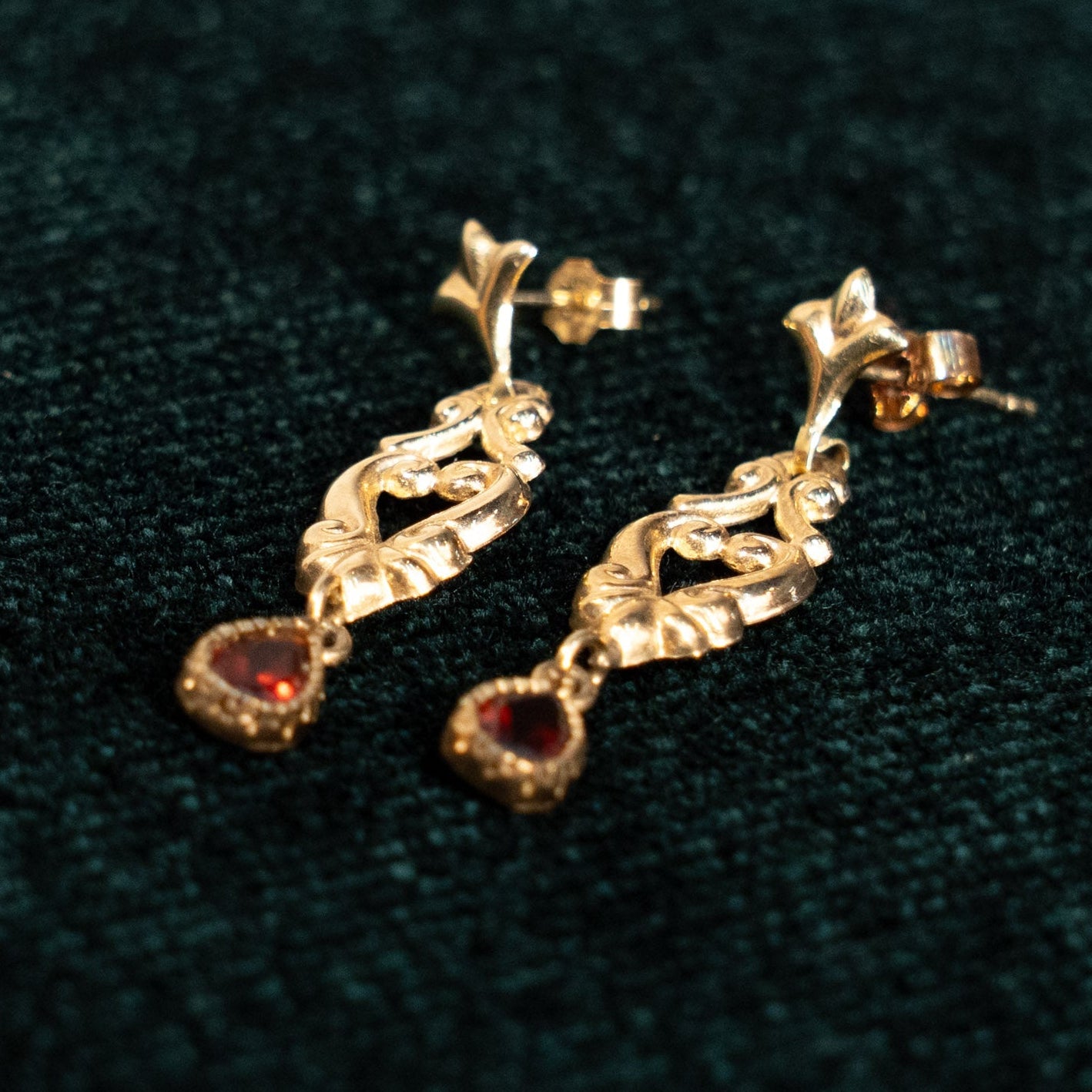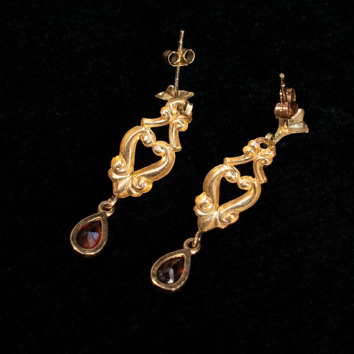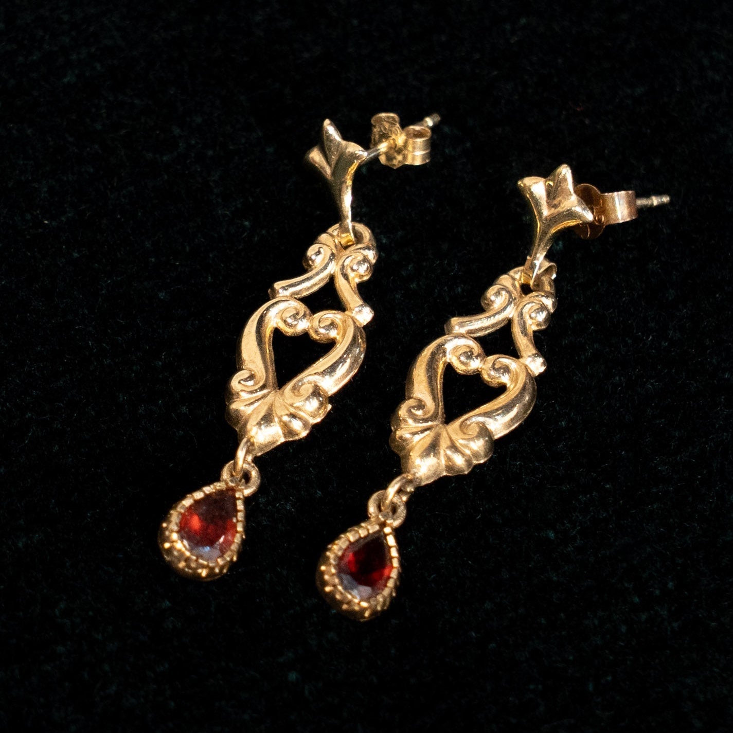 ティアドロップカットのガーネットが耳元で優しく揺れ、格調高い雰囲気をプラス。