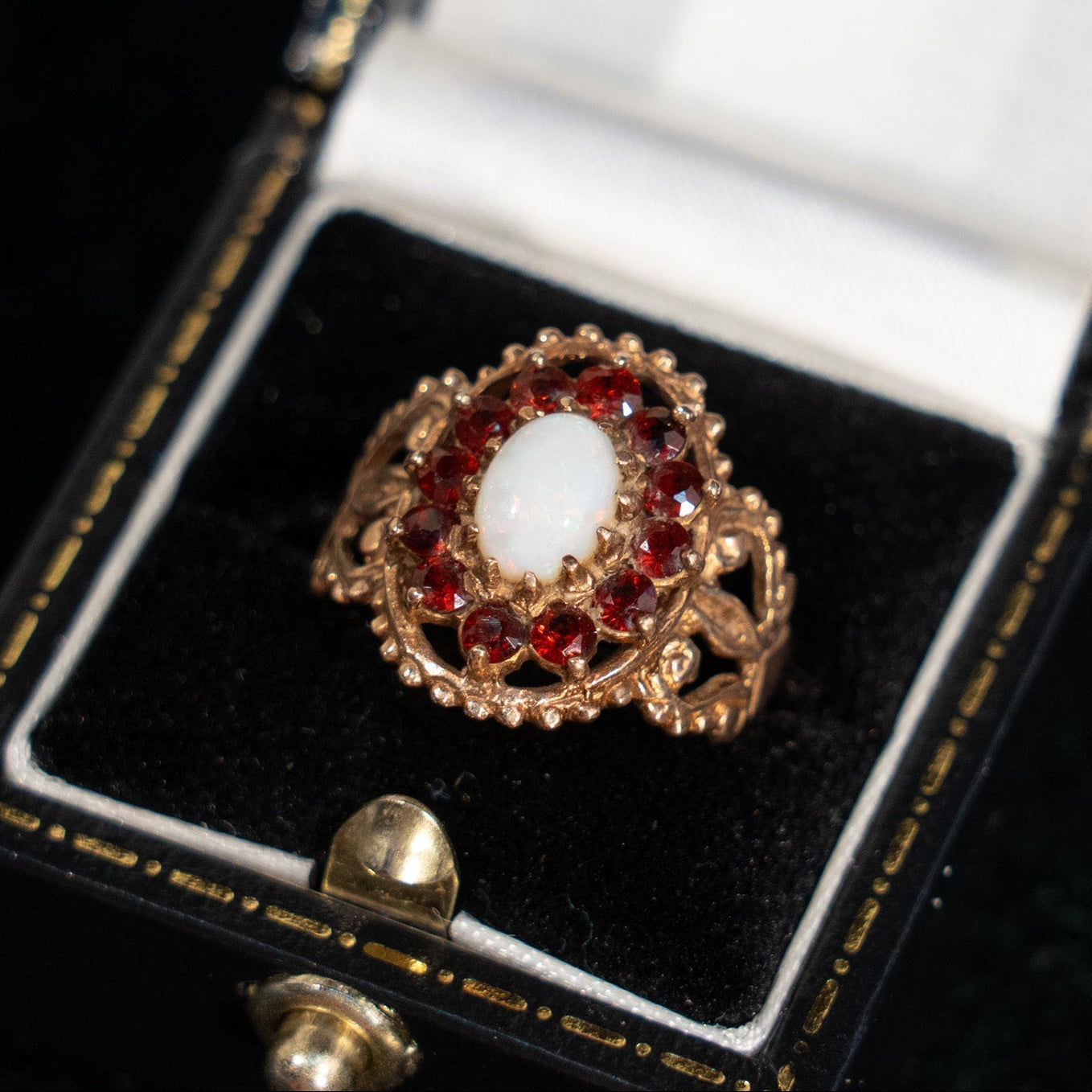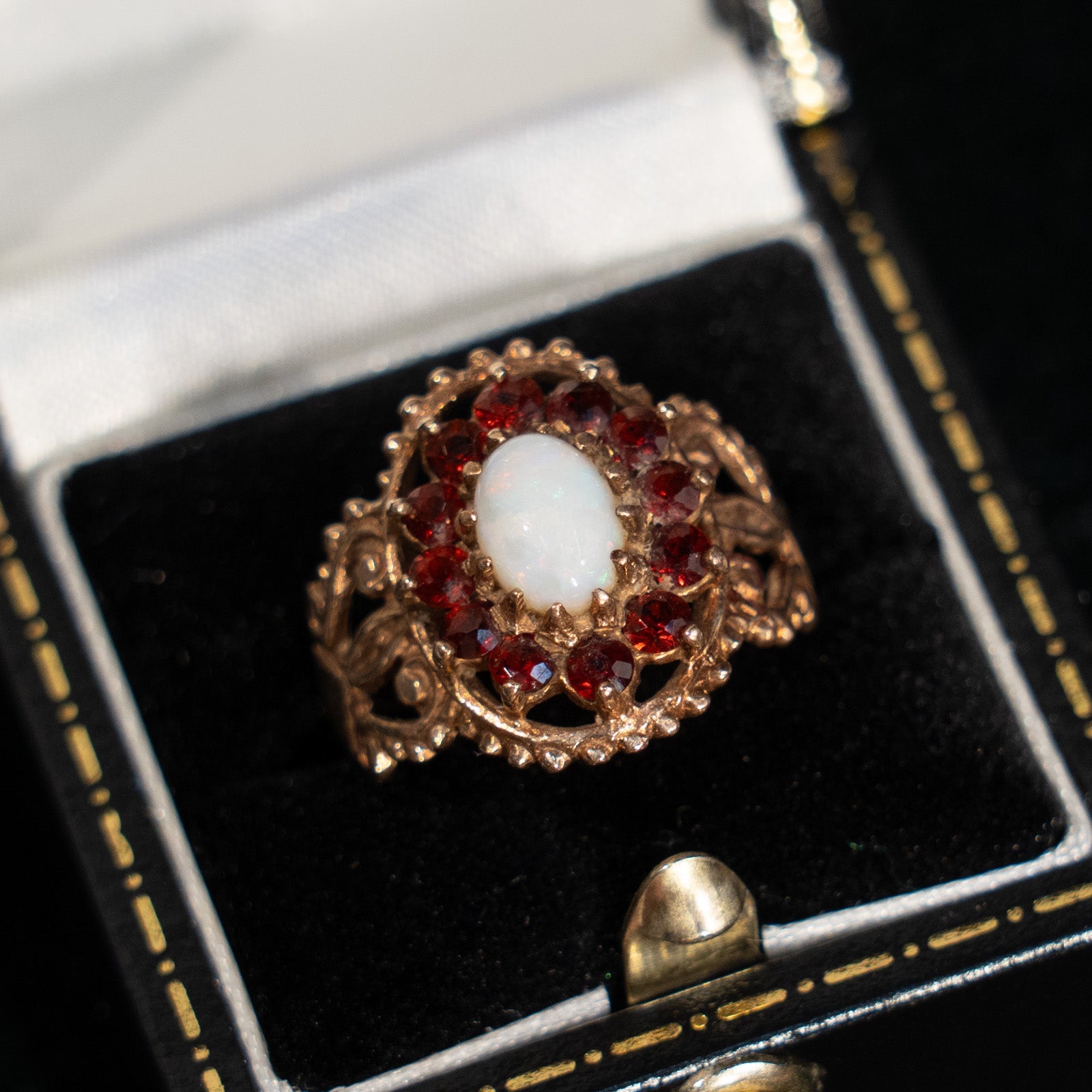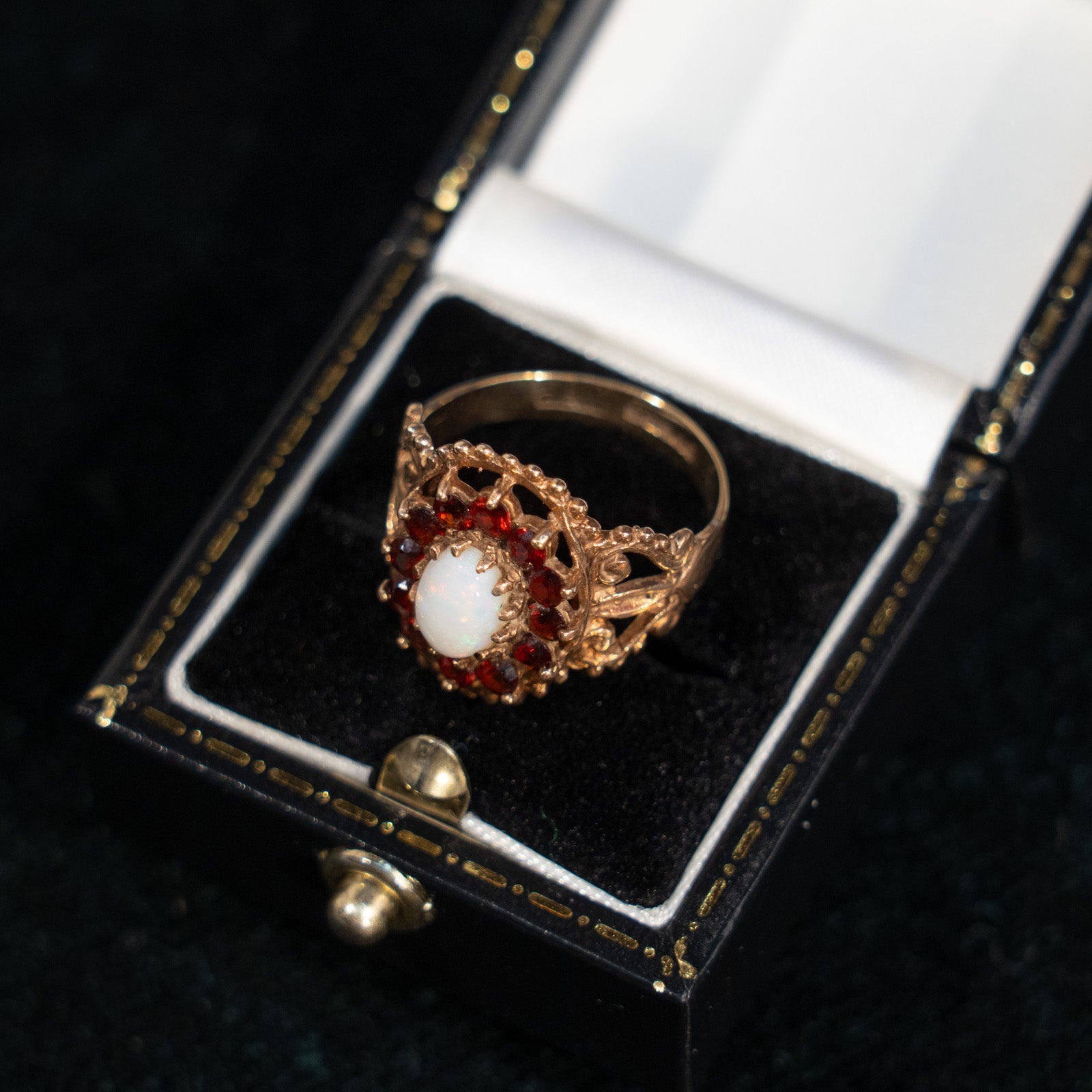 こちらはイギリスから買付けた、虹色に輝くオパールを深紅のガーネットが華やかに囲むクラスターリングです。