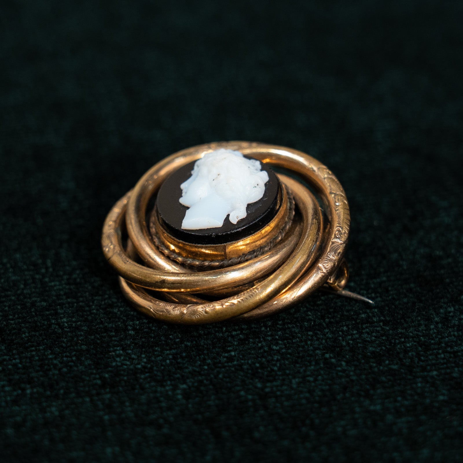ゴールドメッキの優雅な渦巻きデザインのフレームが、上品なカメオを引き立てます。