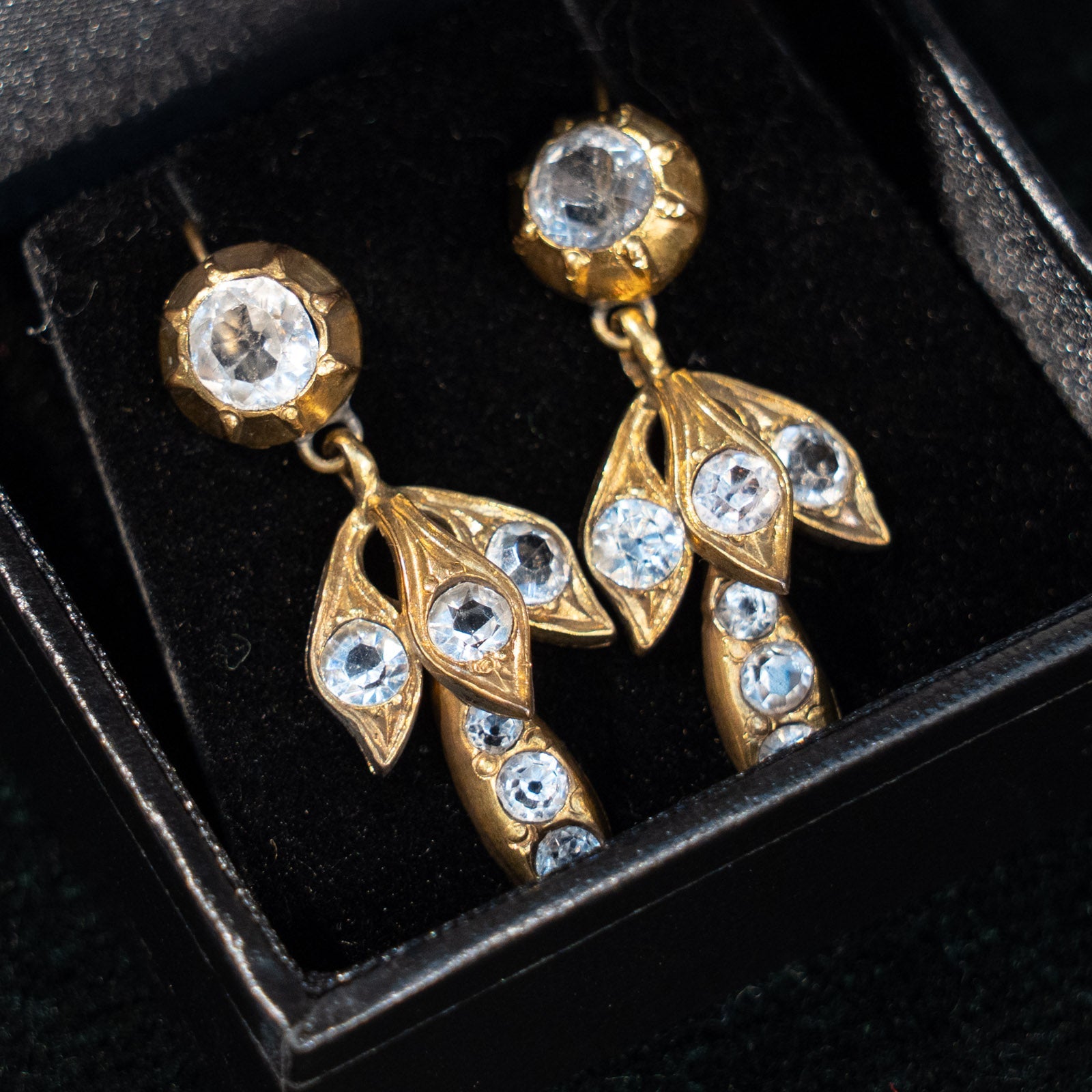 こちらはイギリスから買付けた、葉の様なデザインにクリスタルガラスがあしらわれたダングルピアスです。