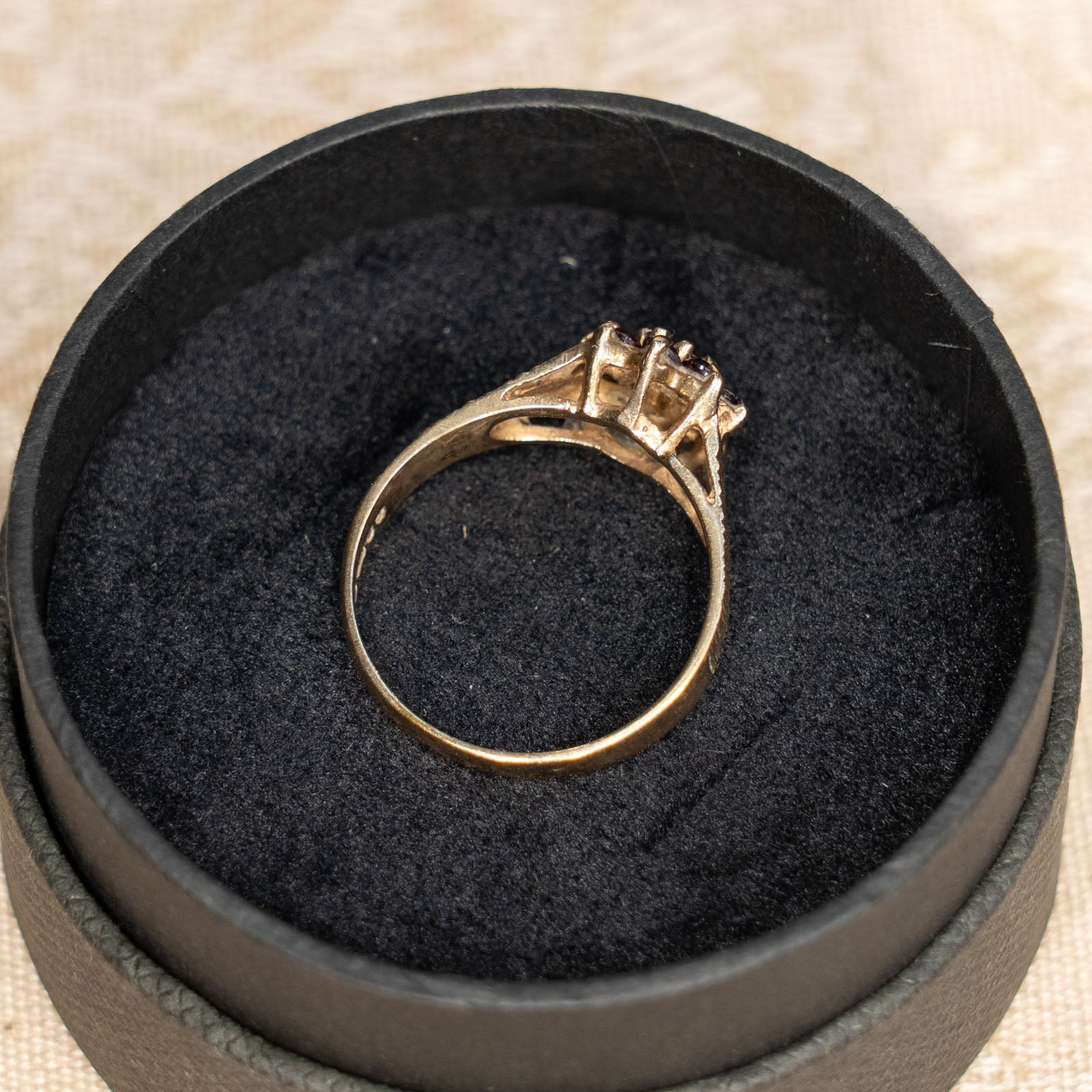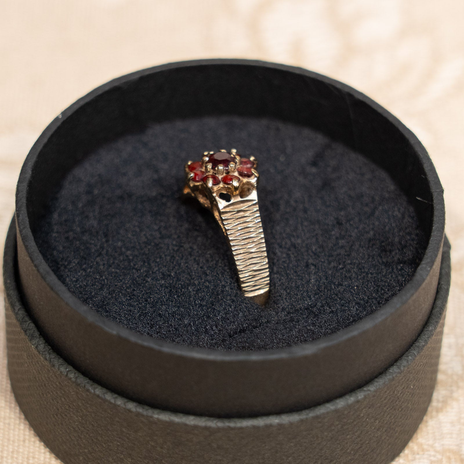 こちらはイギリスから買付けた、深紅に輝くガーネットを花のように配置したクラスターリングです。