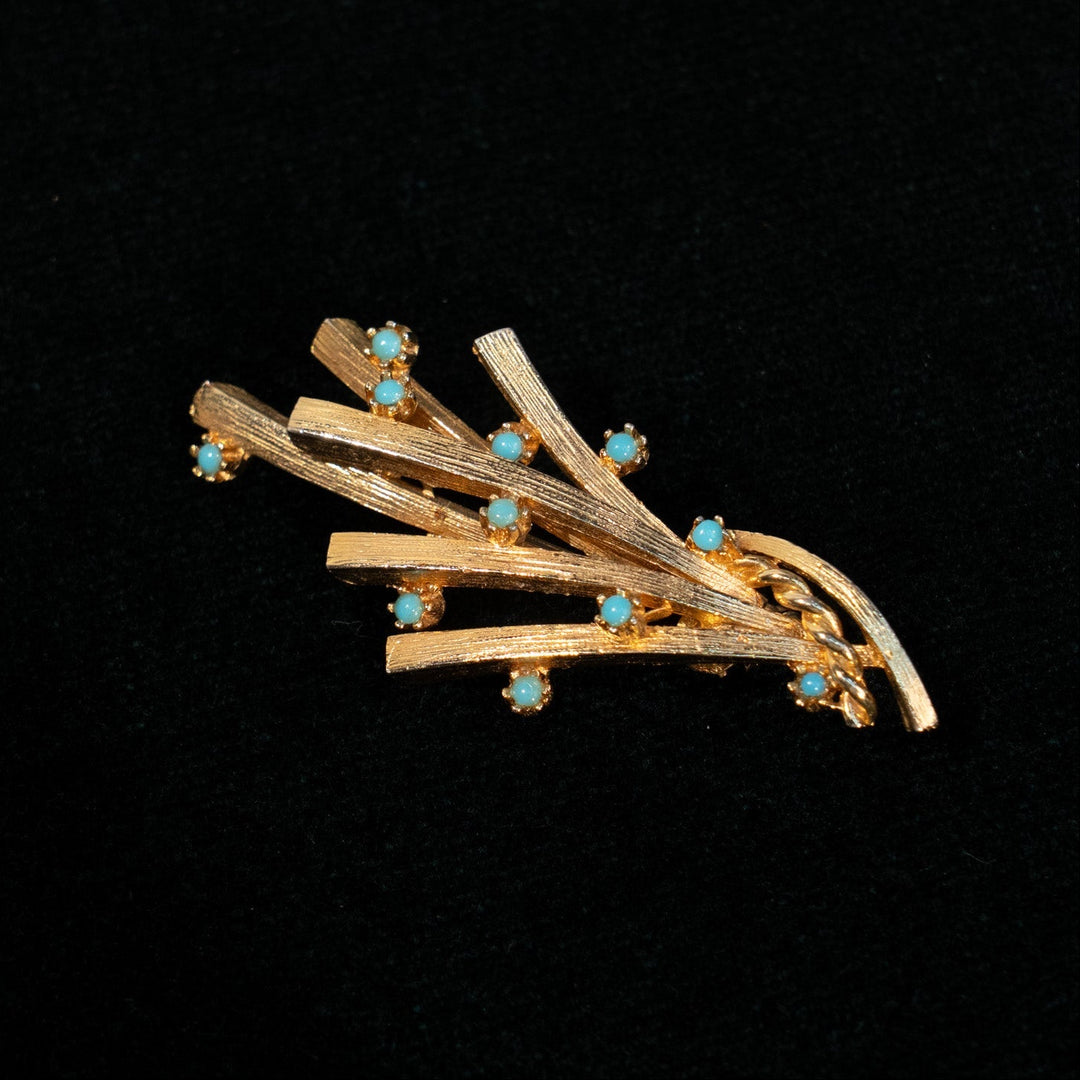 葉を思わせるモダンなデザインにターコイズが散りばめられた ブローチ /23K
