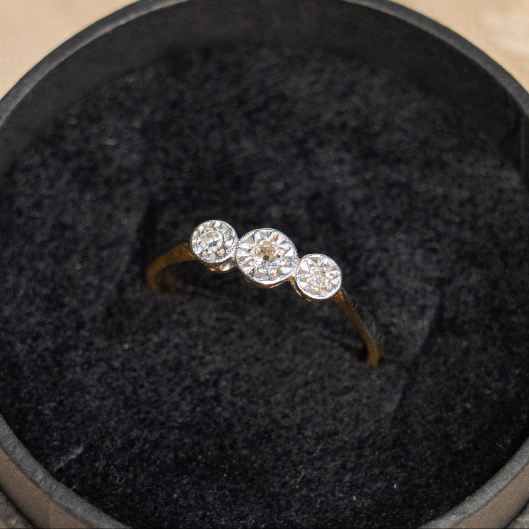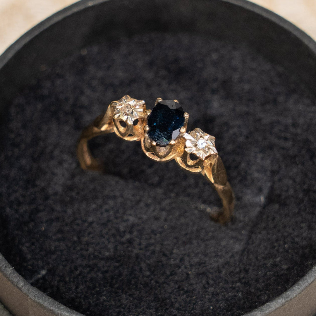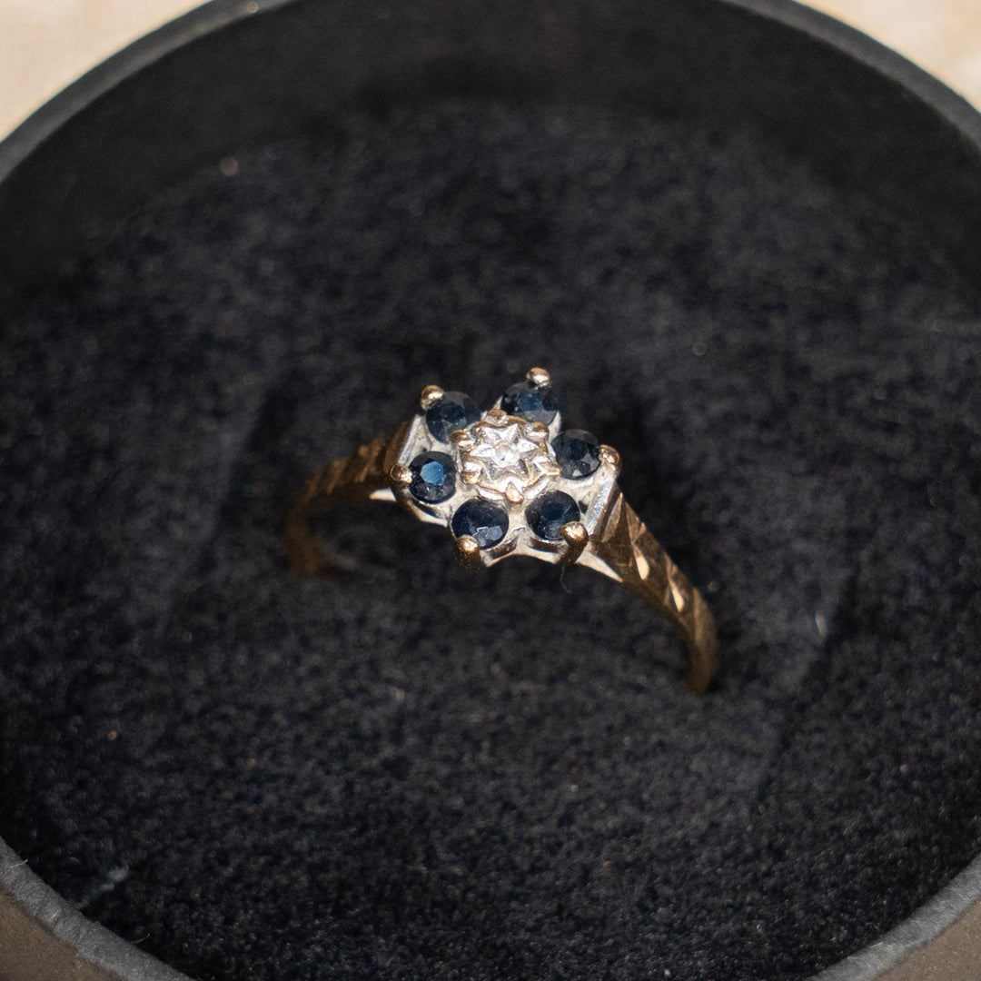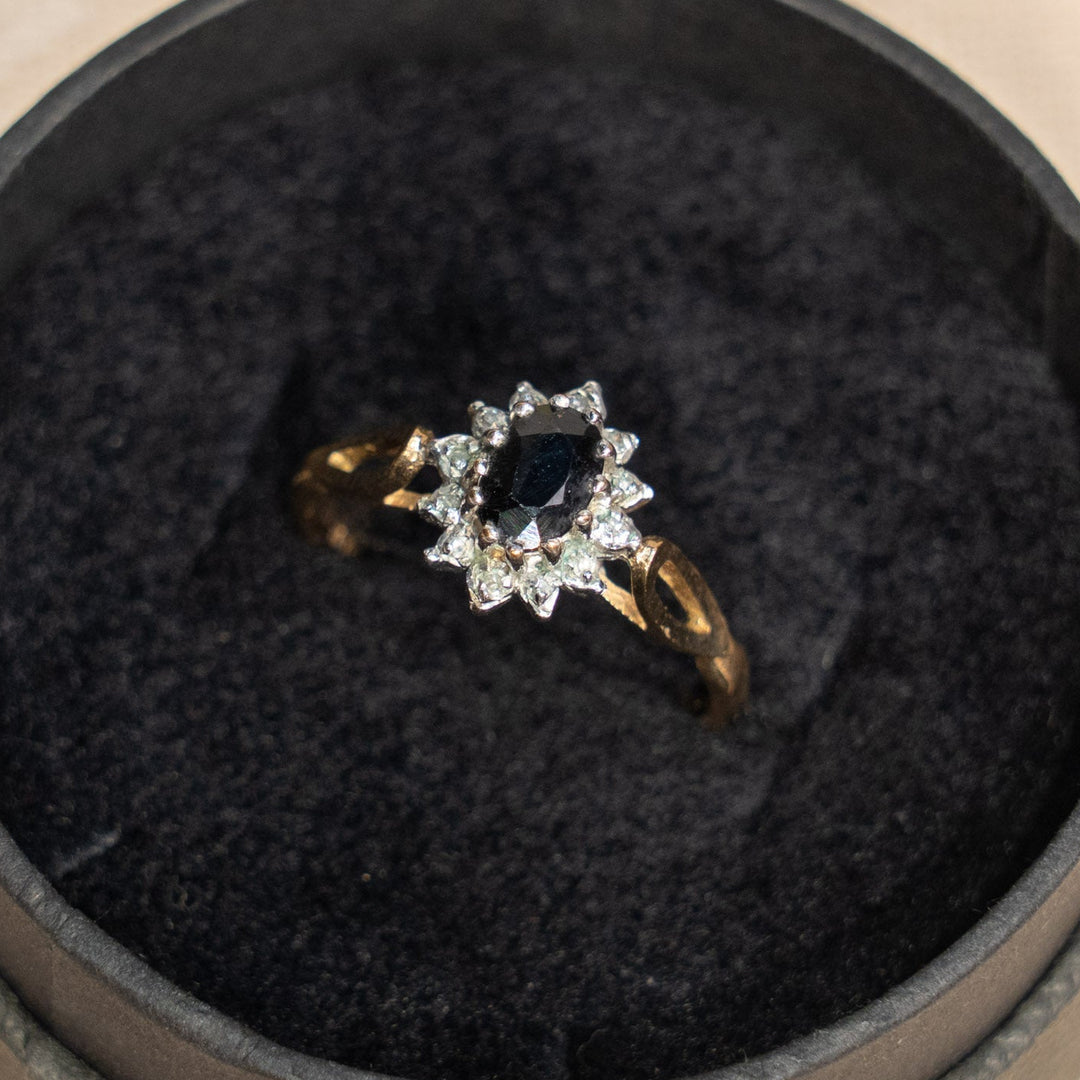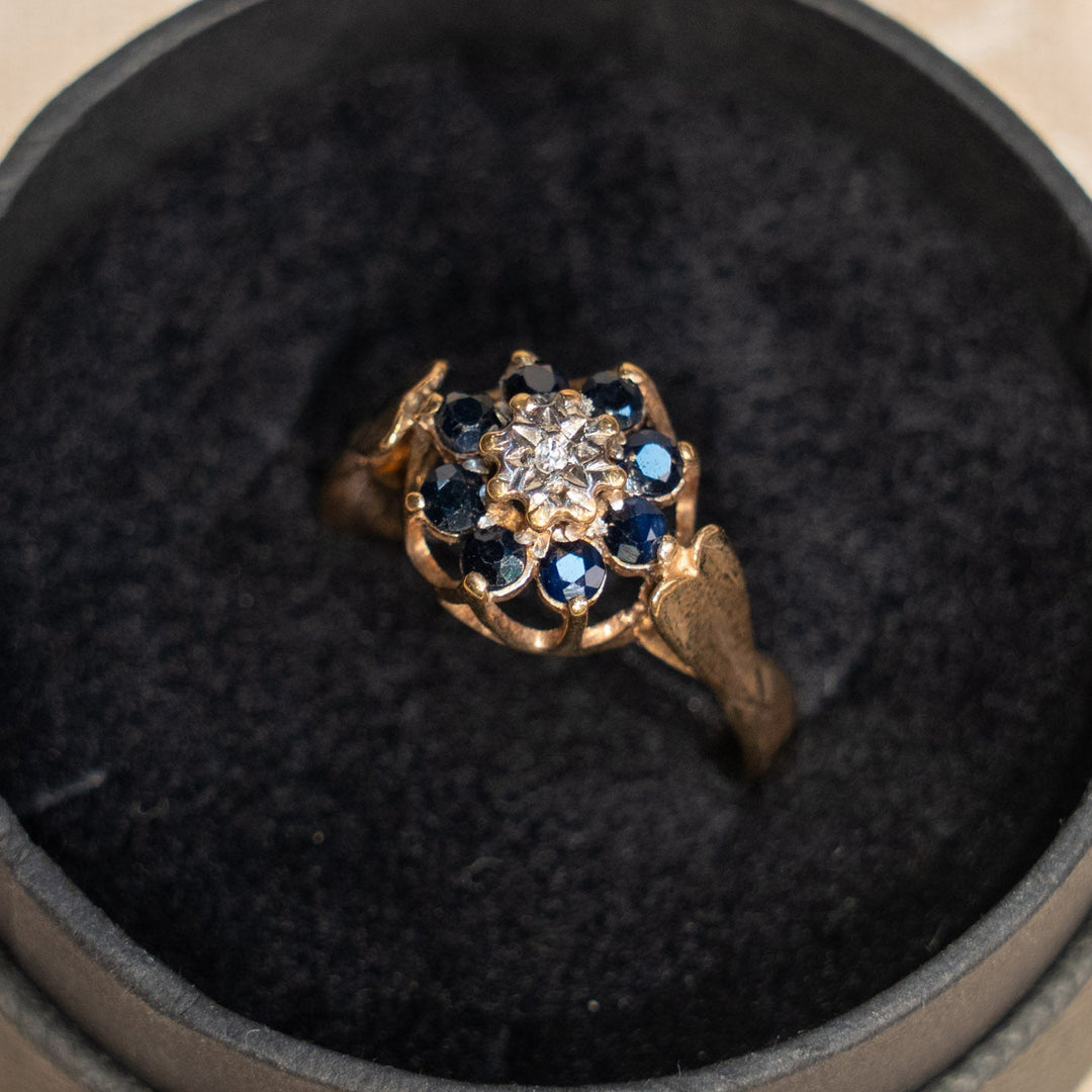 深みのあるサファイアを輝くダイヤモンドが囲う クラスター アンティークリング /25G