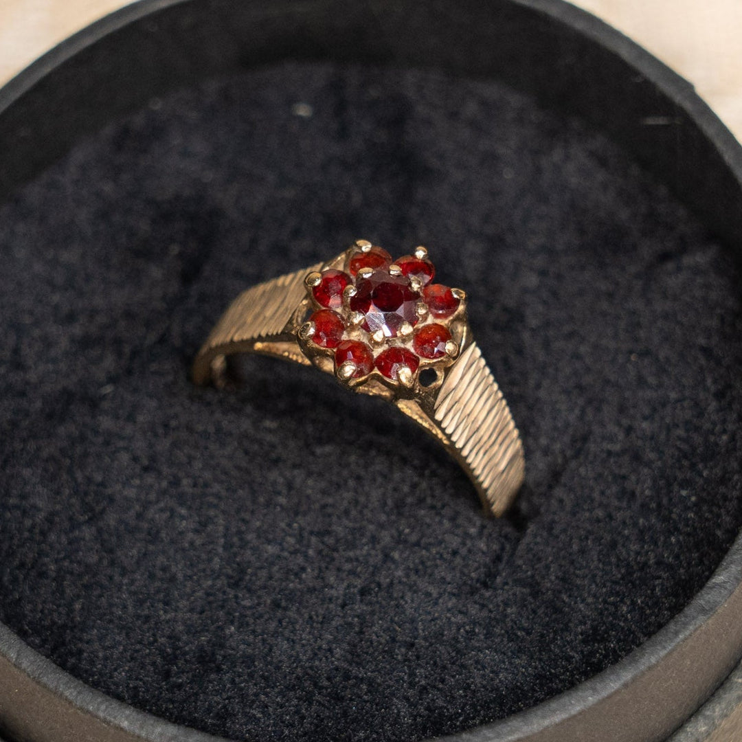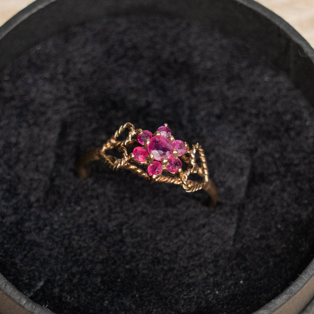 存在感のあるワイドのゴールドシャンクに花のデザインが目を惹く クラスター アンティークリング /25G