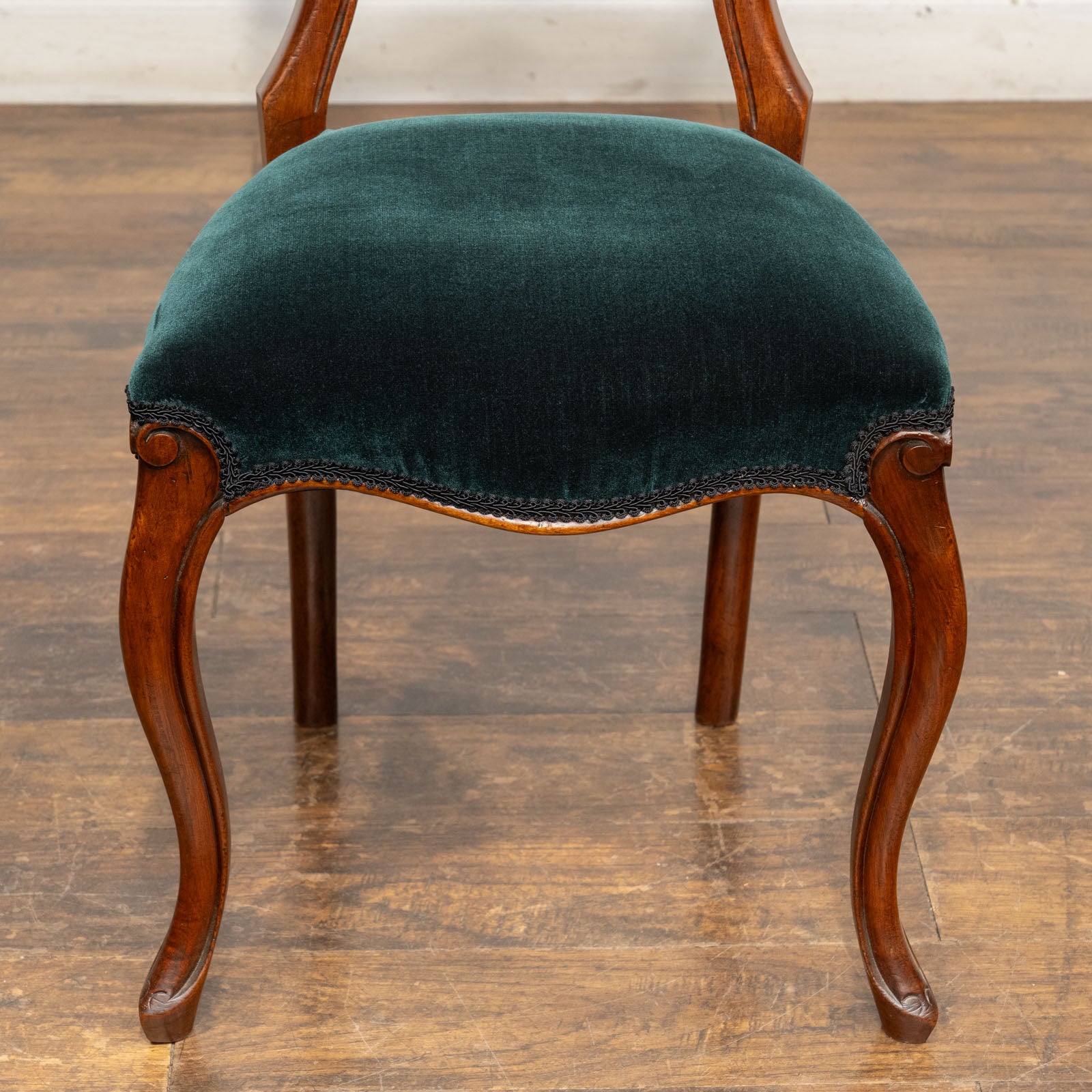 座面はシンプルで高級感のあるグリーンのモケット生地で張り替えており、曲線美のカブリオールレッグや風船のように丸く造られた上品なバルーンバックのデザインとマッチしています。
