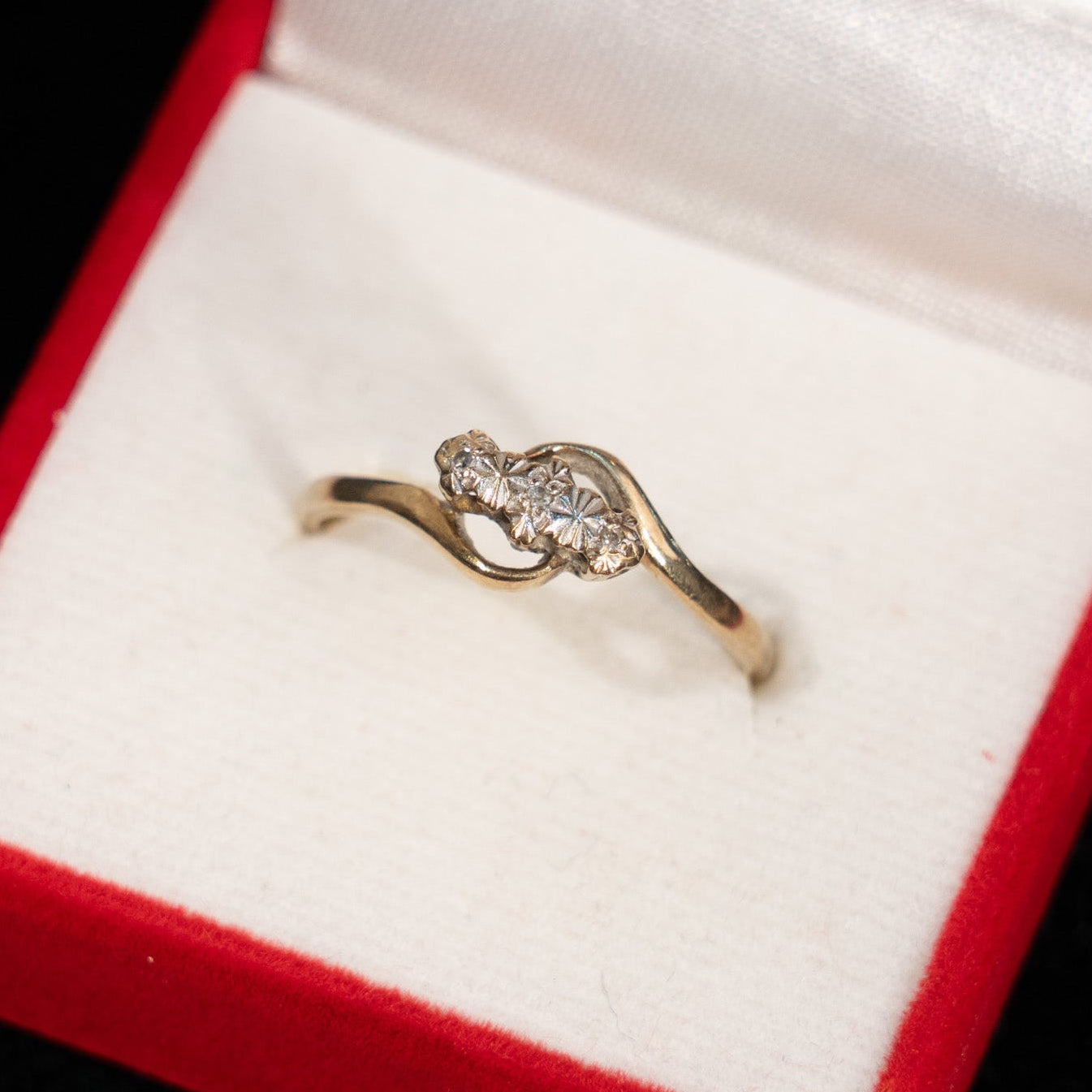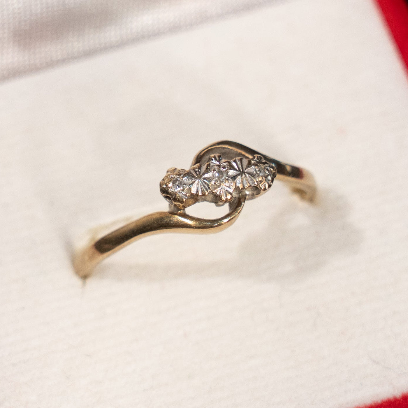 こちらはイギリスから買付けた、ダイヤモンドを優しく包み込むようなエレガントなデザインが魅力のアンティークリングです。