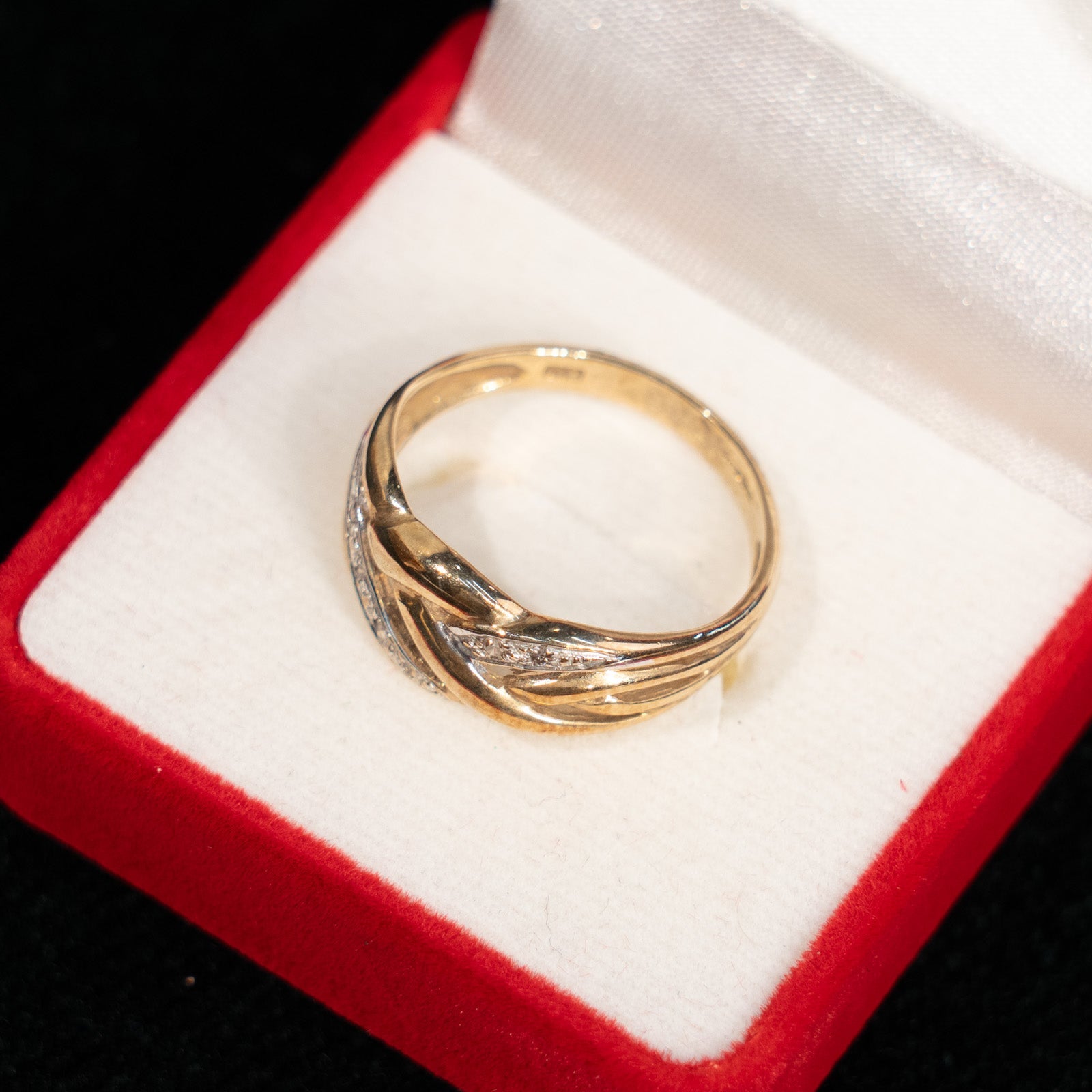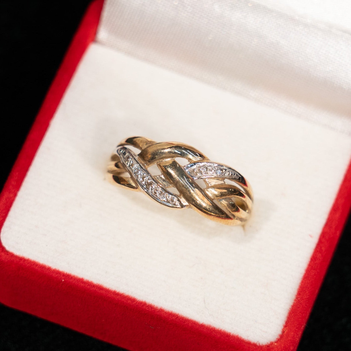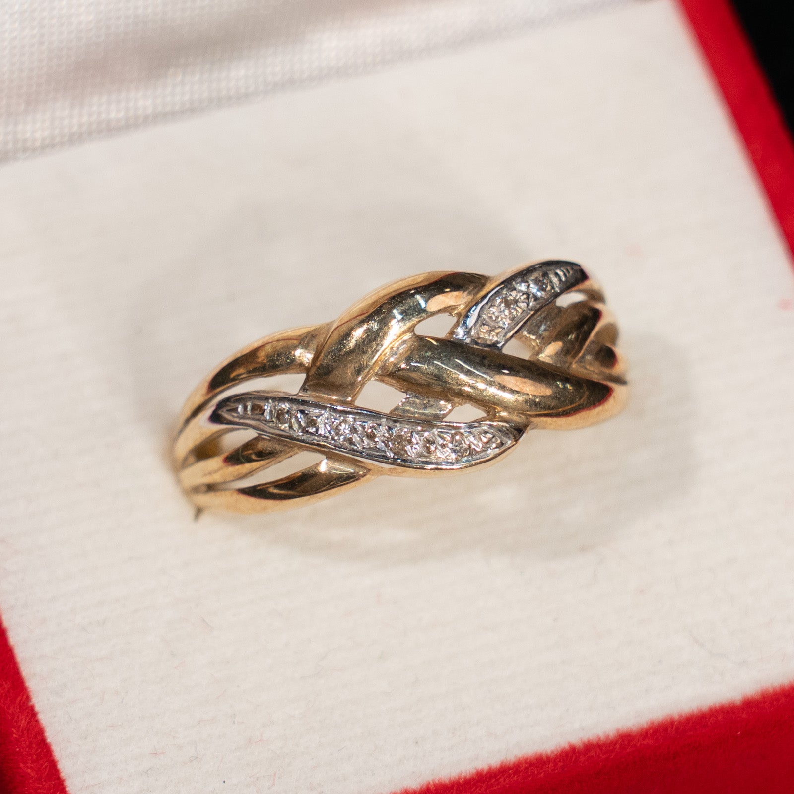 こちらはイギリスから買付けた、交差する編み込みデザインが特徴のアンティークリングです。