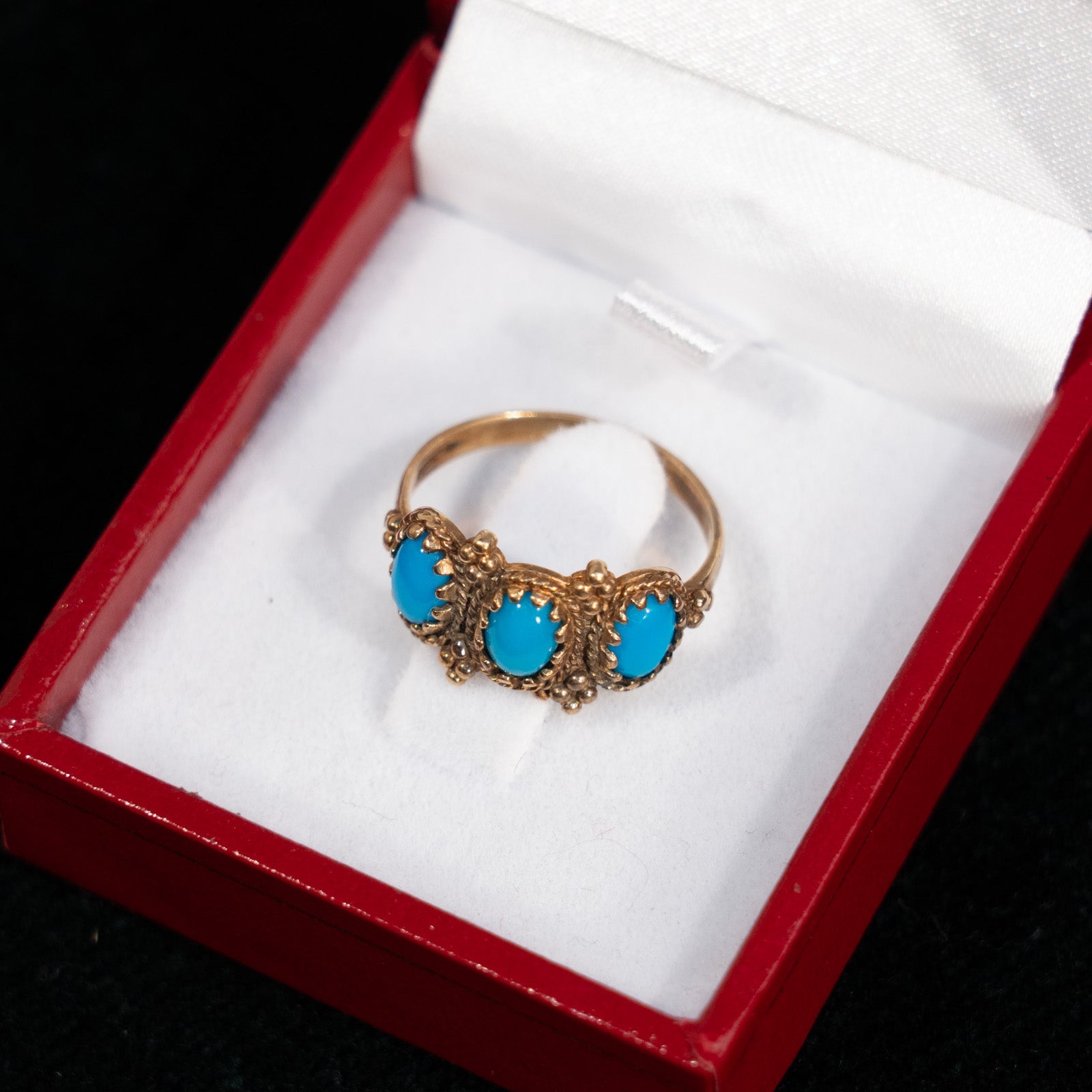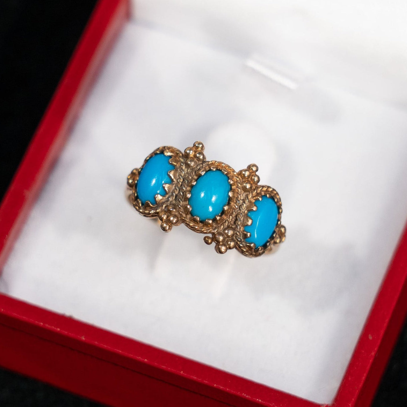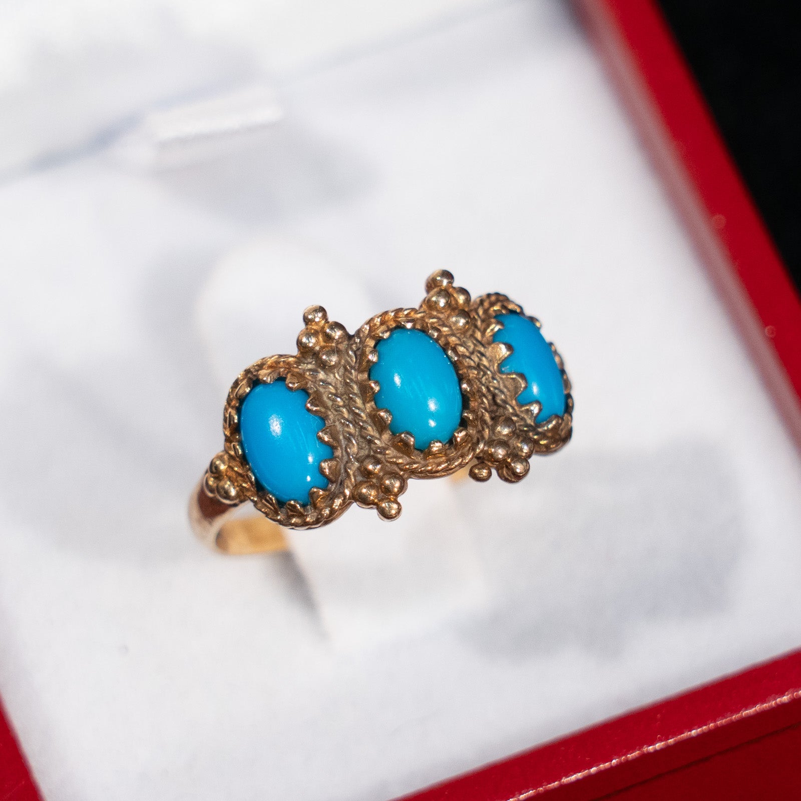 こちらはイギリスから買付けた、ターコイズが三つ並んだトリロジーデザインのアンティークリングです。
