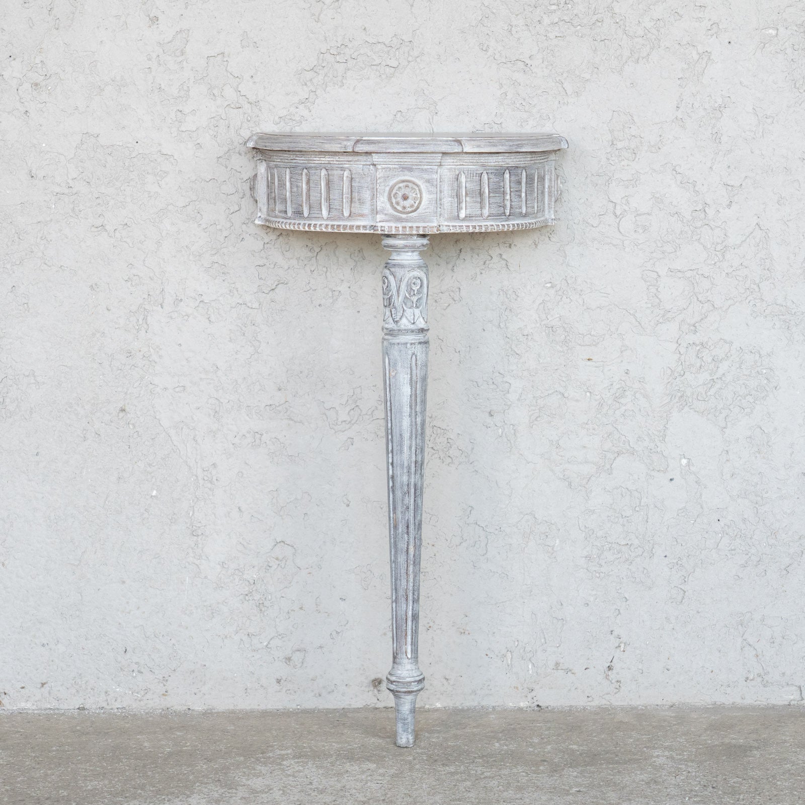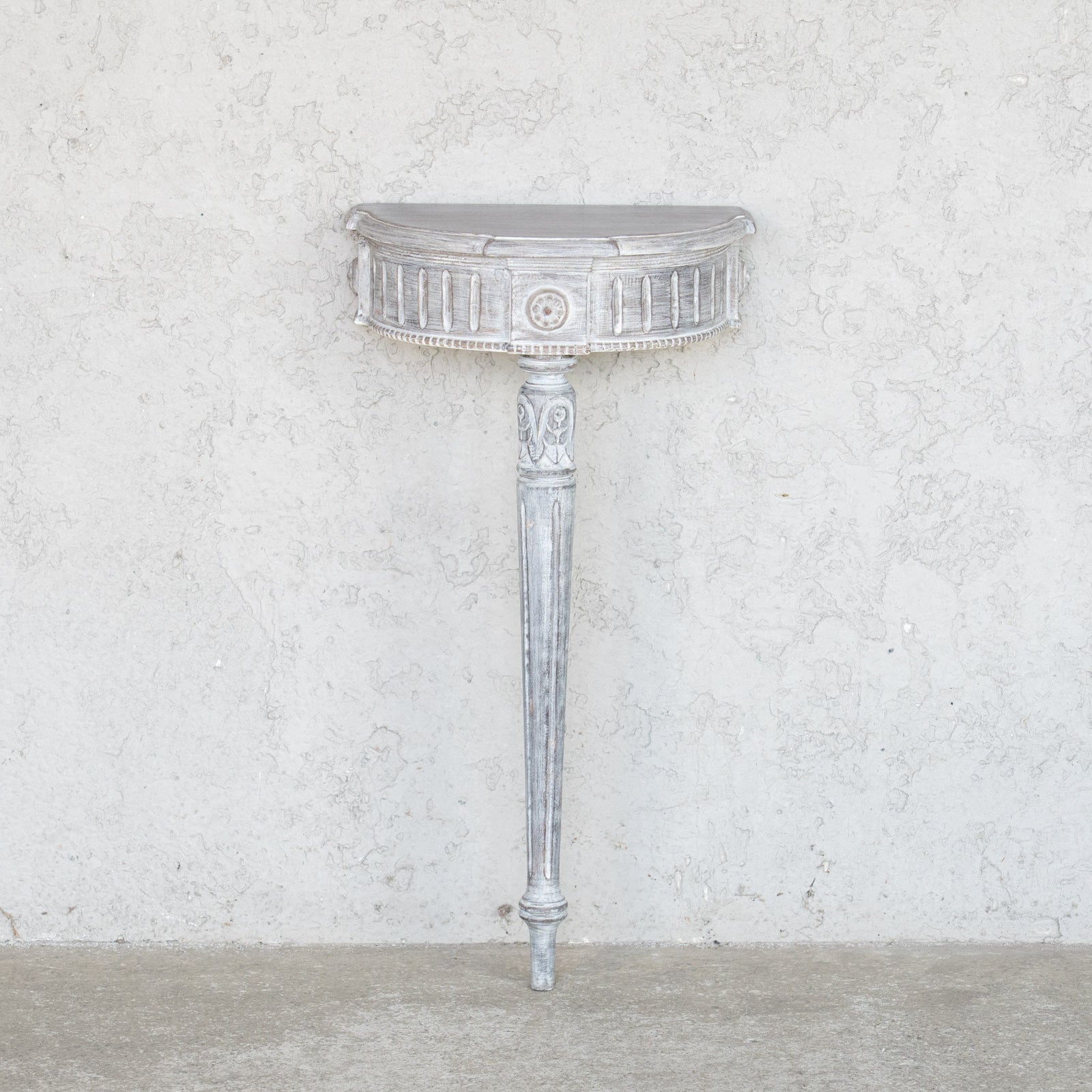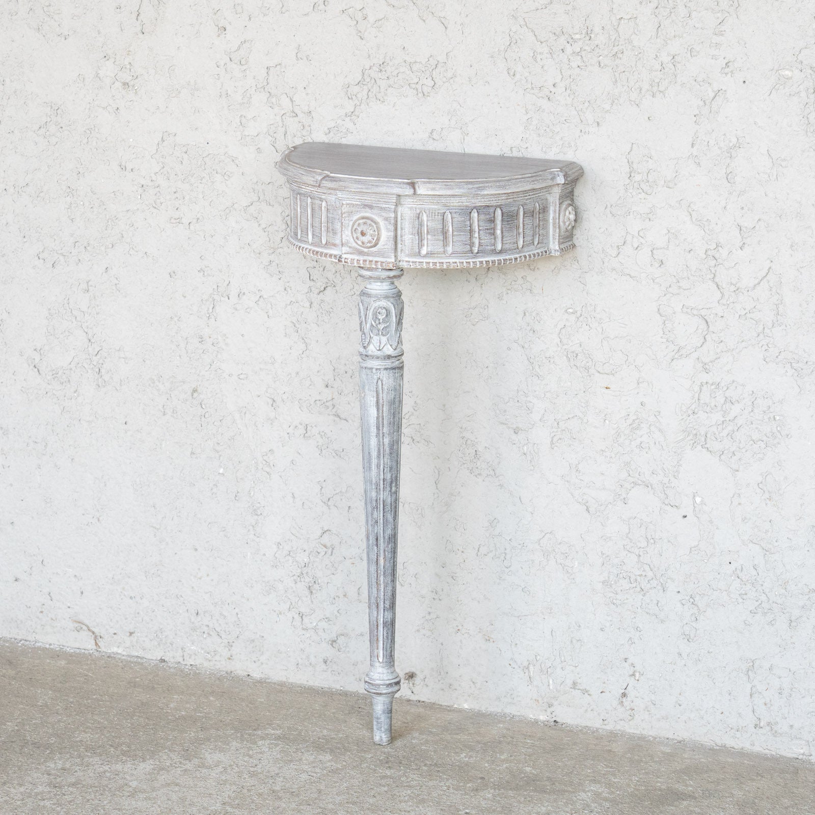 ホワイトグレーのペイントにエイジング加工を施し、シャビーシックなスタイルに仕上げたアンティーク調コンソールテーブルです。すらりとした縦溝装飾の1本脚が支えており、壁面に固定して使用するタイプです。置くだけで壁面を華やかにしてくれるコンソールテーブルは、玄関先やリビングなどお家で使うのはもちろん、お店の什器などにもおすすめです。