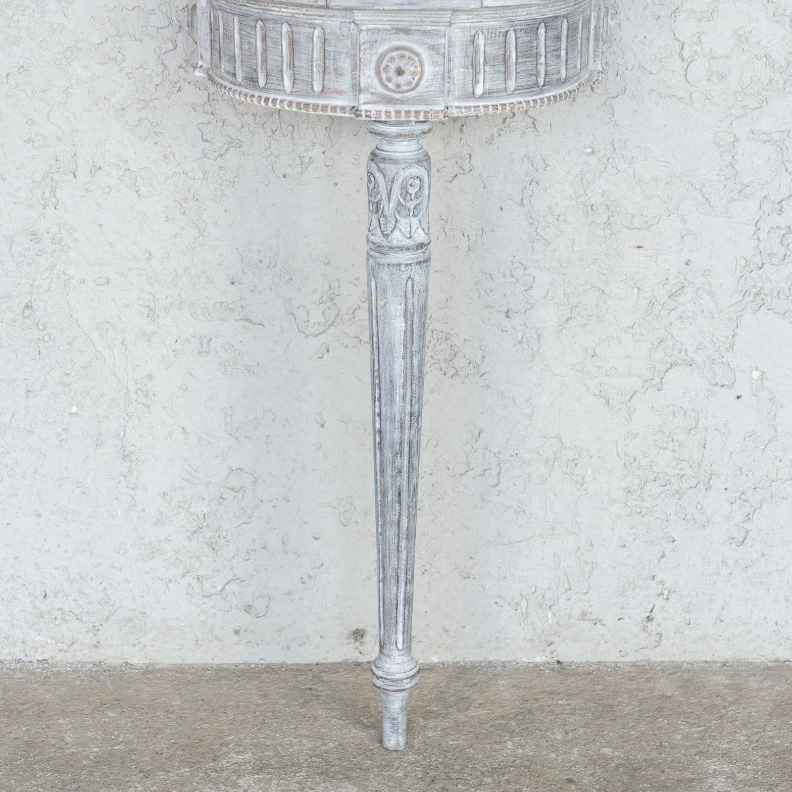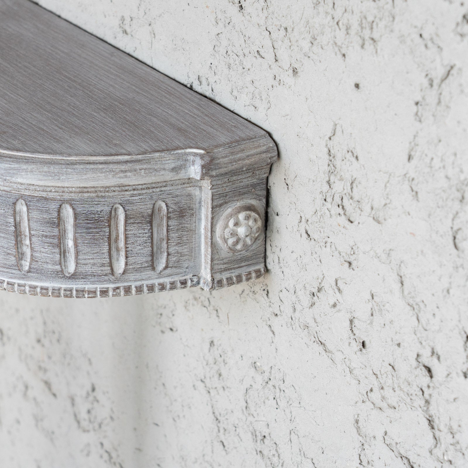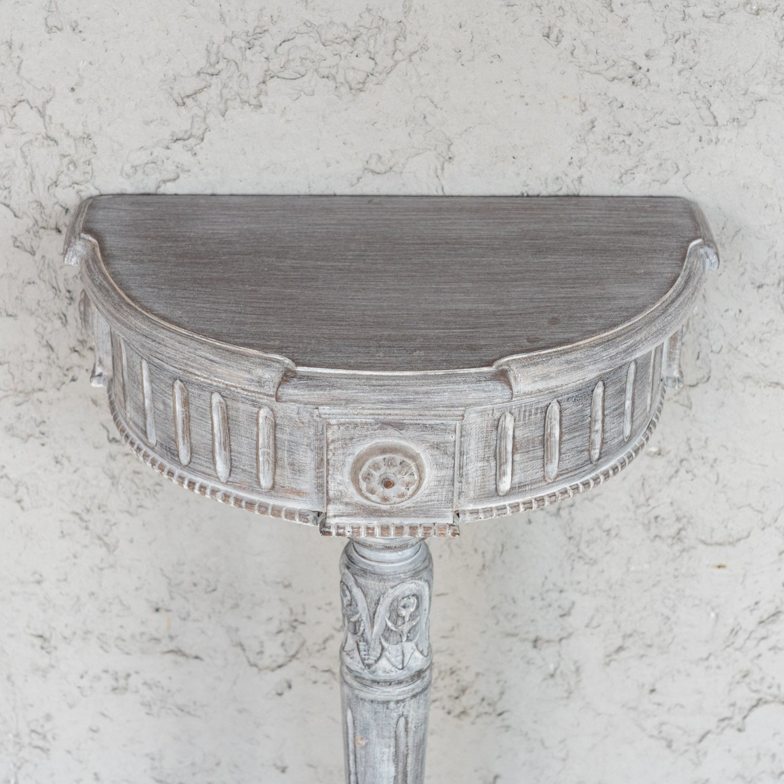 ホワイトグレーのペイントにエイジング加工を施し、シャビーシックなスタイルに仕上げたアンティーク調コンソールテーブルです。すらりとした縦溝装飾の1本脚が支えており、壁面に固定して使用するタイプです。置くだけで壁面を華やかにしてくれるコンソールテーブルは、玄関先やリビングなどお家で使うのはもちろん、お店の什器などにもおすすめです。