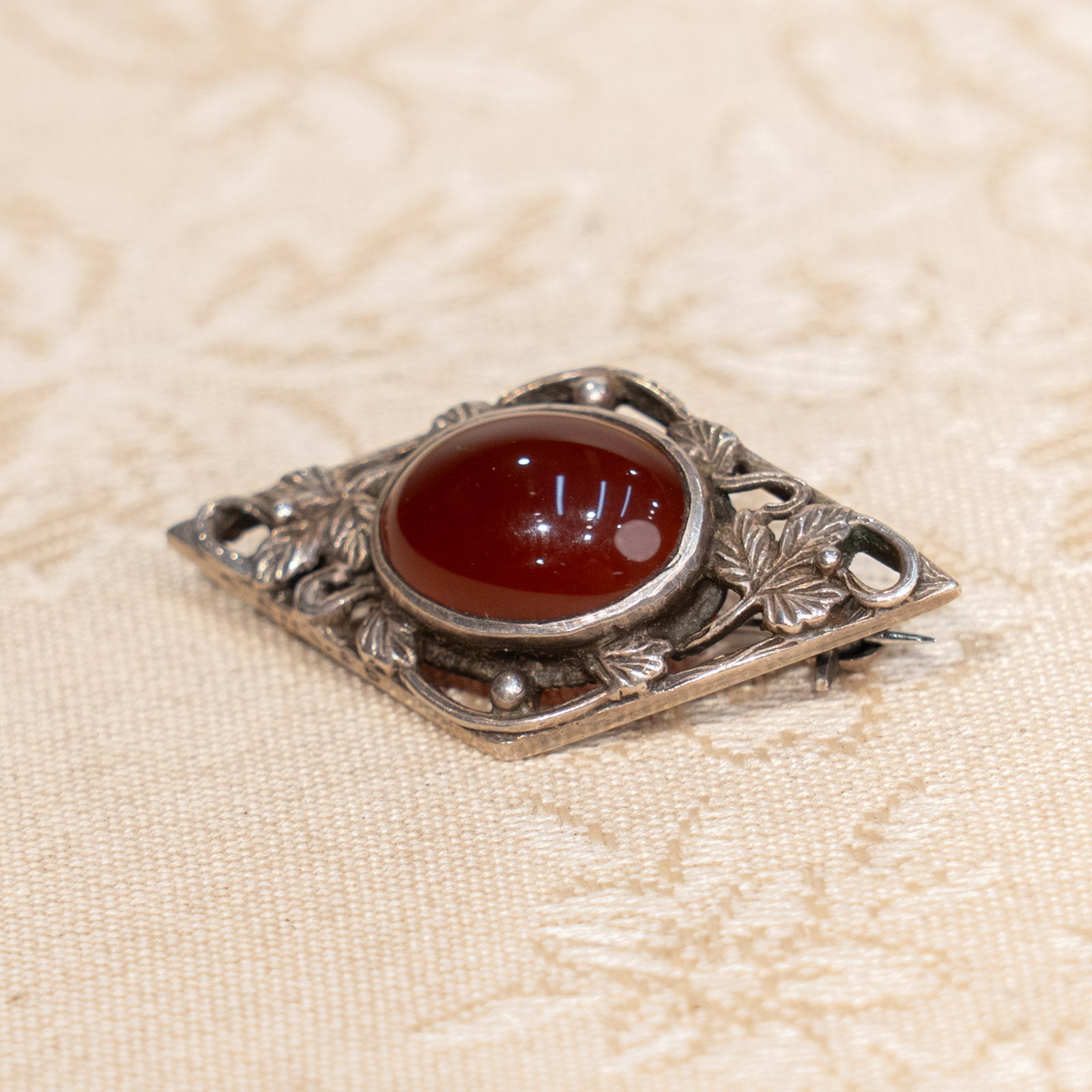 こちらはイギリスから買付けた、菱形のエレガントなフレームに温かみのある赤褐色のカーネリアンが輝くアンティークブローチです。