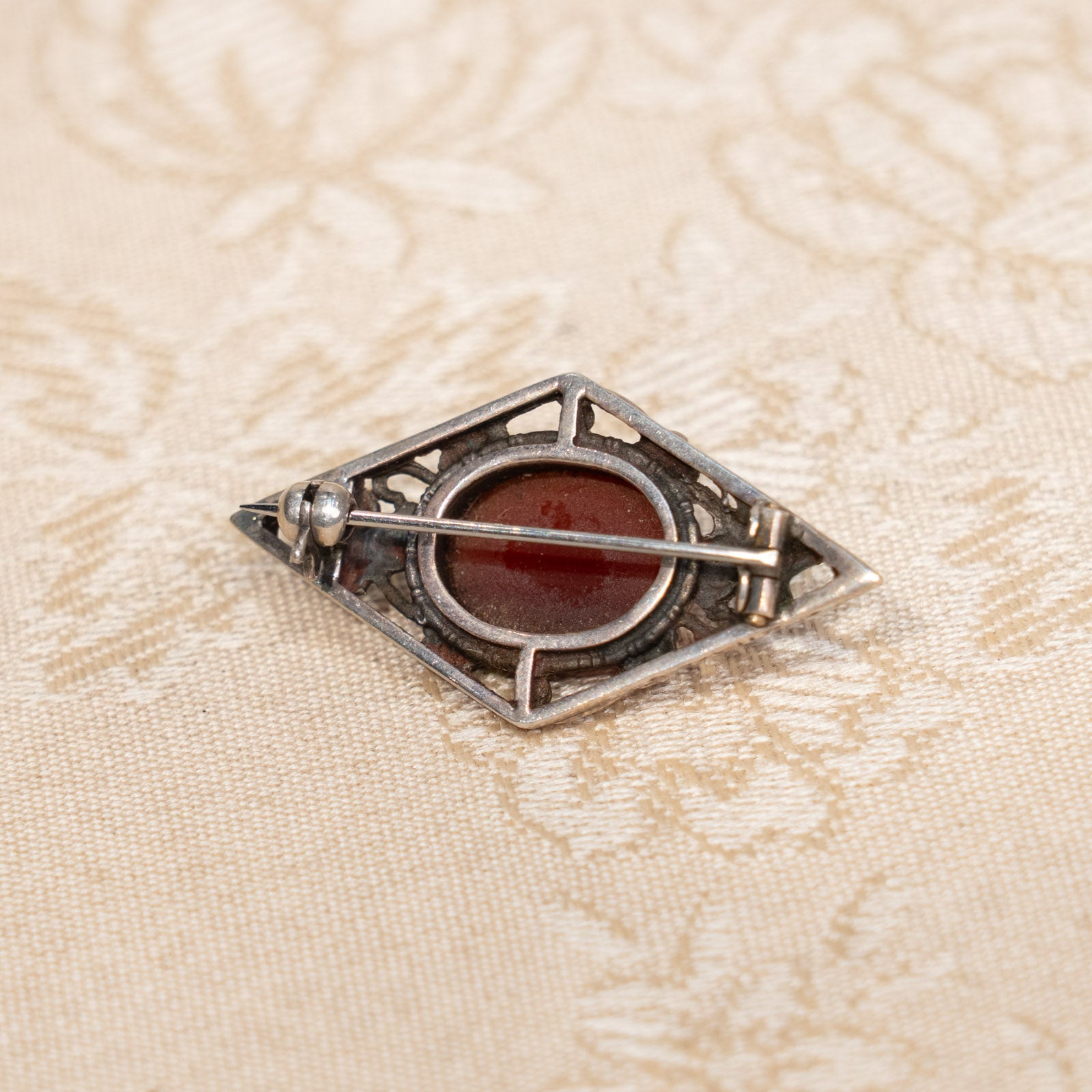 菱形の洗練されたフレームに赤褐色の石が美しい カーネリアン アンティークブローチ /25G