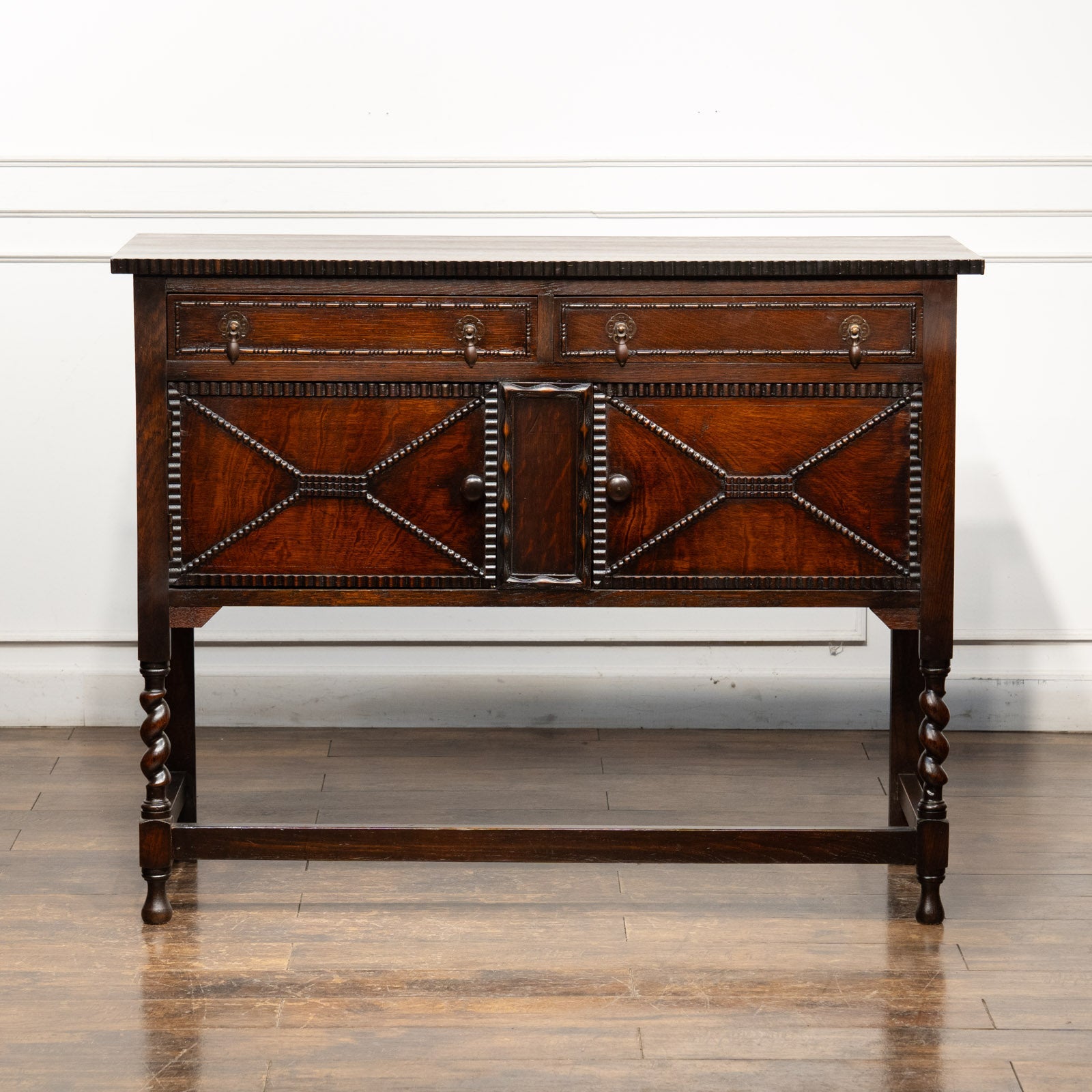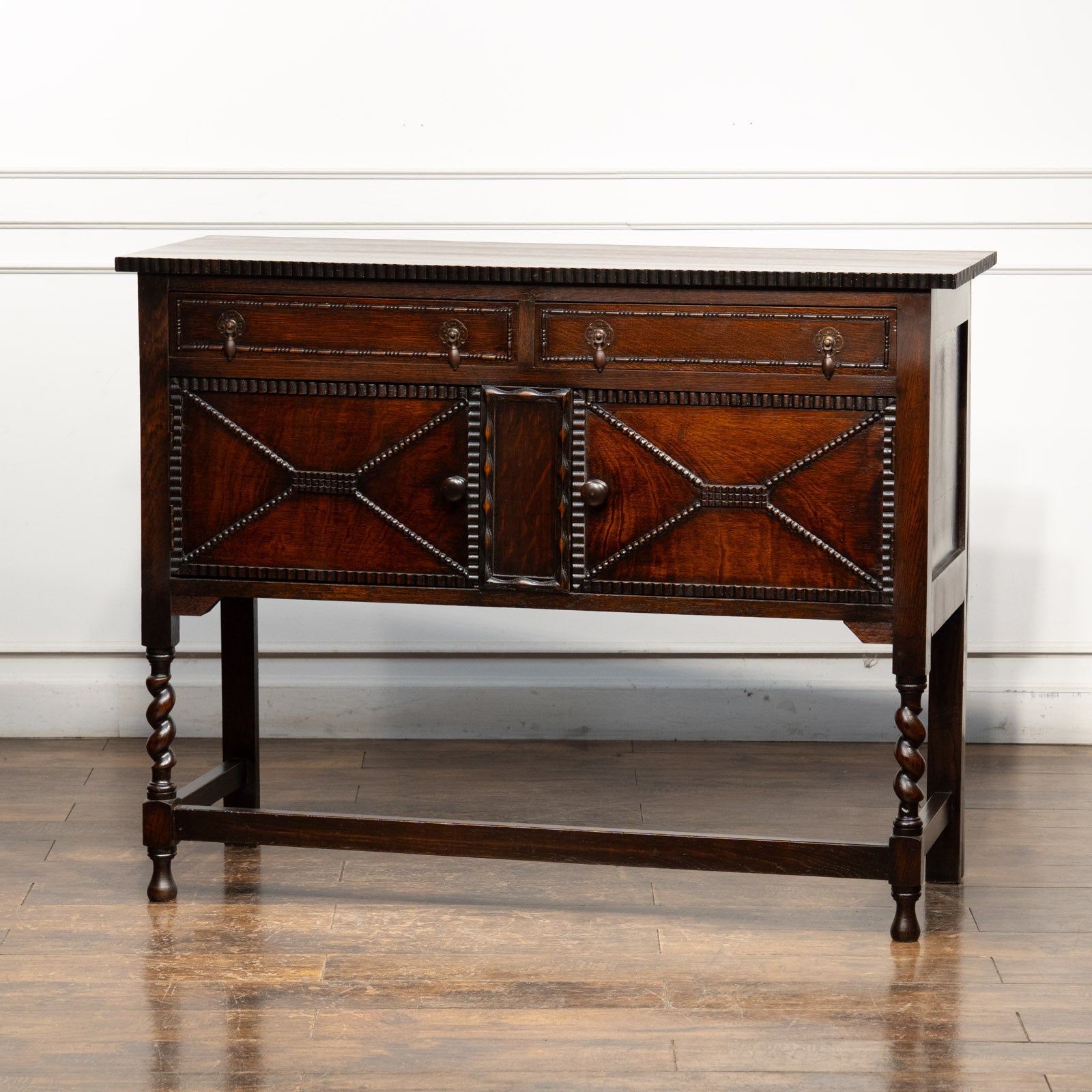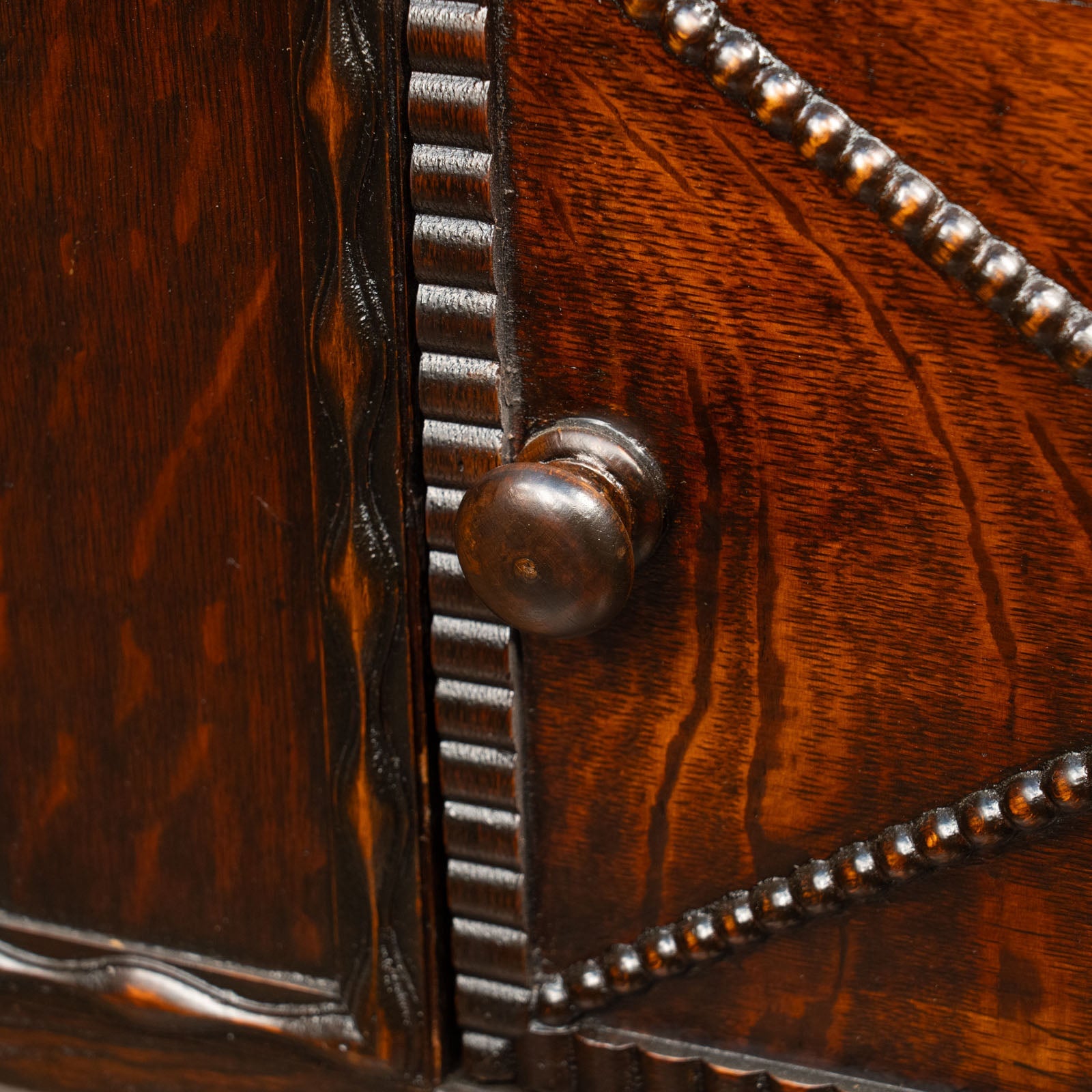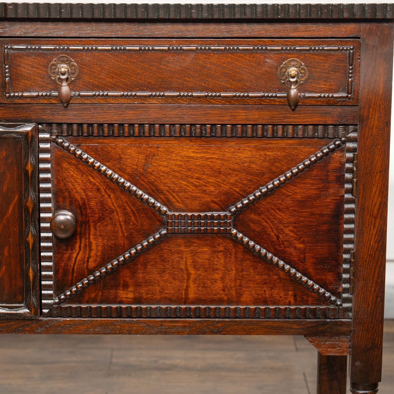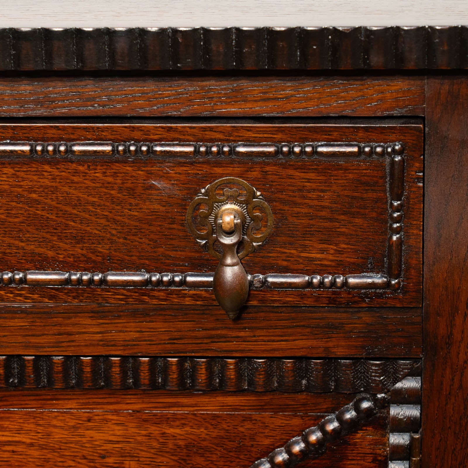 かっちりしたフォルムに扉や引き出しに施された細かな装飾が印象的。