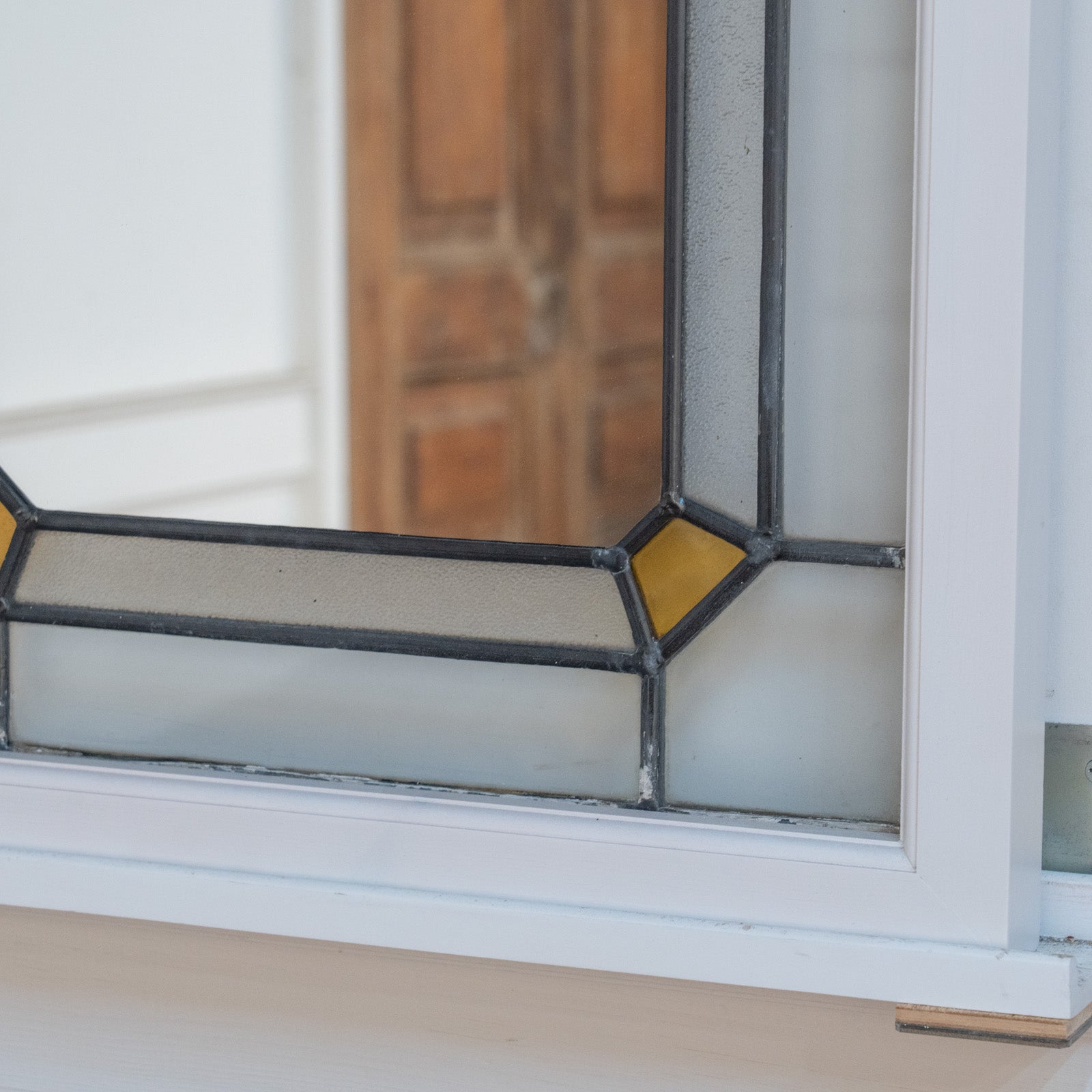 こちらは趣のあるステンドグラスにミラーを取り付け、リメイクしたエントランスミラーです。