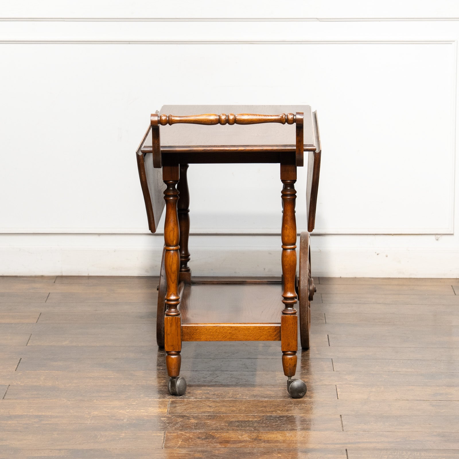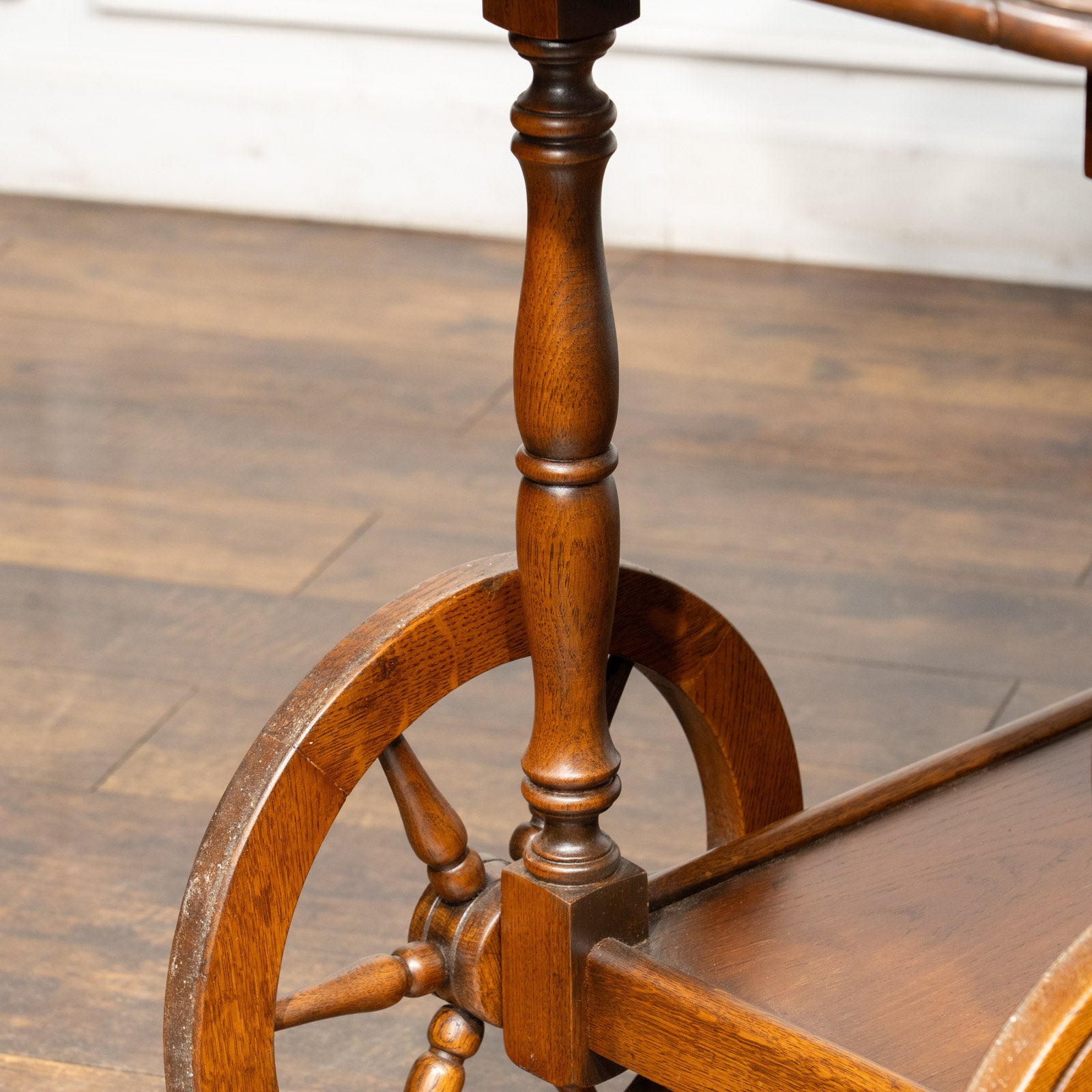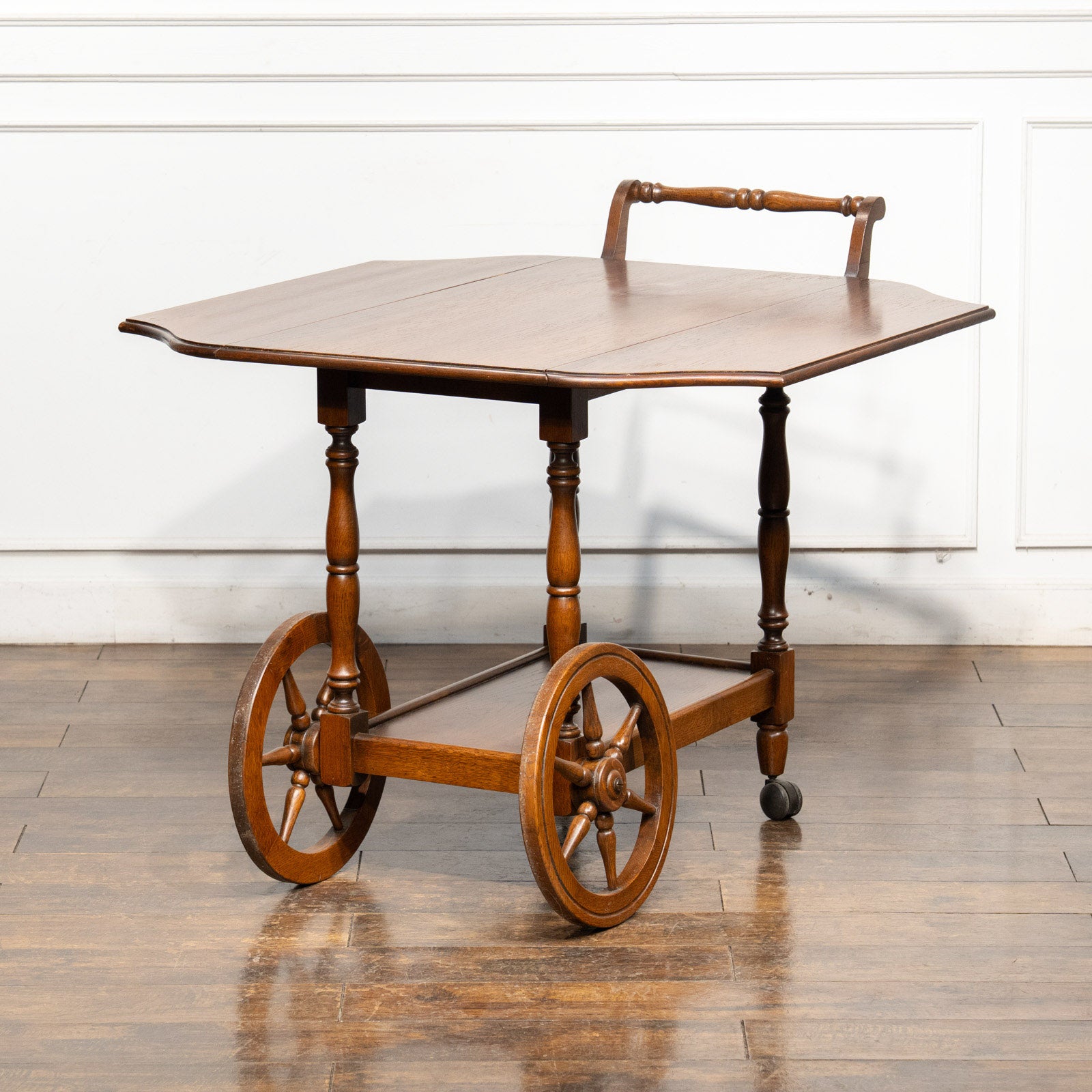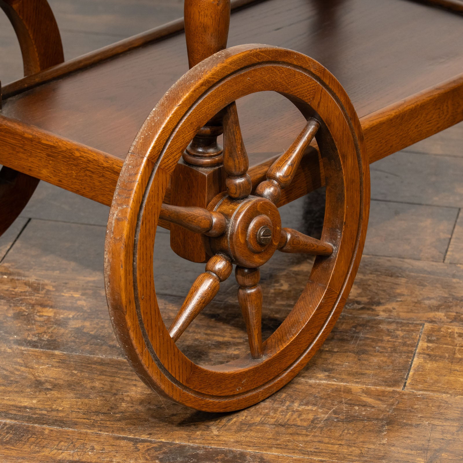 大きなウッドホイールとキャスターが組み合わさった、クラシカルでありながら遊び心のあるデザインのティートローリーです。