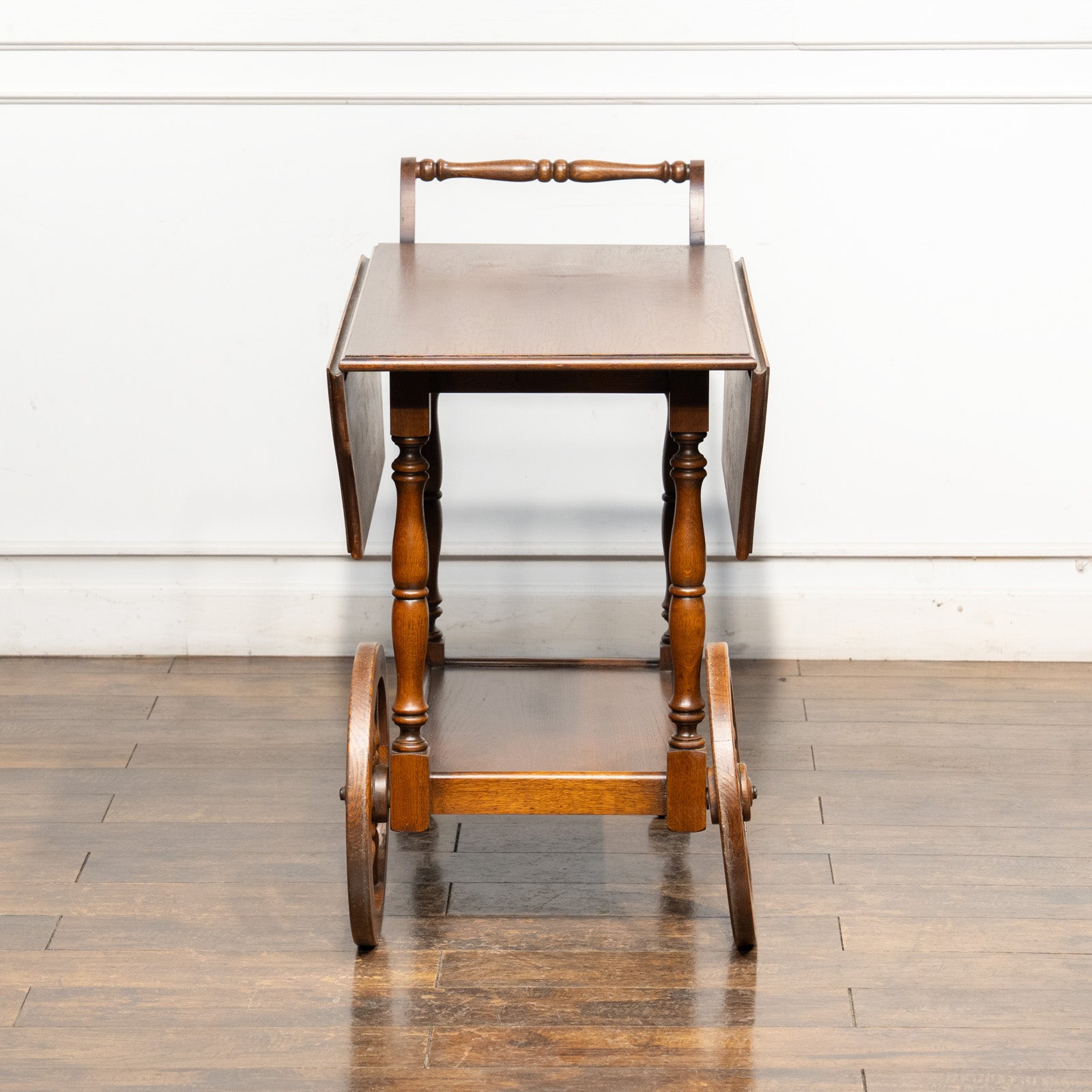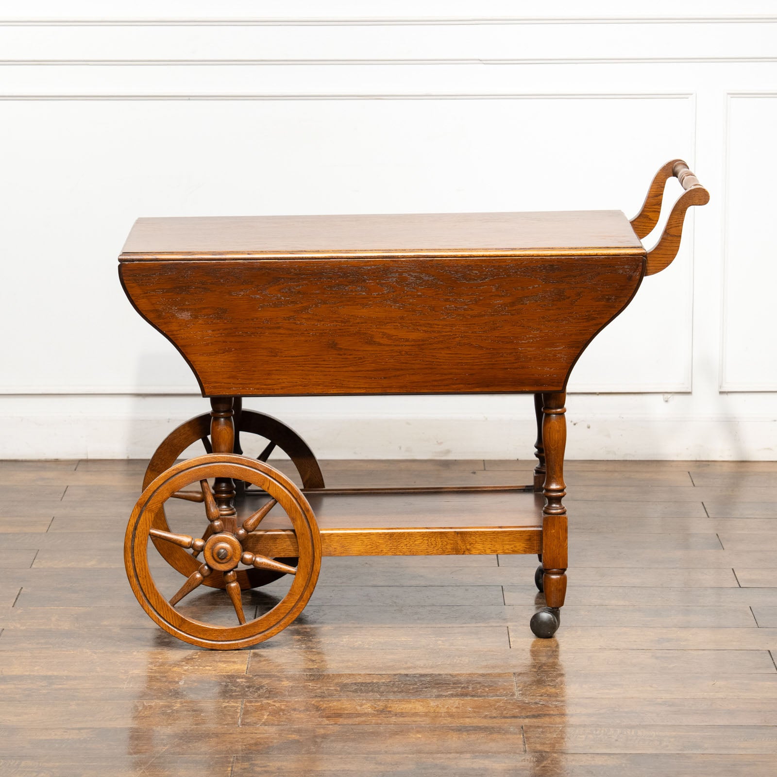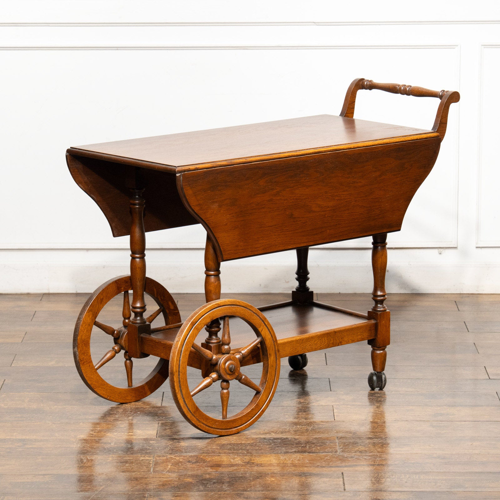 大きなウッドホイールとキャスターが組み合わさった、クラシカルでありながら遊び心のあるデザインのティートローリーです。
