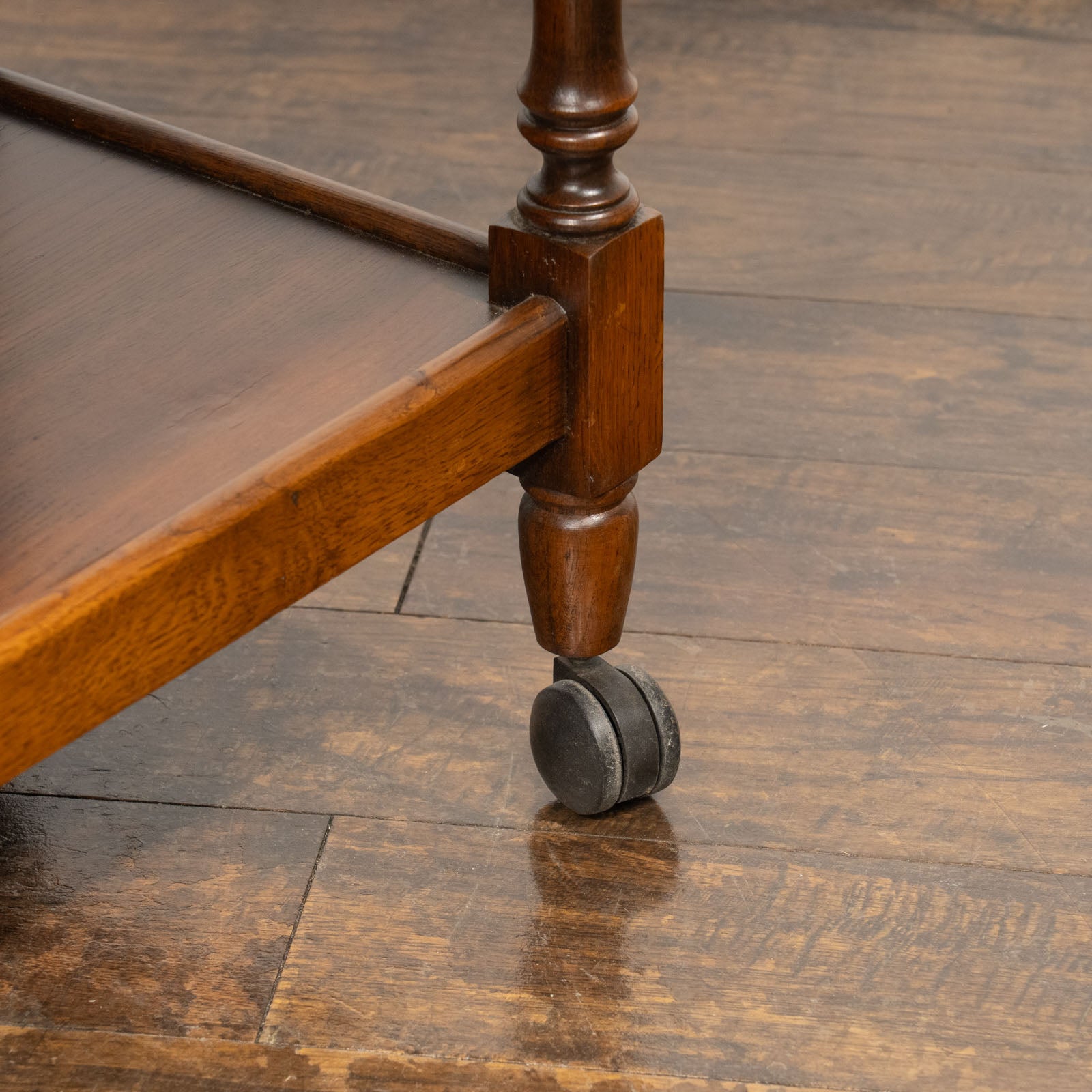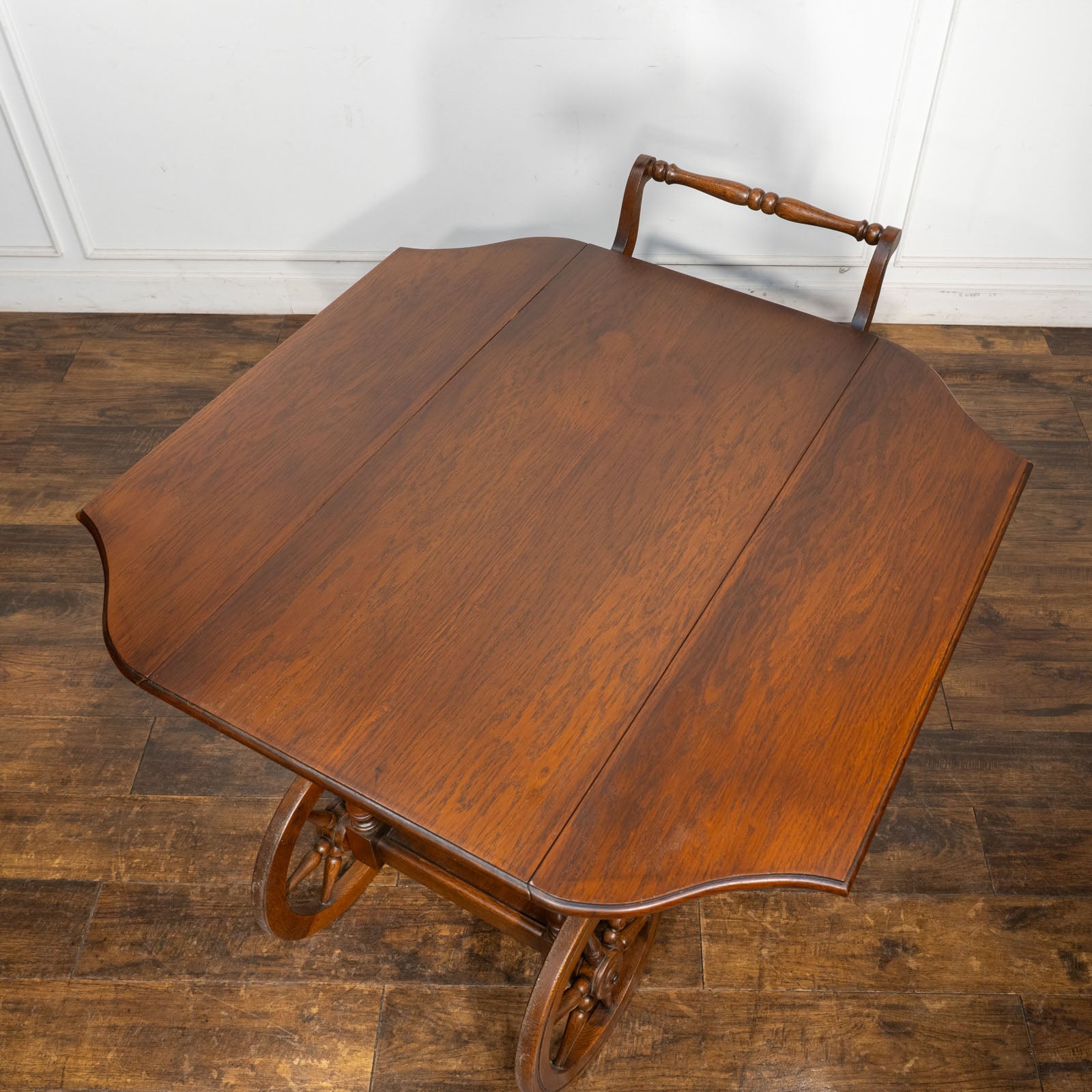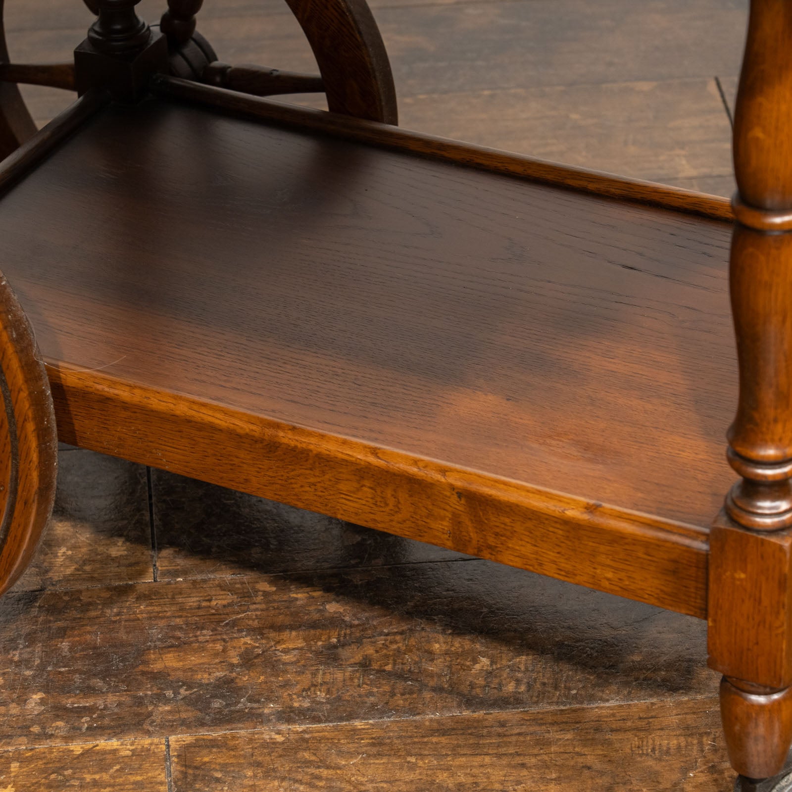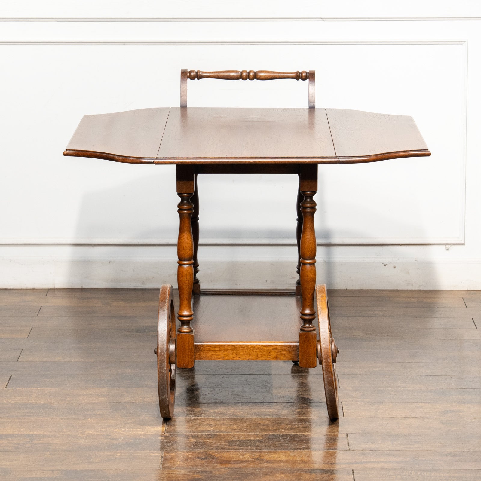 大きなウッドホイールとキャスターが組み合わさった、クラシカルでありながら遊び心のあるデザインのティートローリーです。
