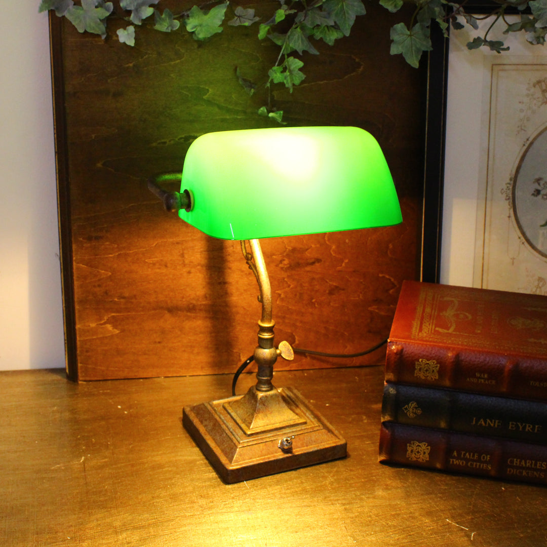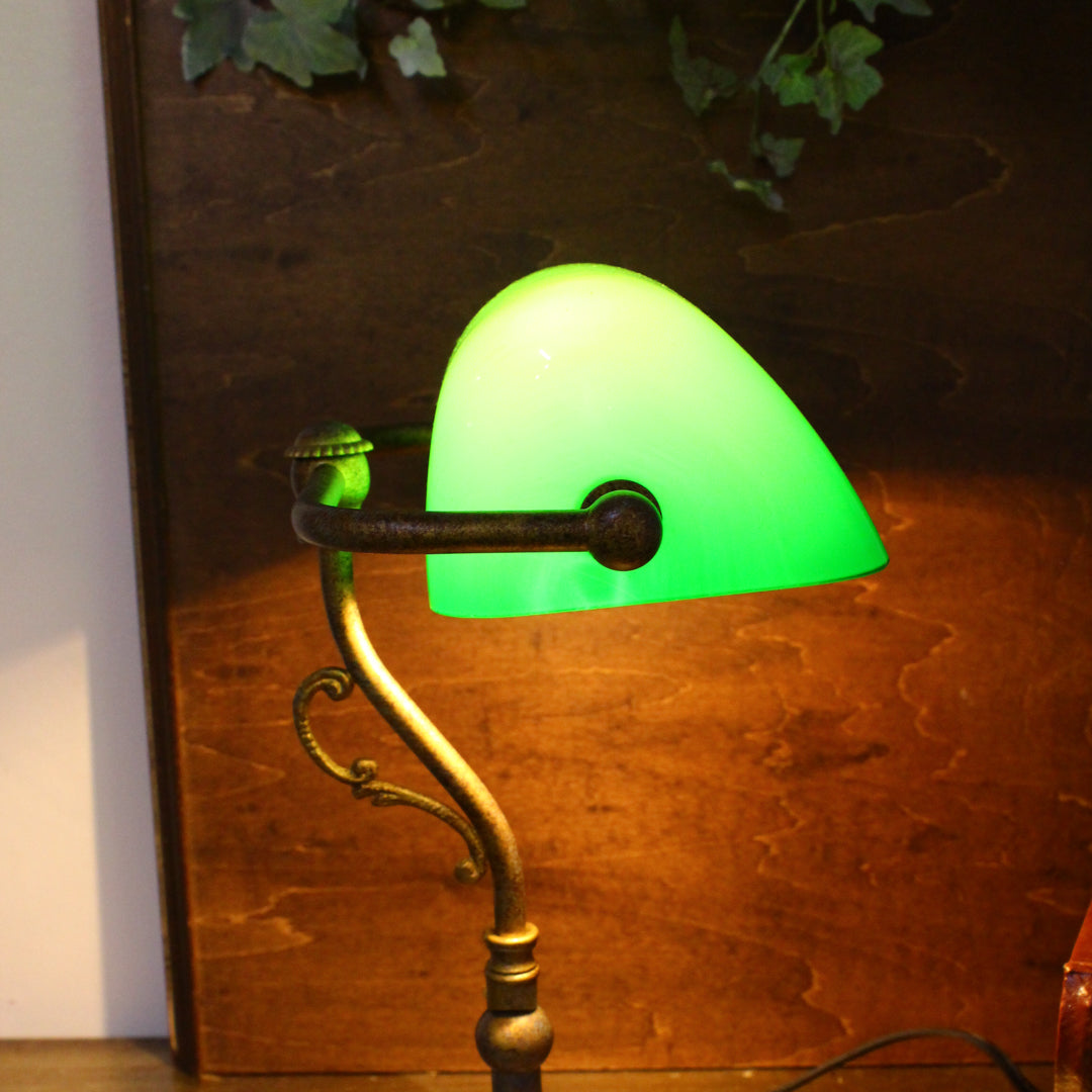 グリーンのガラスシェードが煌びやかな1灯テーブルランプです。本体部分はアンティーク風にブロンズ色で仕上げています。LED電球も対応、重厚感のあるクラシックな雰囲気を演出してくれます。