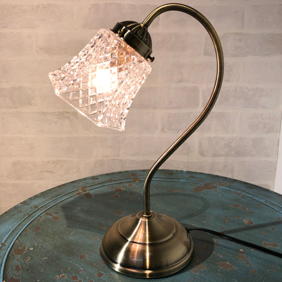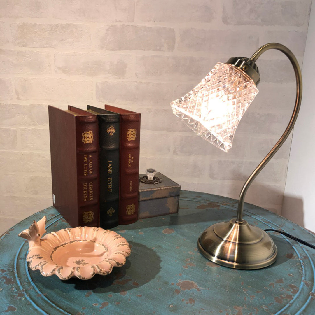 ジオメトリックな幾何学模様のガラスシェードが特徴的な1灯のテーブルランプです。本体部分はアンティーク風にブロンズ色で仕上げており、クラシックな雰囲気を演出してくれます。