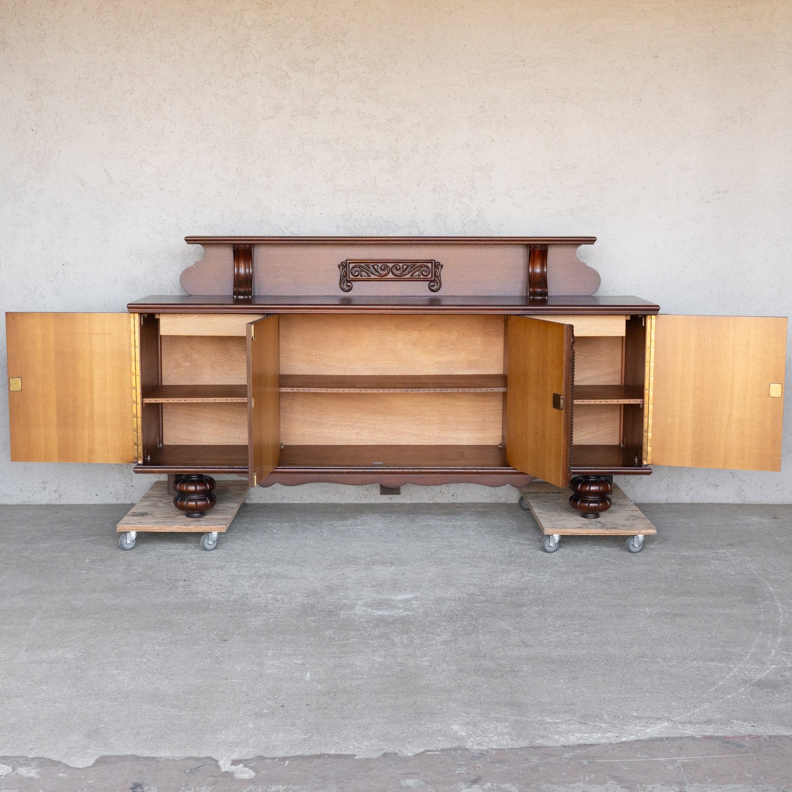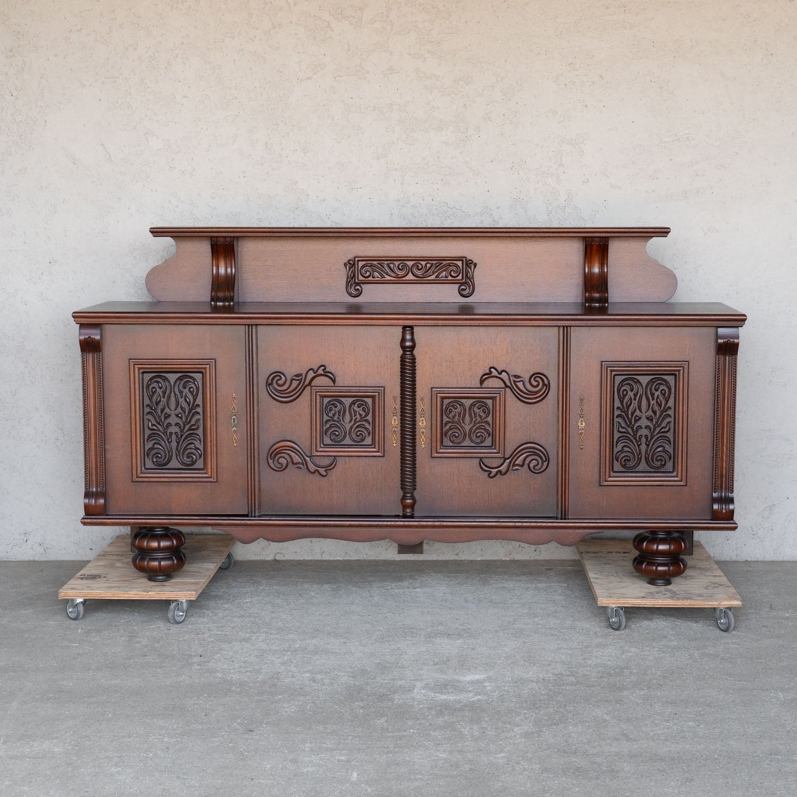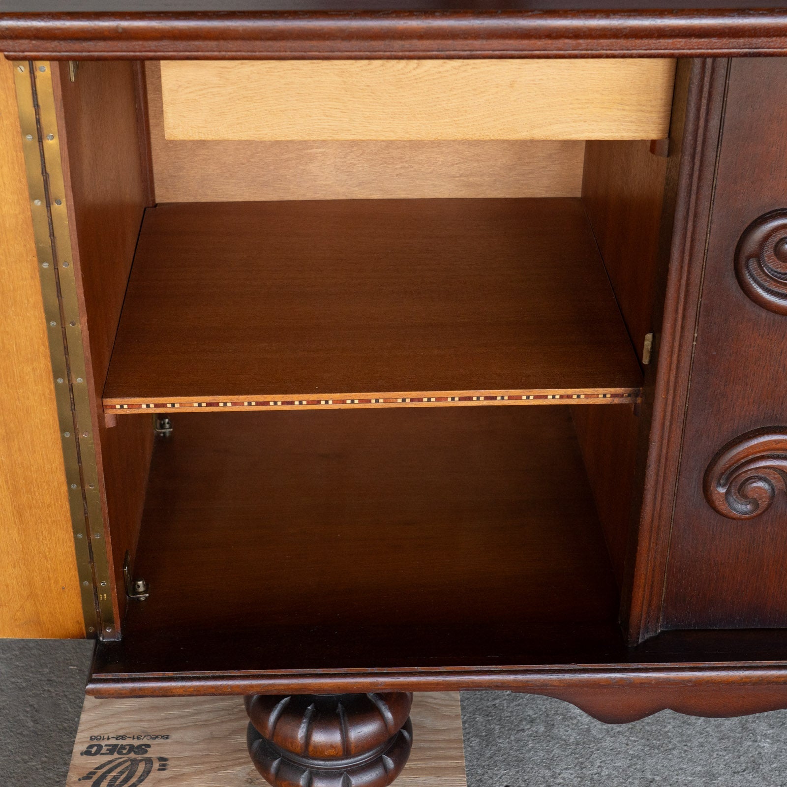 こちらはベルギーから買付けた、繊細な装飾が美しいサイドボードです。