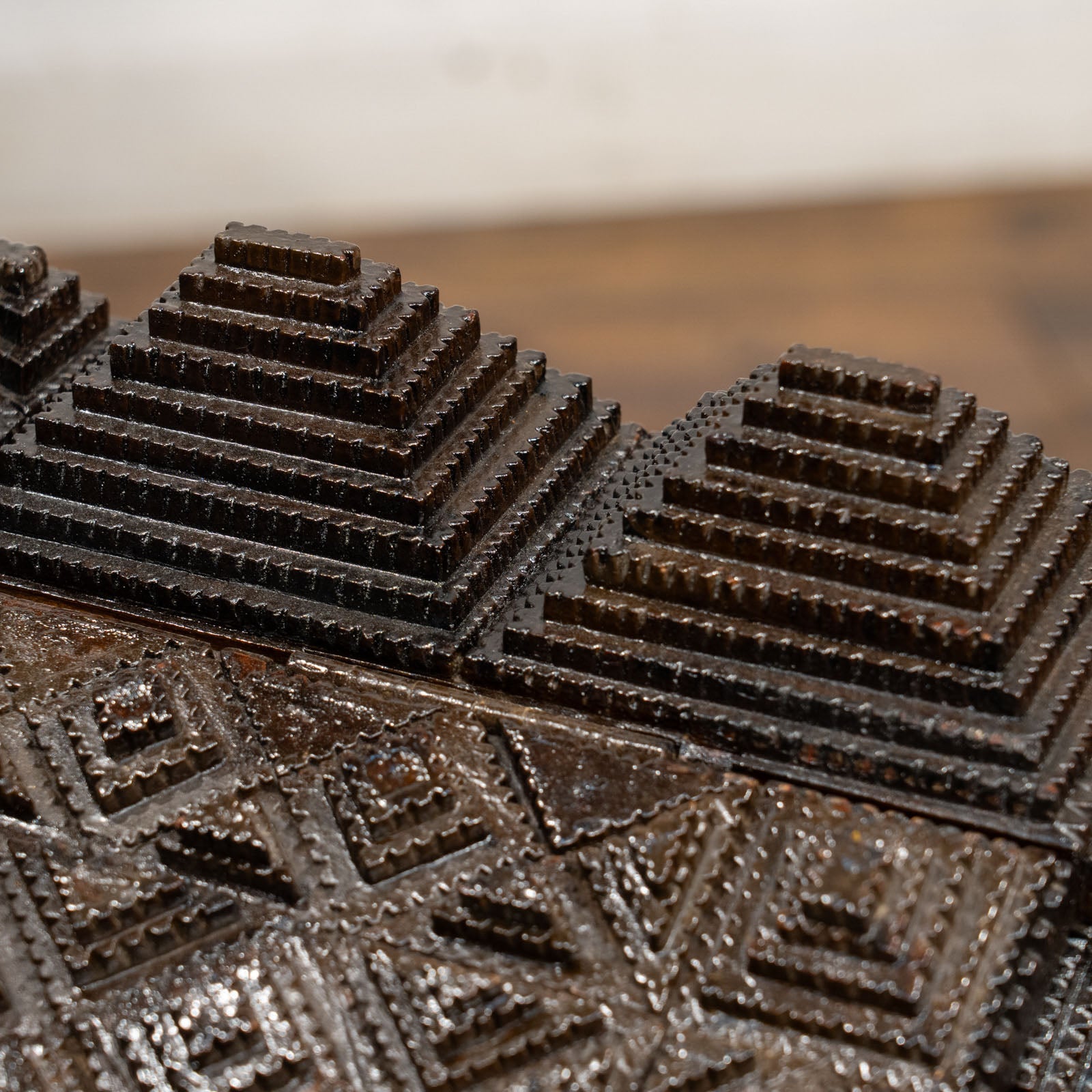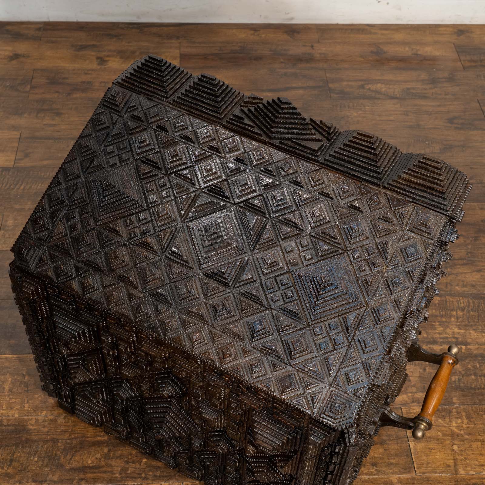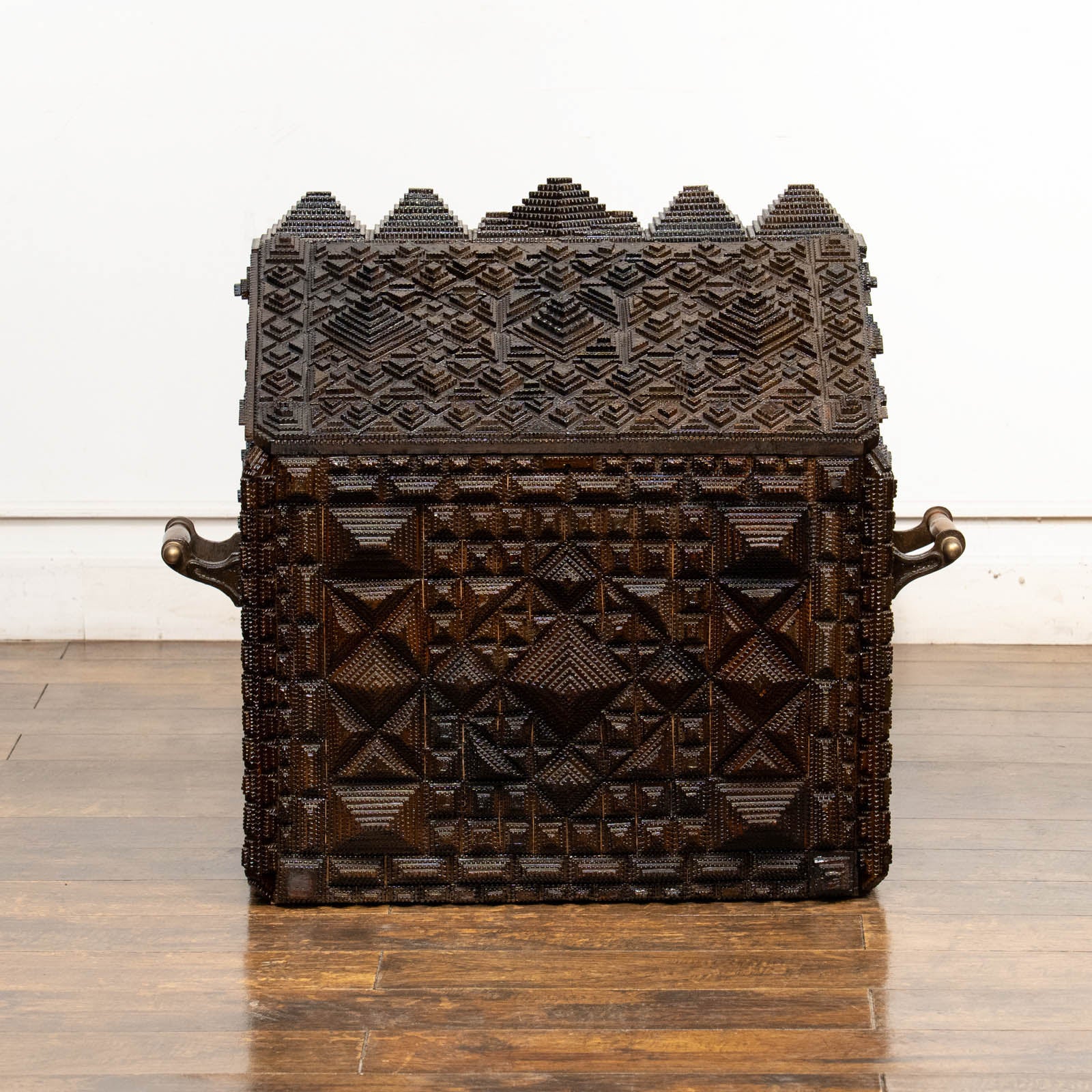 廃棄された木材や葉巻の箱を再利用し、木にV字型の切り込みを入れる「チップ・カービング(薄片彫り)」という技法で層状に重ね、複雑で幾何学的なパターンを作り出すのが特徴です。