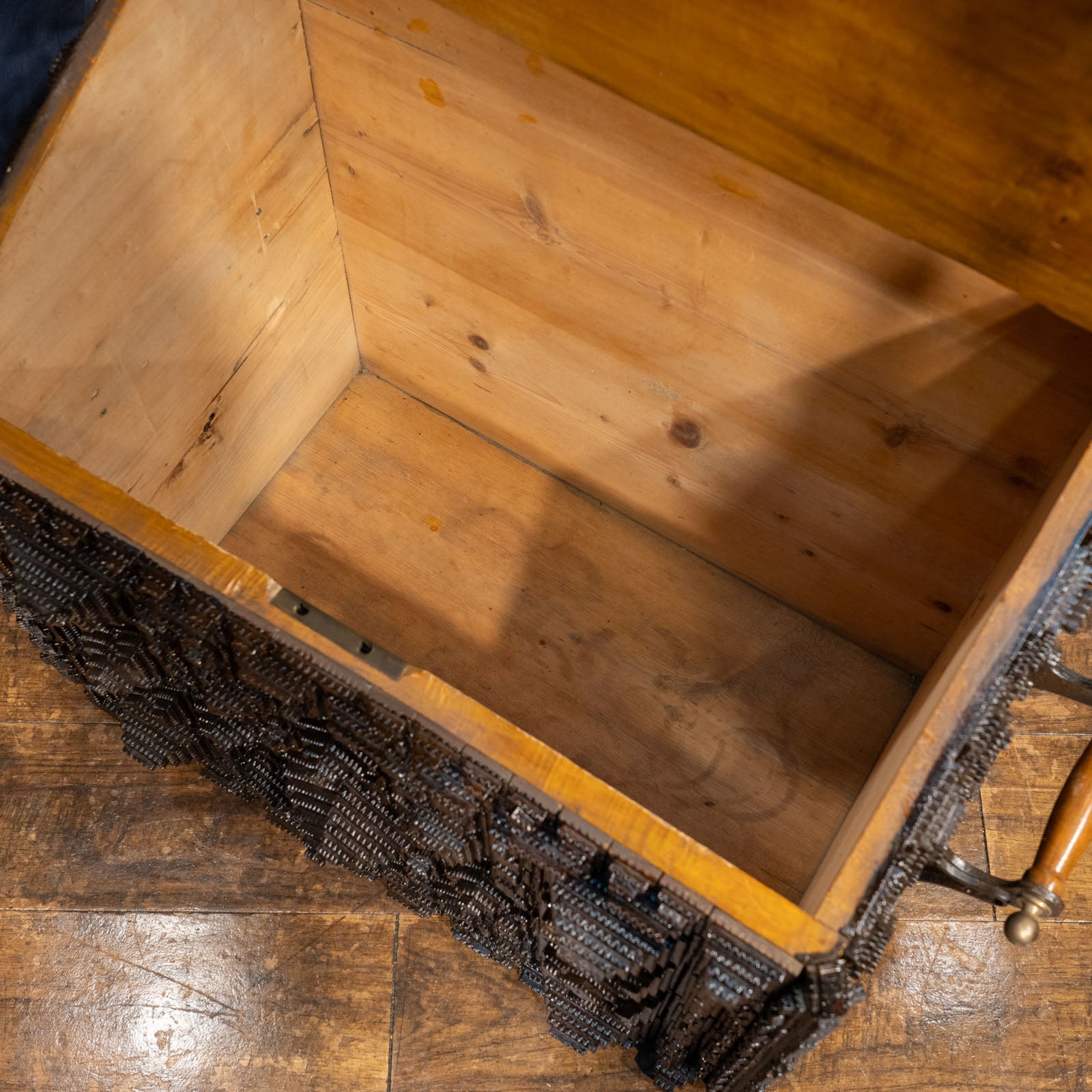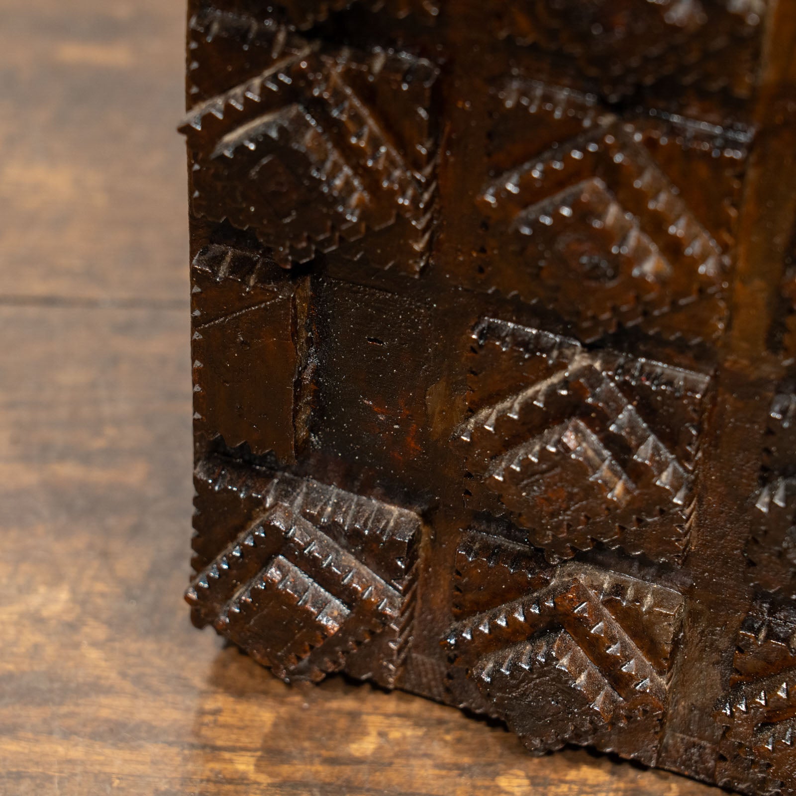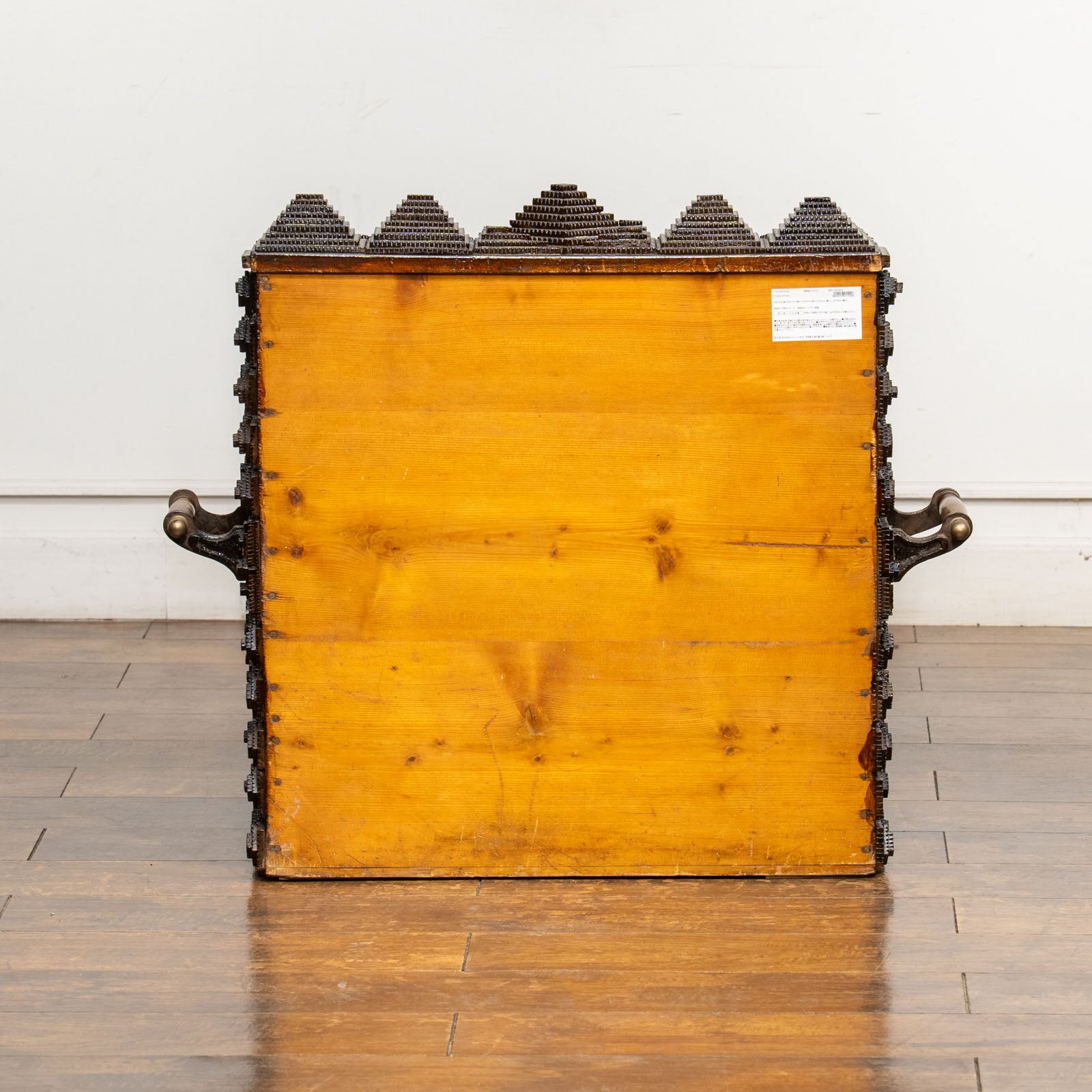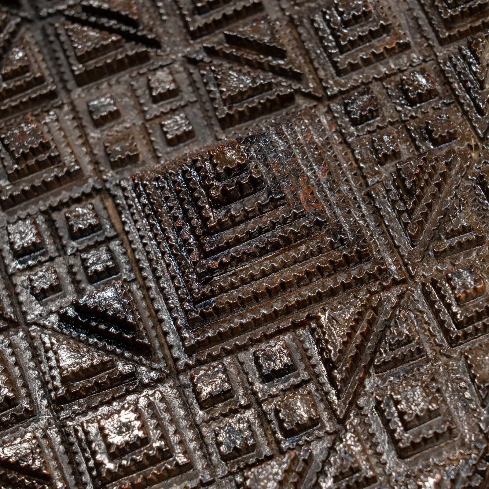 廃棄された木材や葉巻の箱を再利用し、木にV字型の切り込みを入れる「チップ・カービング(薄片彫り)」という技法で層状に重ね、複雑で幾何学的なパターンを作り出すのが特徴です。