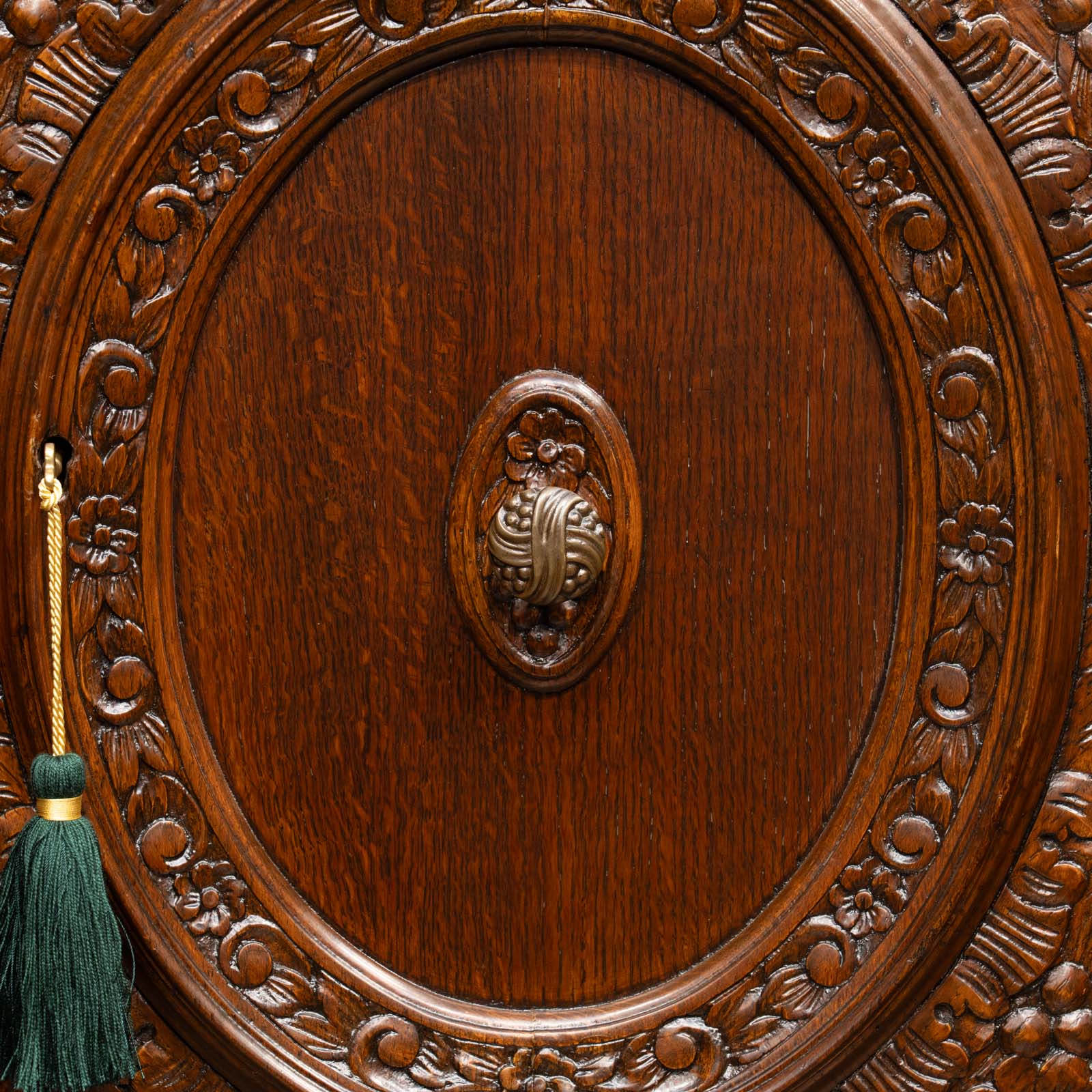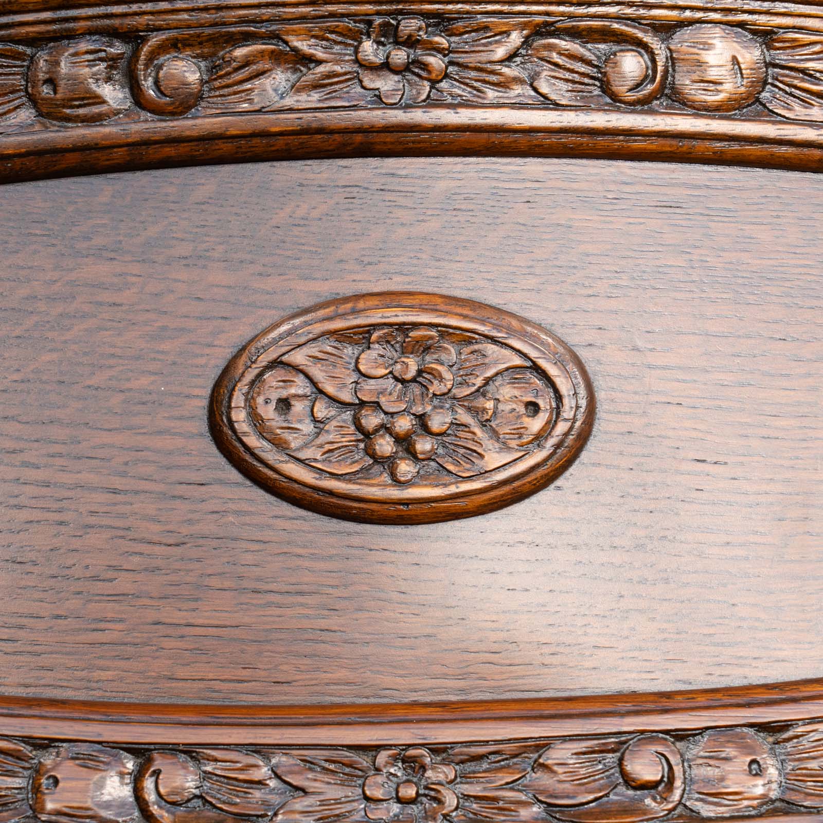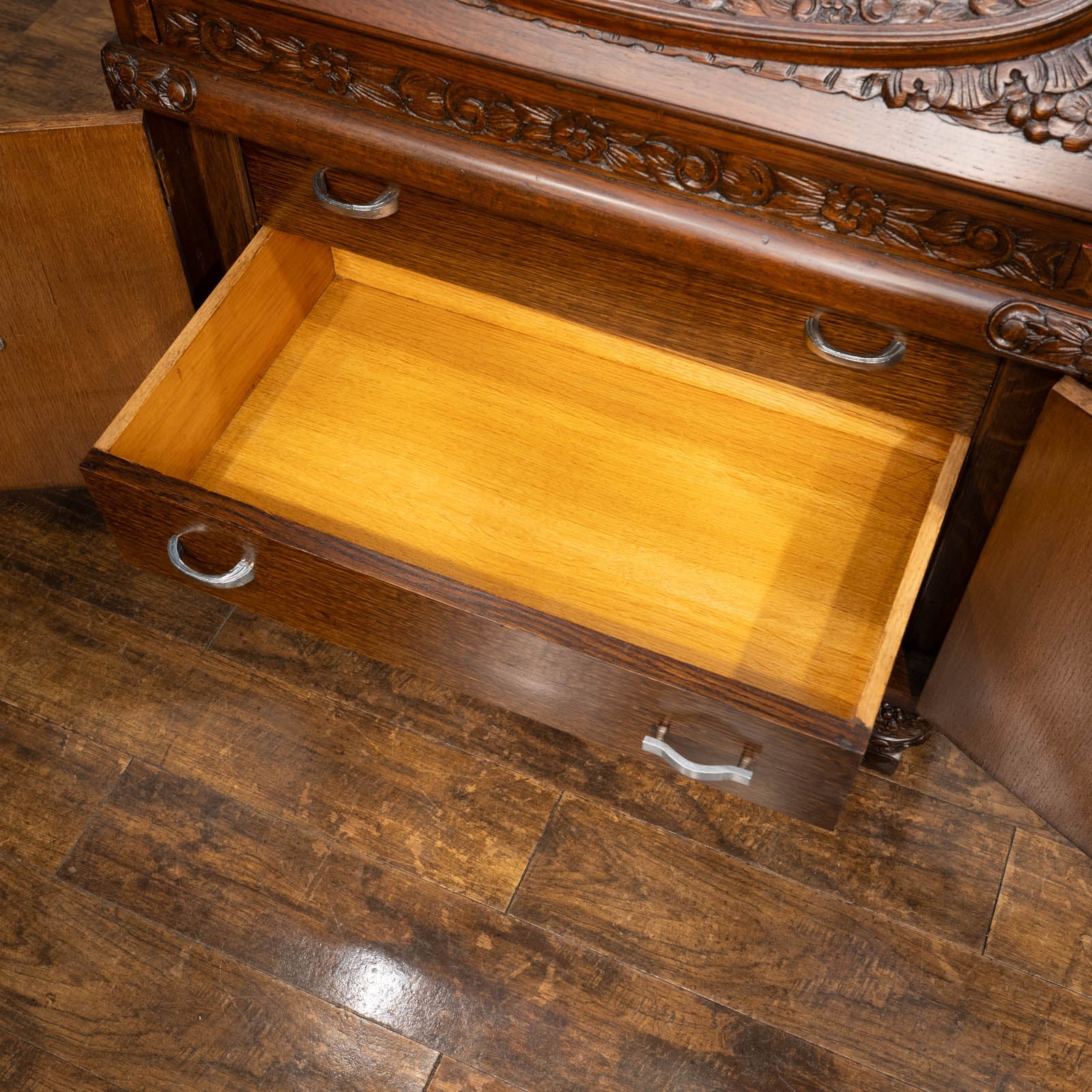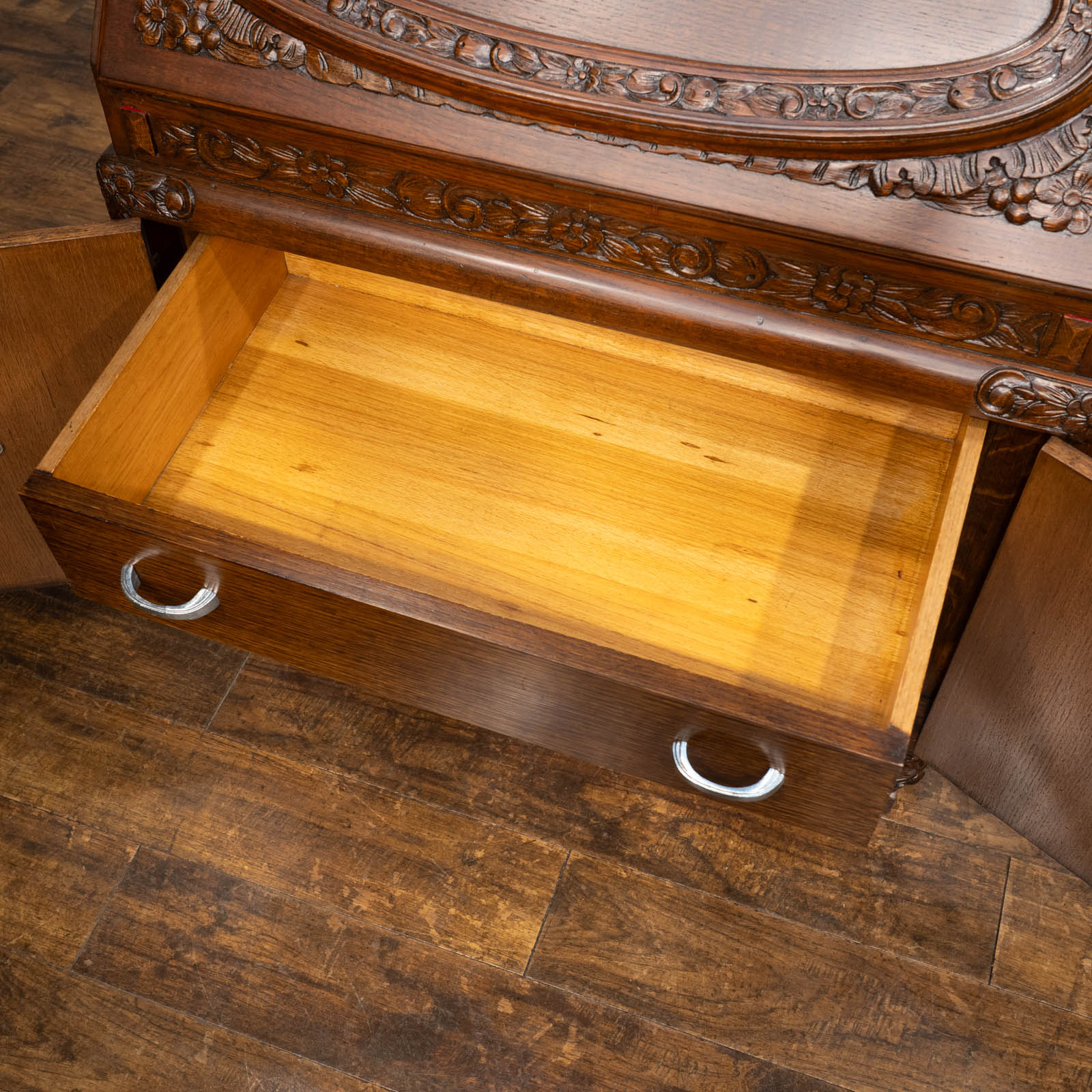 華やかな扉を開けると引き出しがでてくる仕様になっており、天板にも施されたオーバルのレリーフとの統一感が目を惹きます。