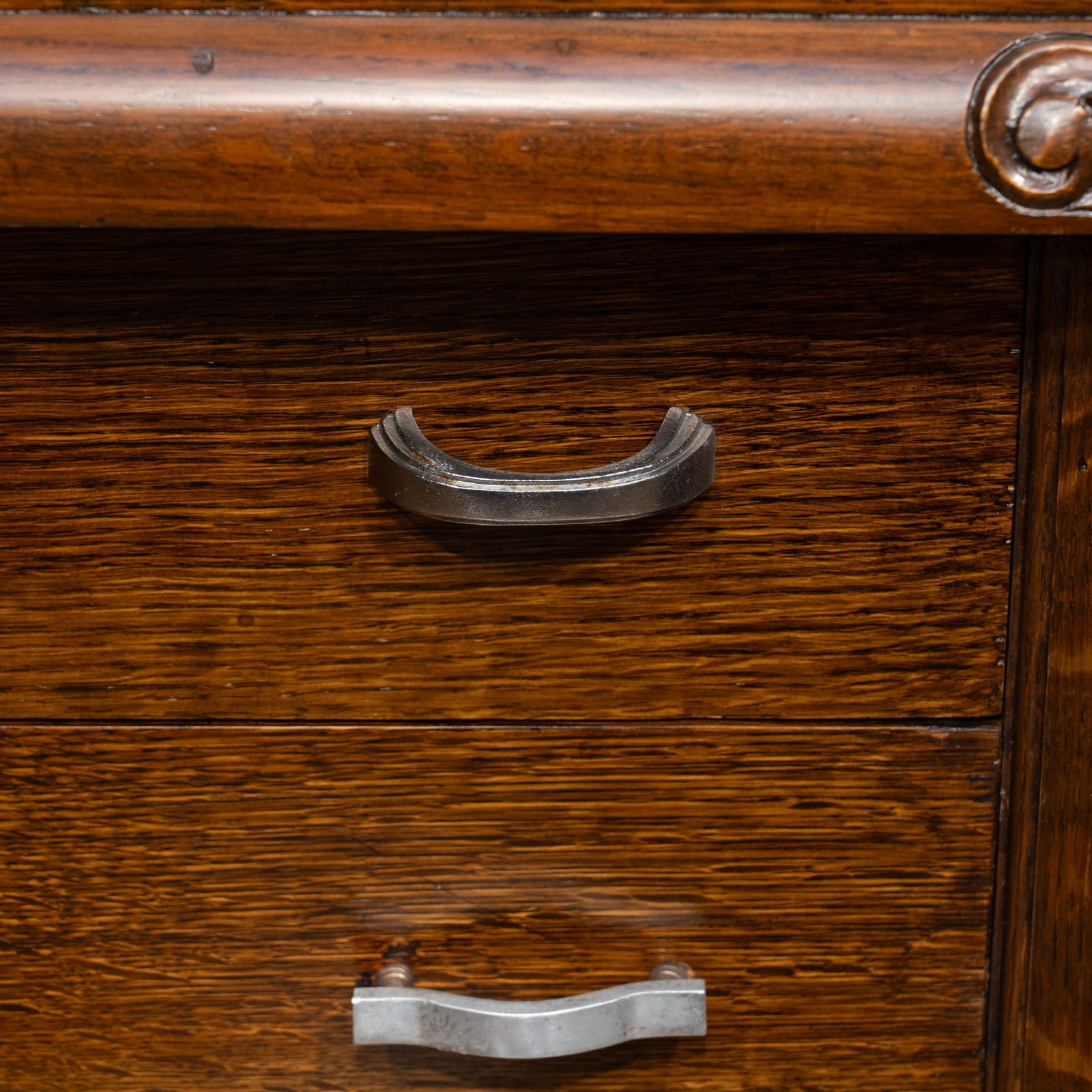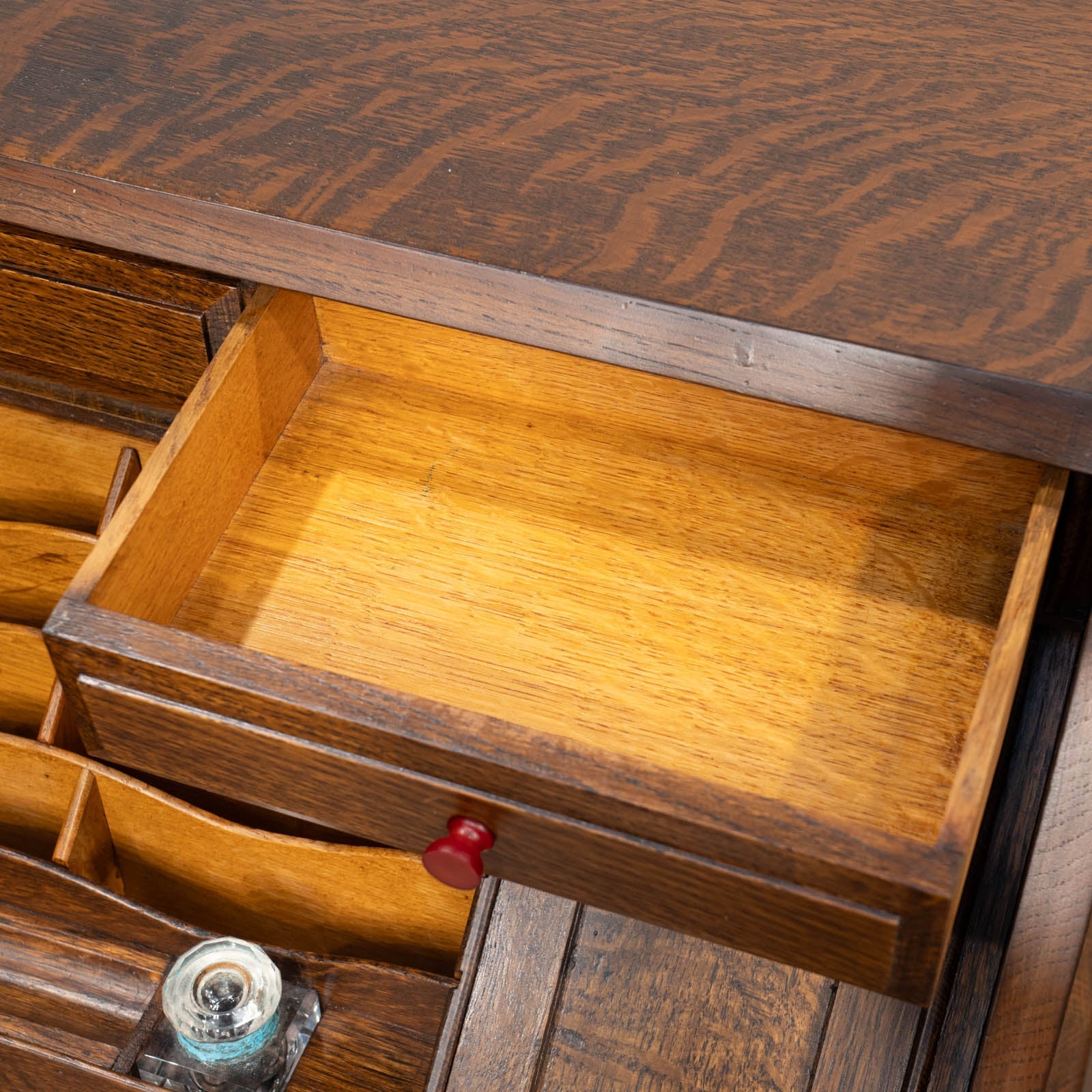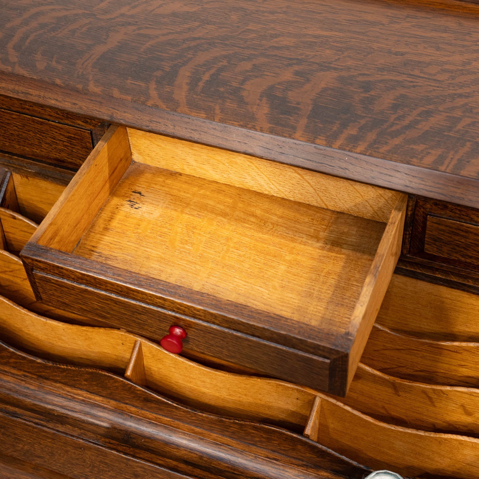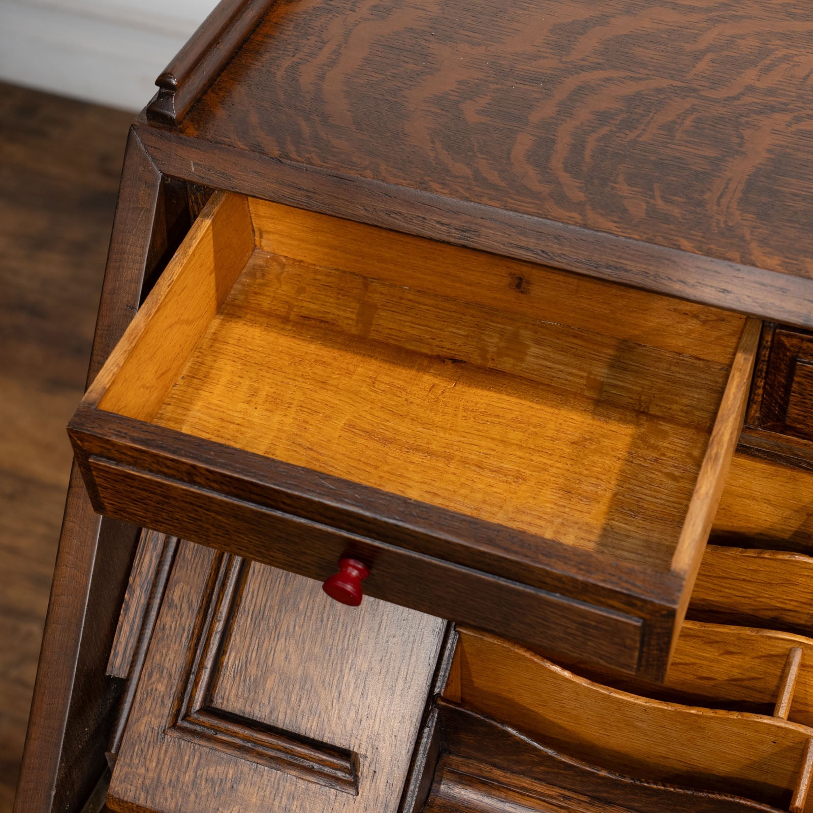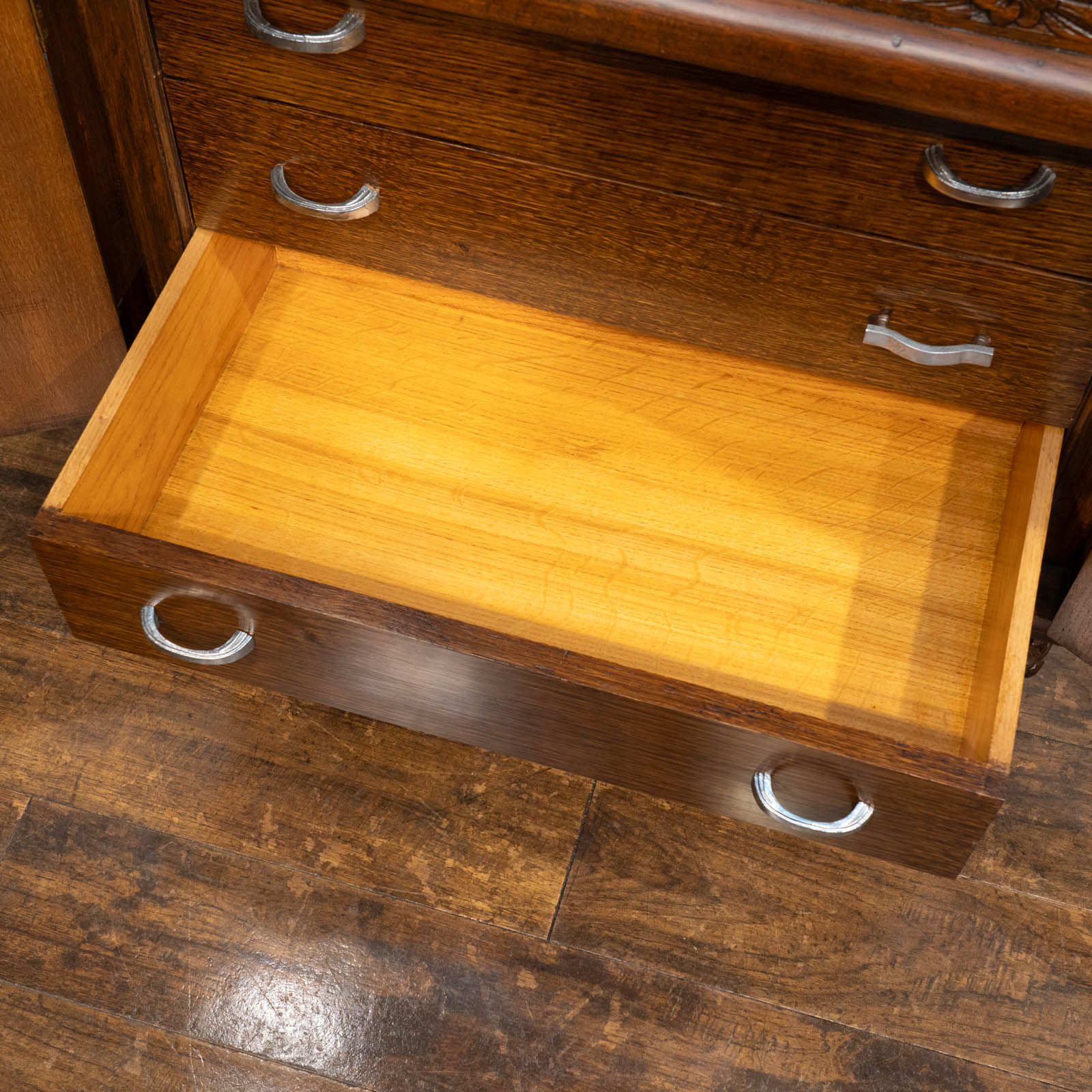 華やかな扉を開けると引き出しがでてくる仕様になっており、天板にも施されたオーバルのレリーフとの統一感が目を惹きます。