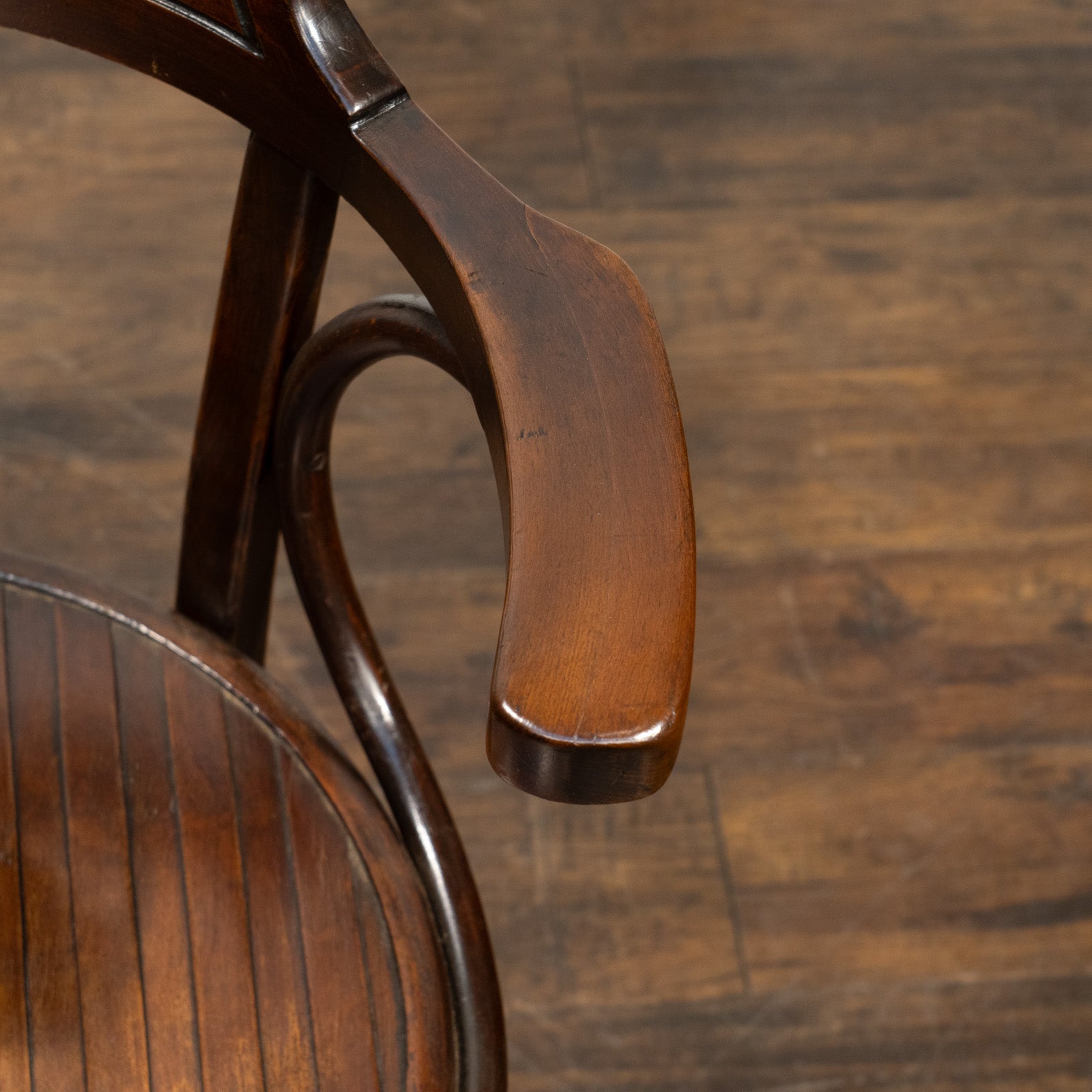 広い座面にはストライプモチーフがエンボス加工されており、柔らかく包み込むような背もたれとアームから曲木の良さが存分に感じられます。