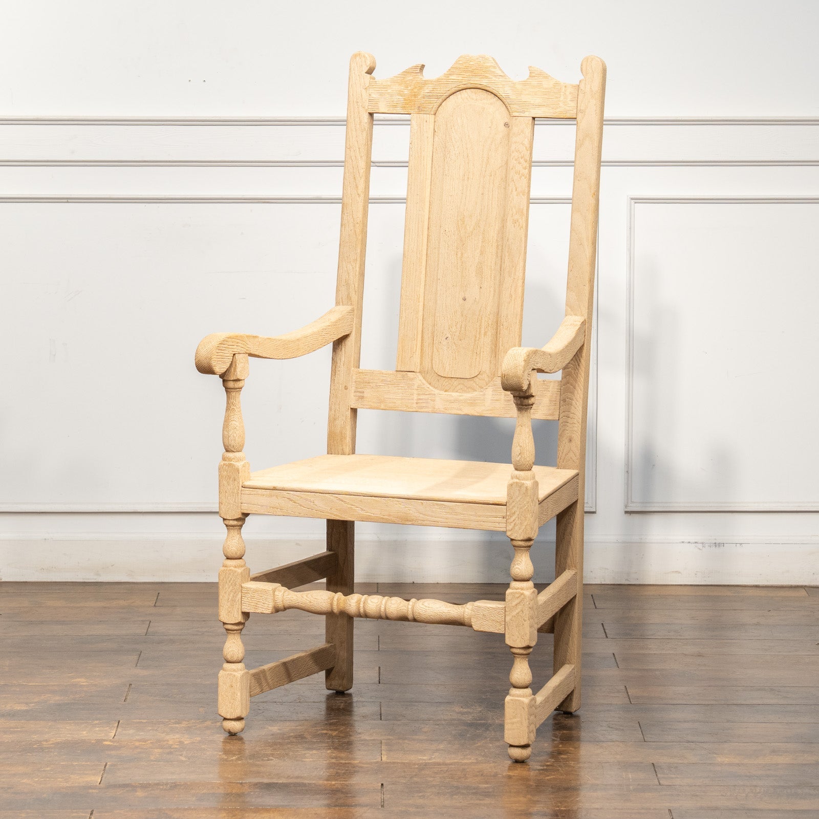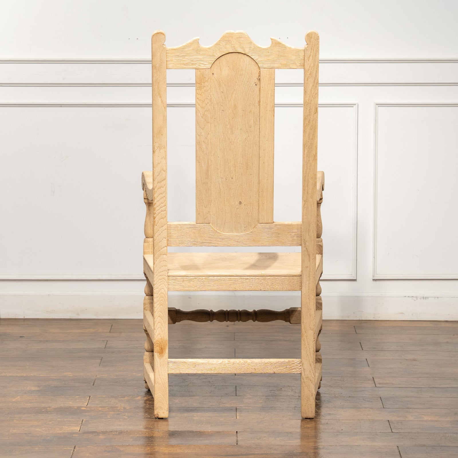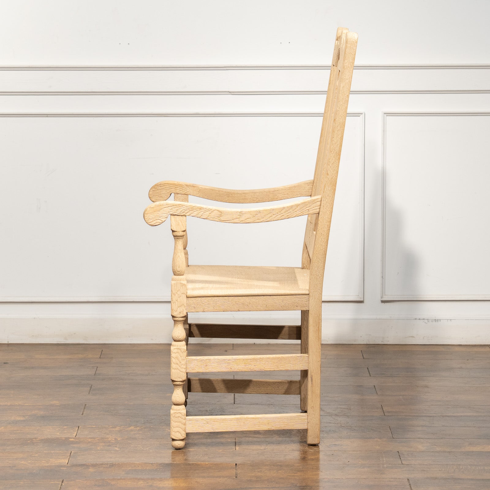 背の高いパネルバックの背もたれが優しく背中を支えてくれ、素朴な質感と手の込んだ挽き物装飾とのコントラストが印象的です。