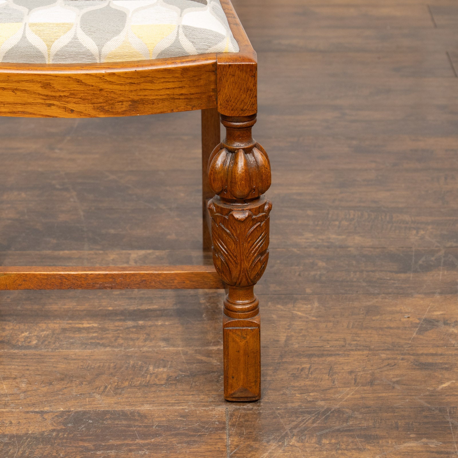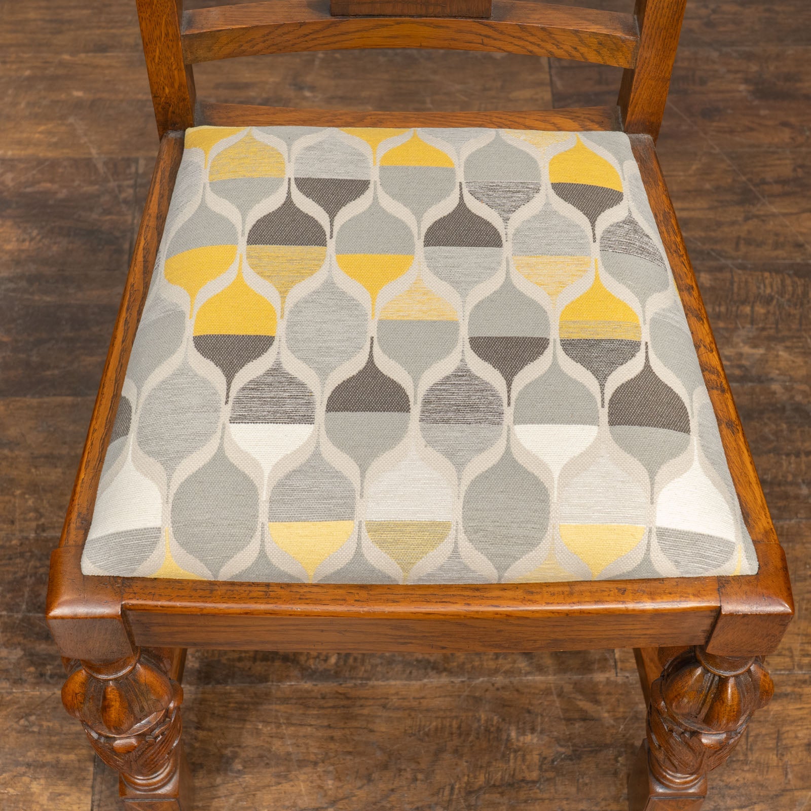 新しく張り替えた座面には、北欧を思わせるカラーと幾何学模様のデザインが可愛らしい生地を使用しました。
