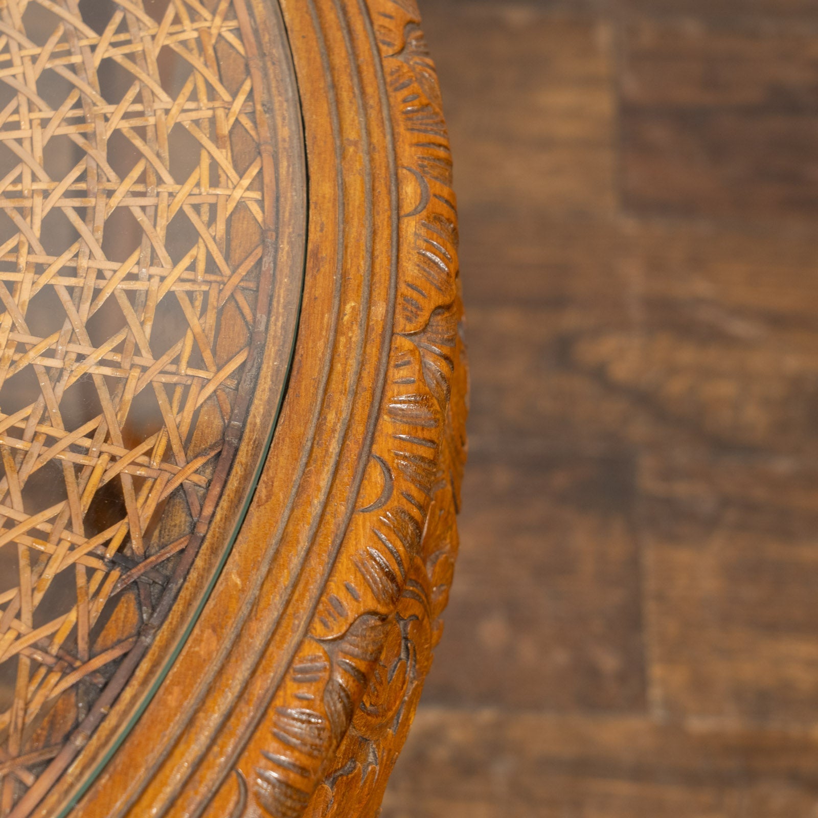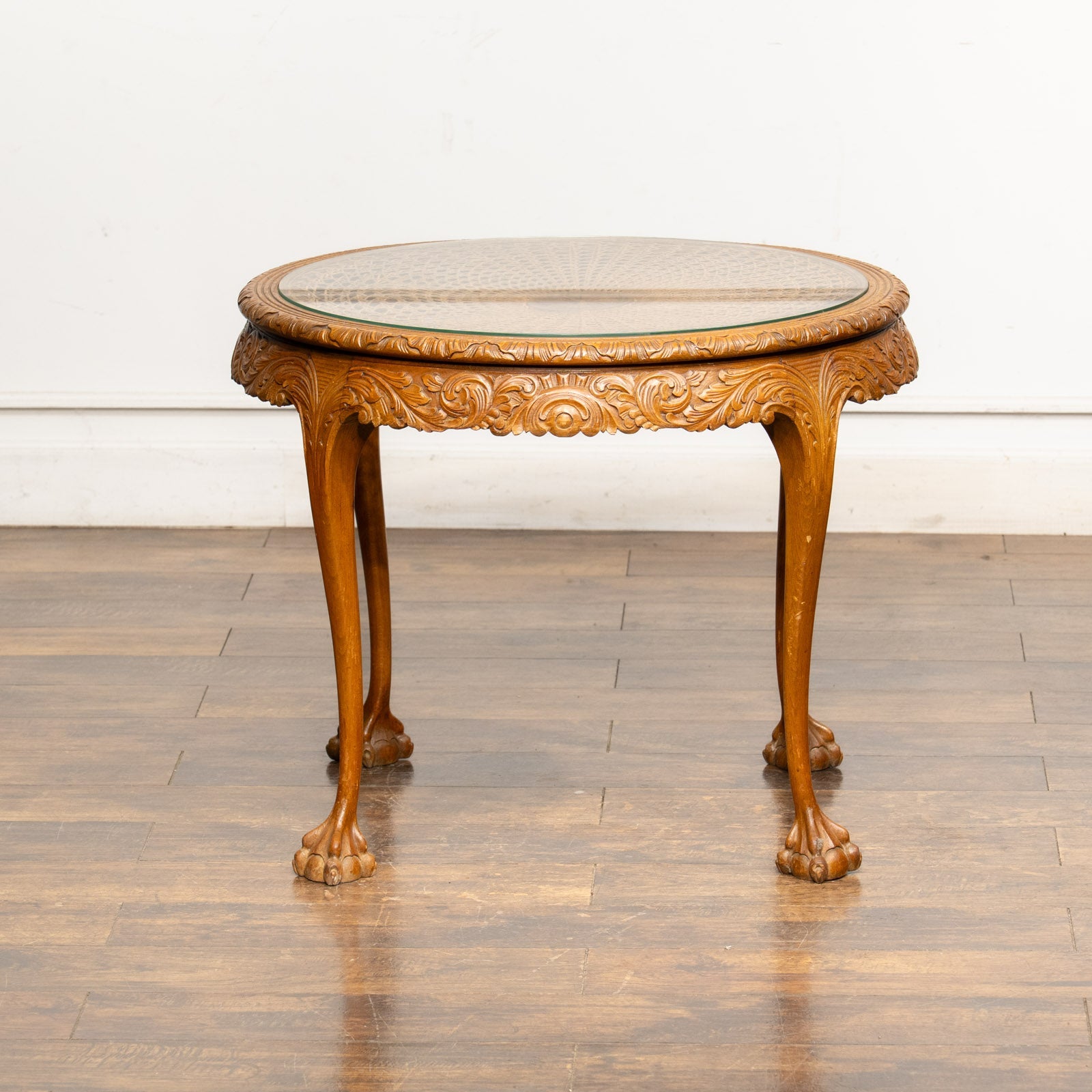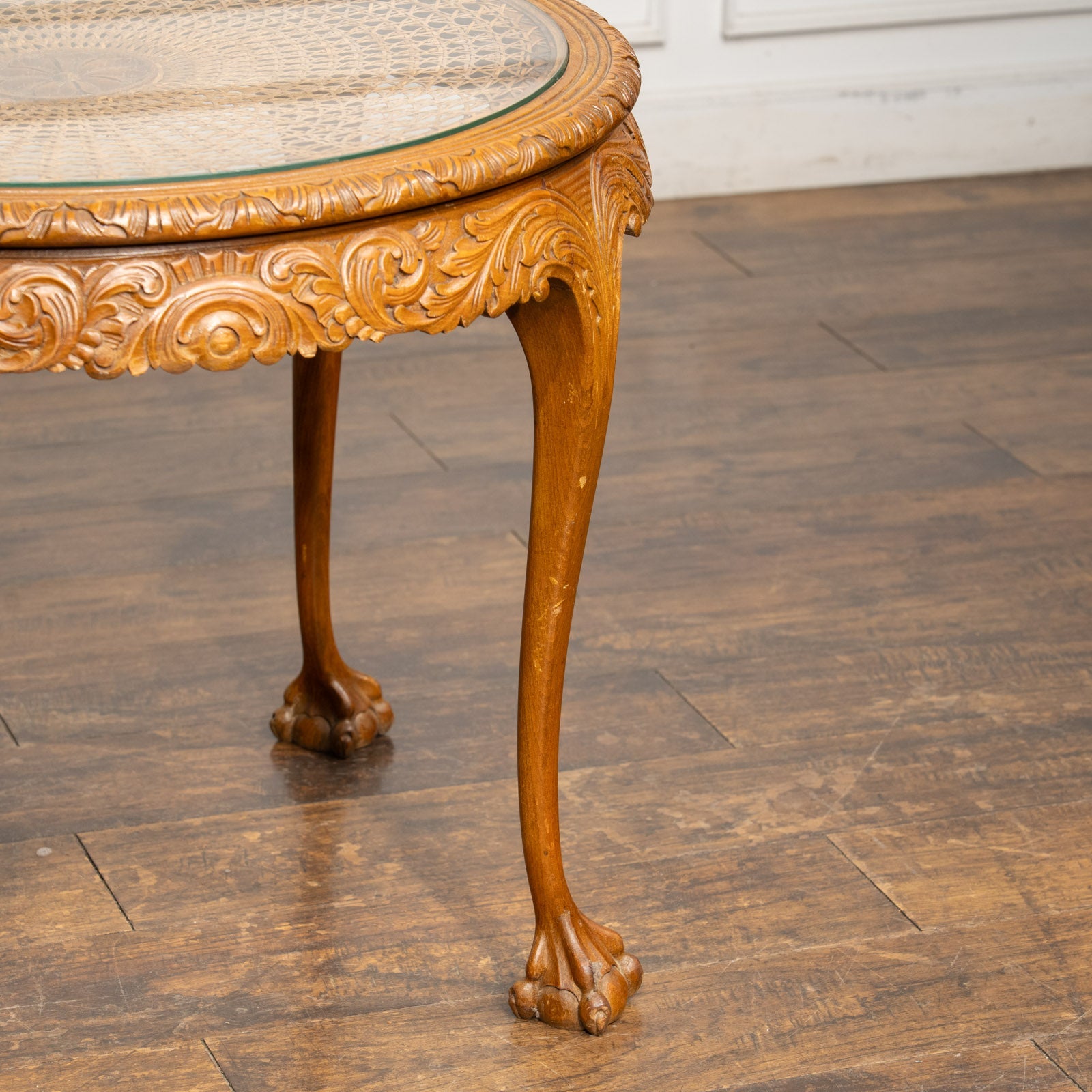 幕板に彫られたアカンサスリーフのレリーフや、ガラス天板からのぞく籐編み装飾がエレガントです。