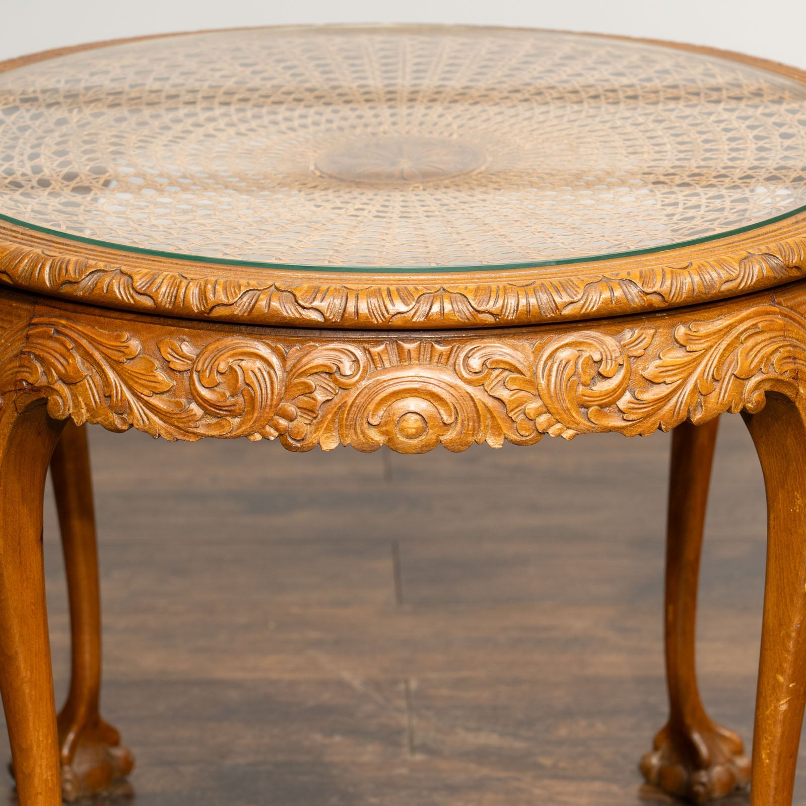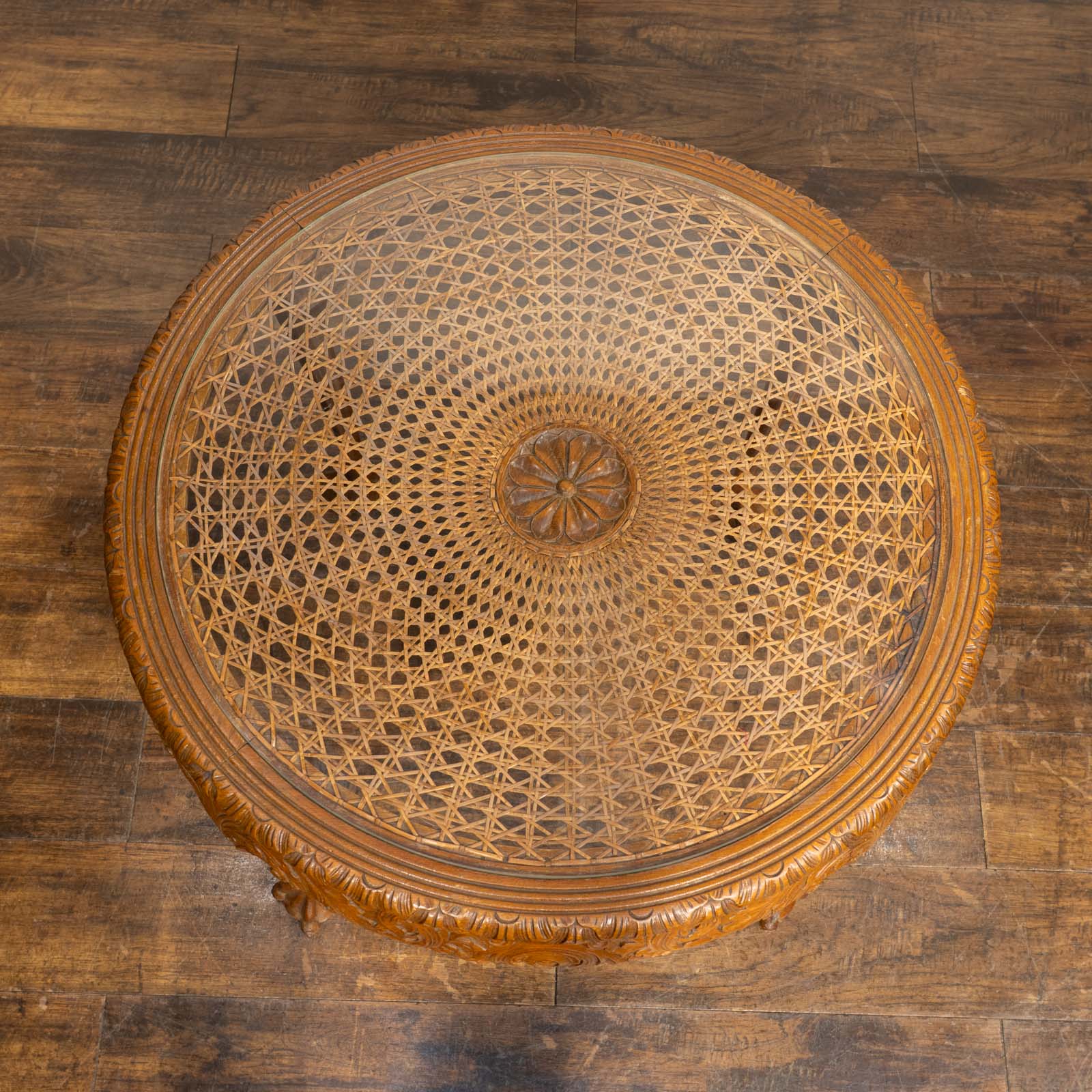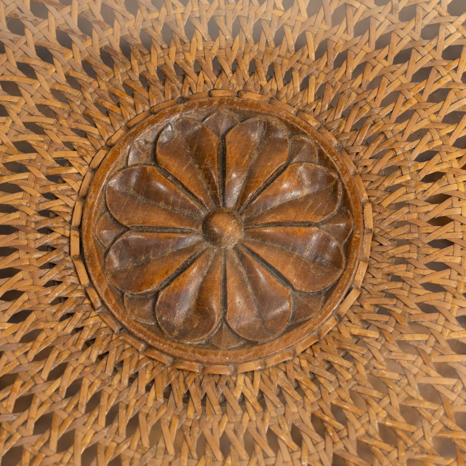 幕板に彫られたアカンサスリーフのレリーフや、ガラス天板からのぞく籐編み装飾がエレガントです。