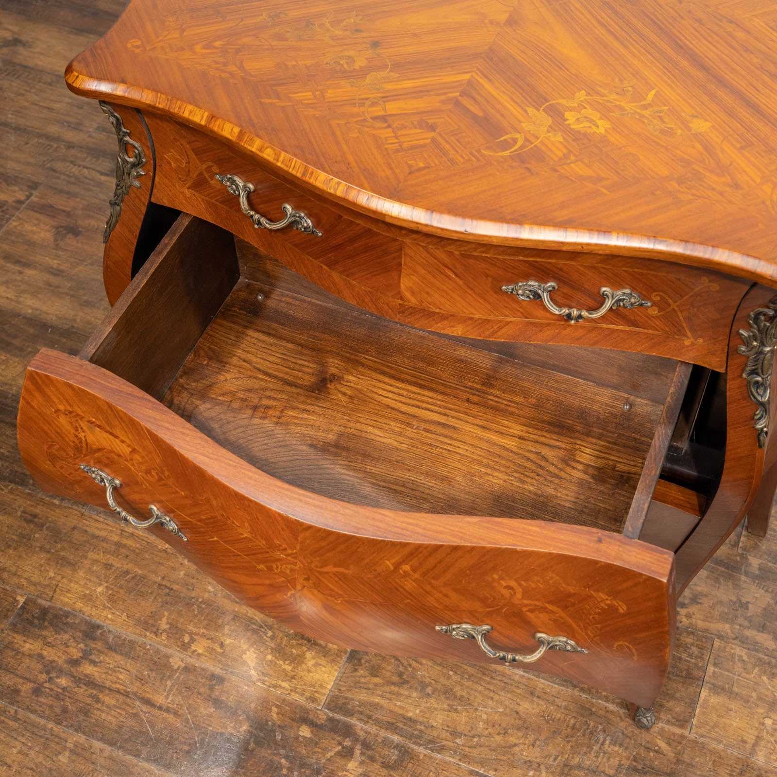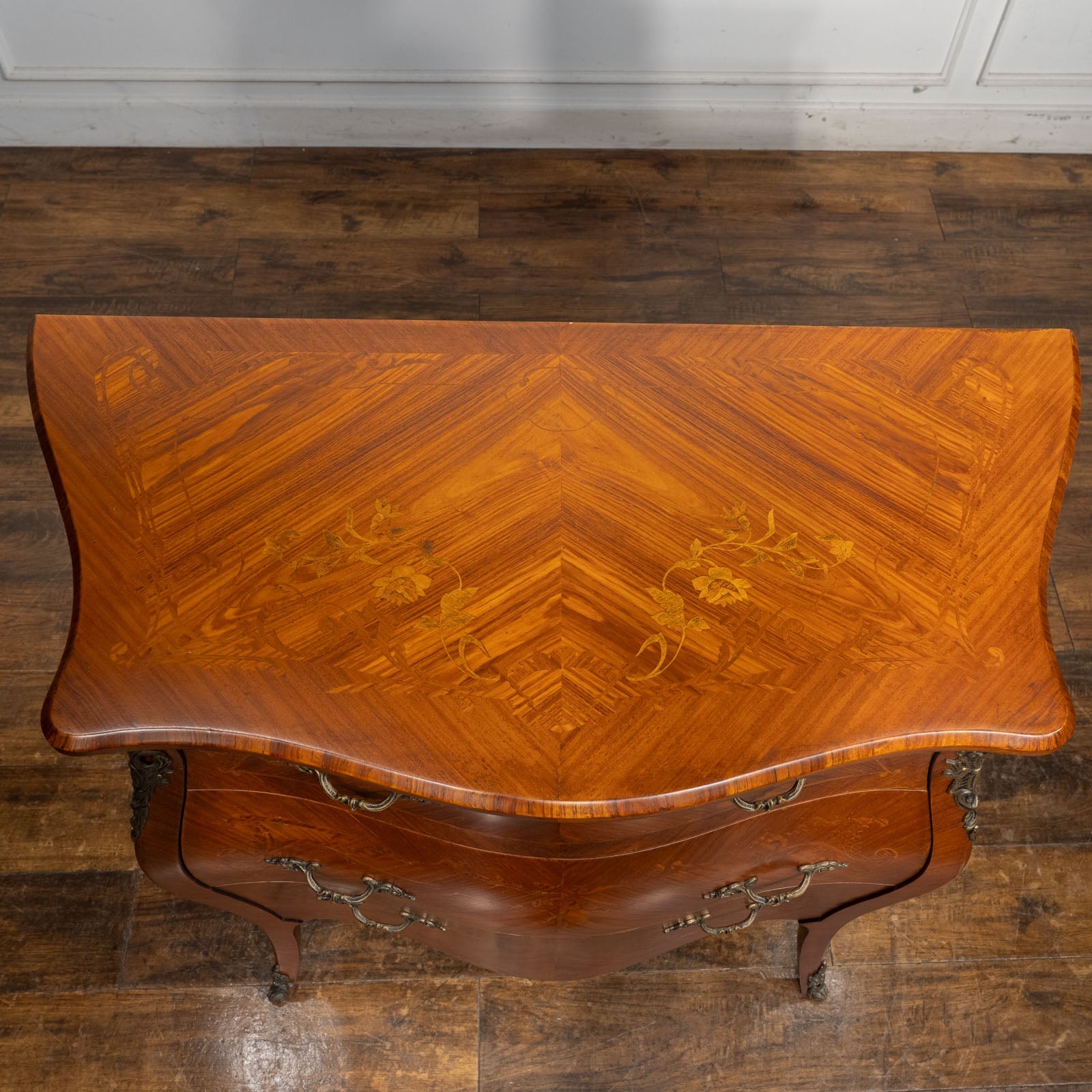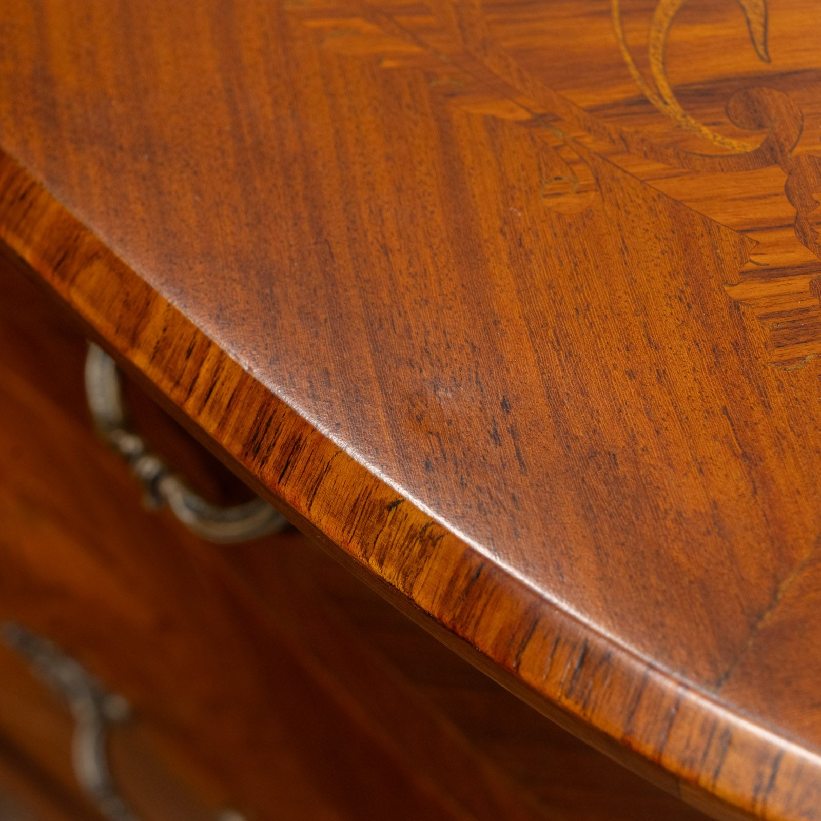 インレイ(象嵌)の美しい装飾が天板や前面、側面に至るまで施されており、高級感のある輝きと重厚感を放つ、置くだけで絵になる逸品です。