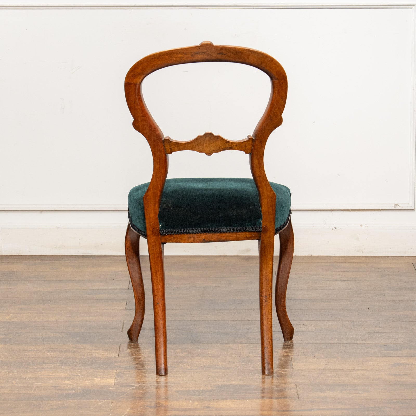 座面はシンプルで高級感のあるグリーンのモケット生地で張り替えており、曲線美のカブリオールレッグや風船のように丸く造られた上品なバルーンバックのデザインとマッチしています。