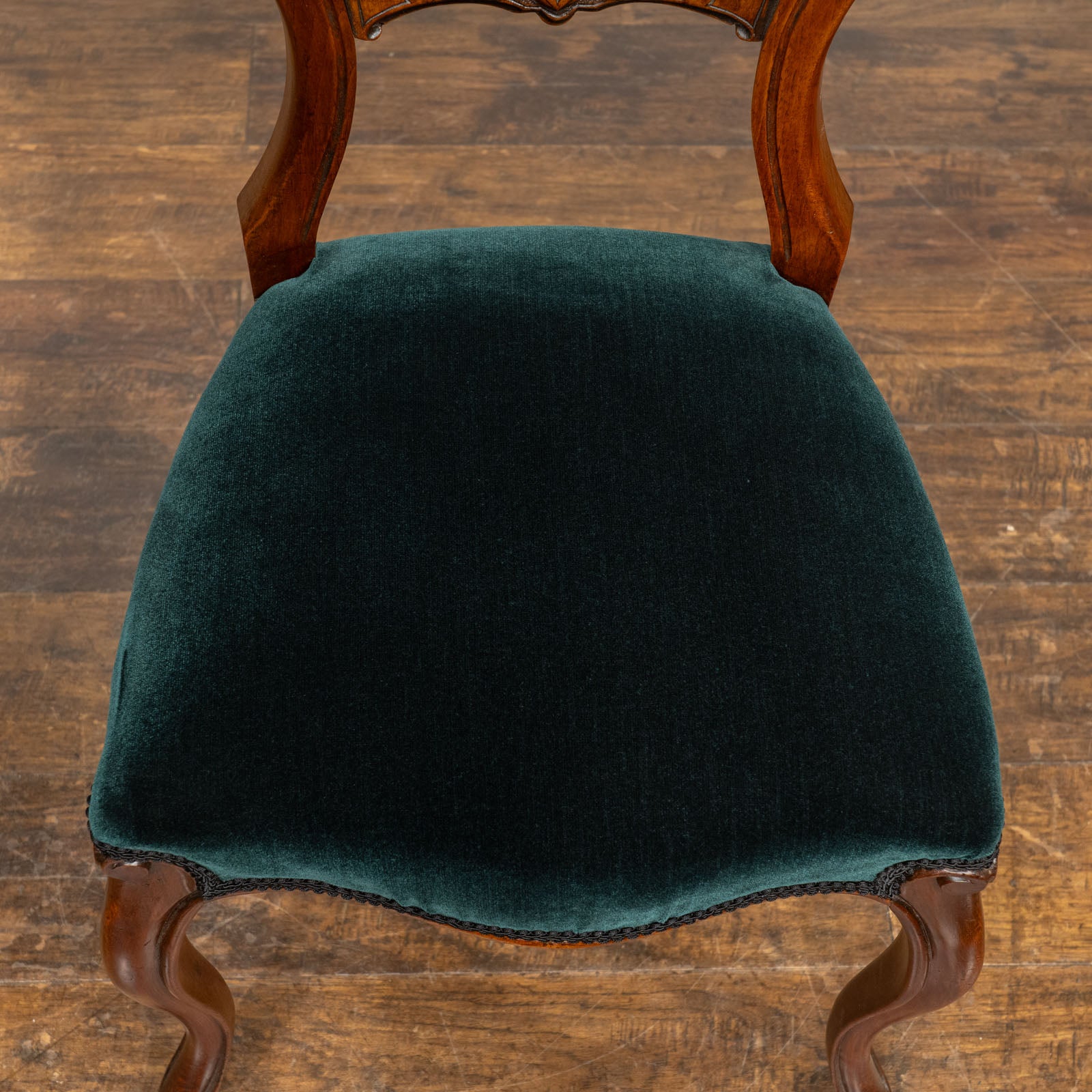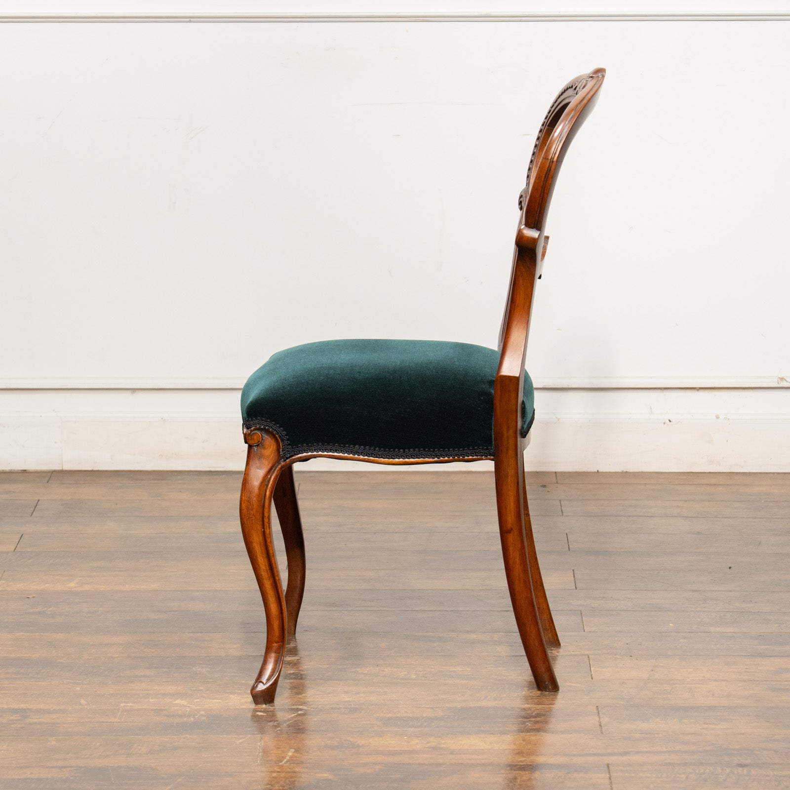 座面はシンプルで高級感のあるグリーンのモケット生地で張り替えており、曲線美のカブリオールレッグや風船のように丸く造られた上品なバルーンバックのデザインとマッチしています。