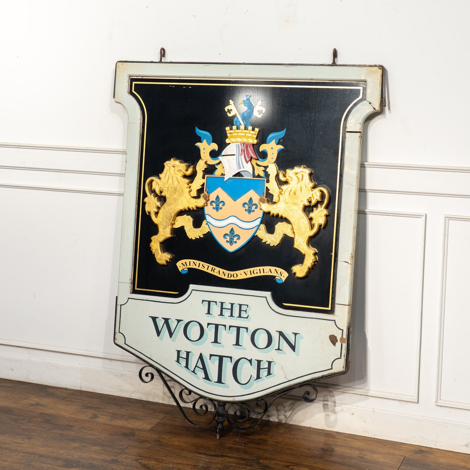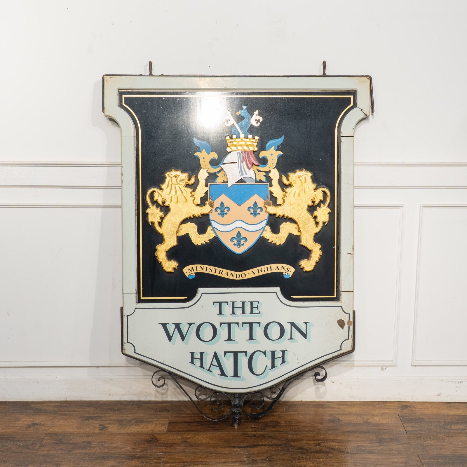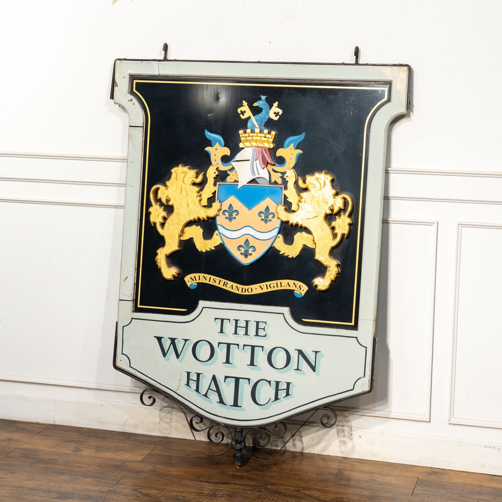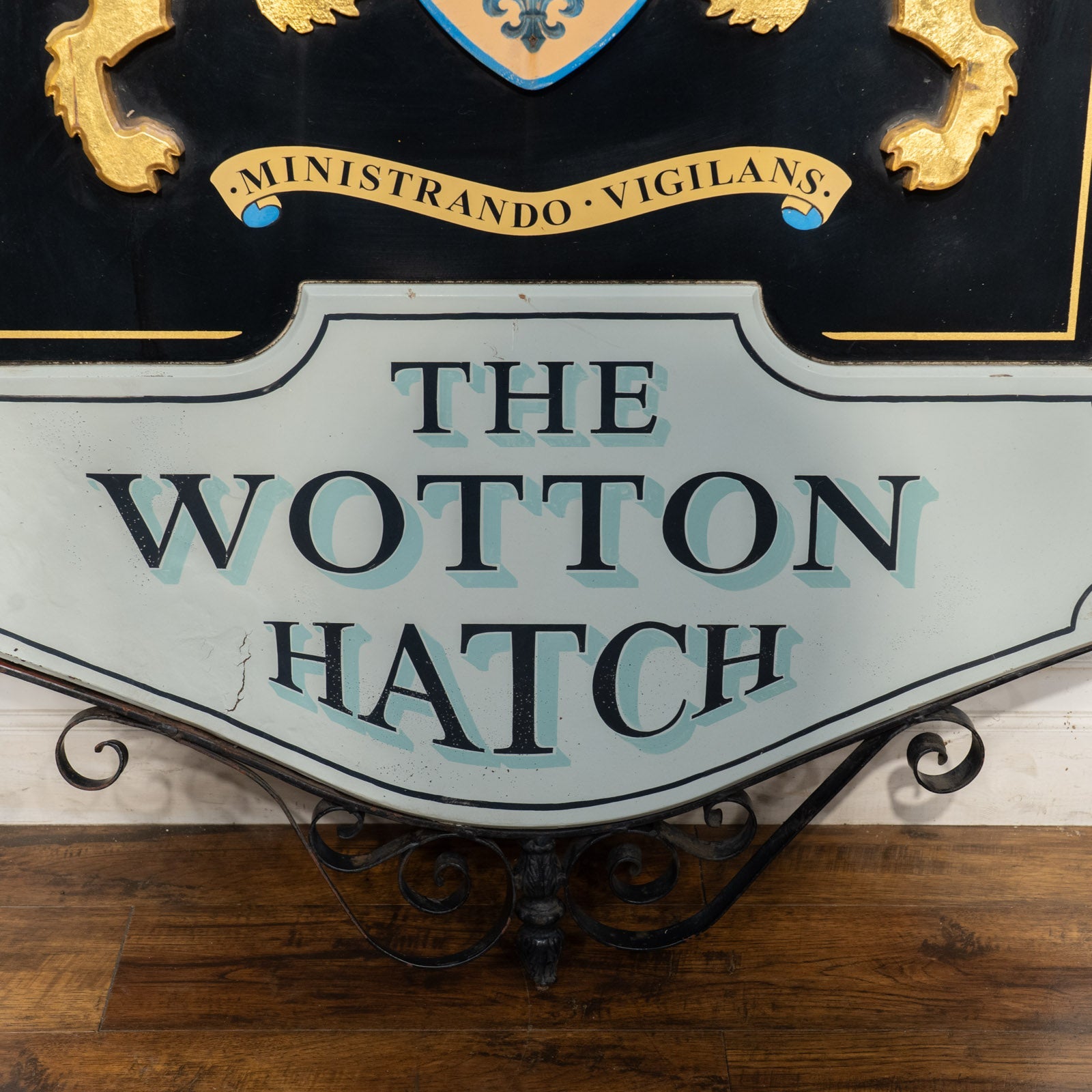 店名の「THE WOTTON HATCH」、2頭のライオンや冠などのイギリスの紋章が描かれてており、中央下にはラテン語で「MINISTRANDO VIGILANS(奉仕に油断なく)」というモットーが記されています。