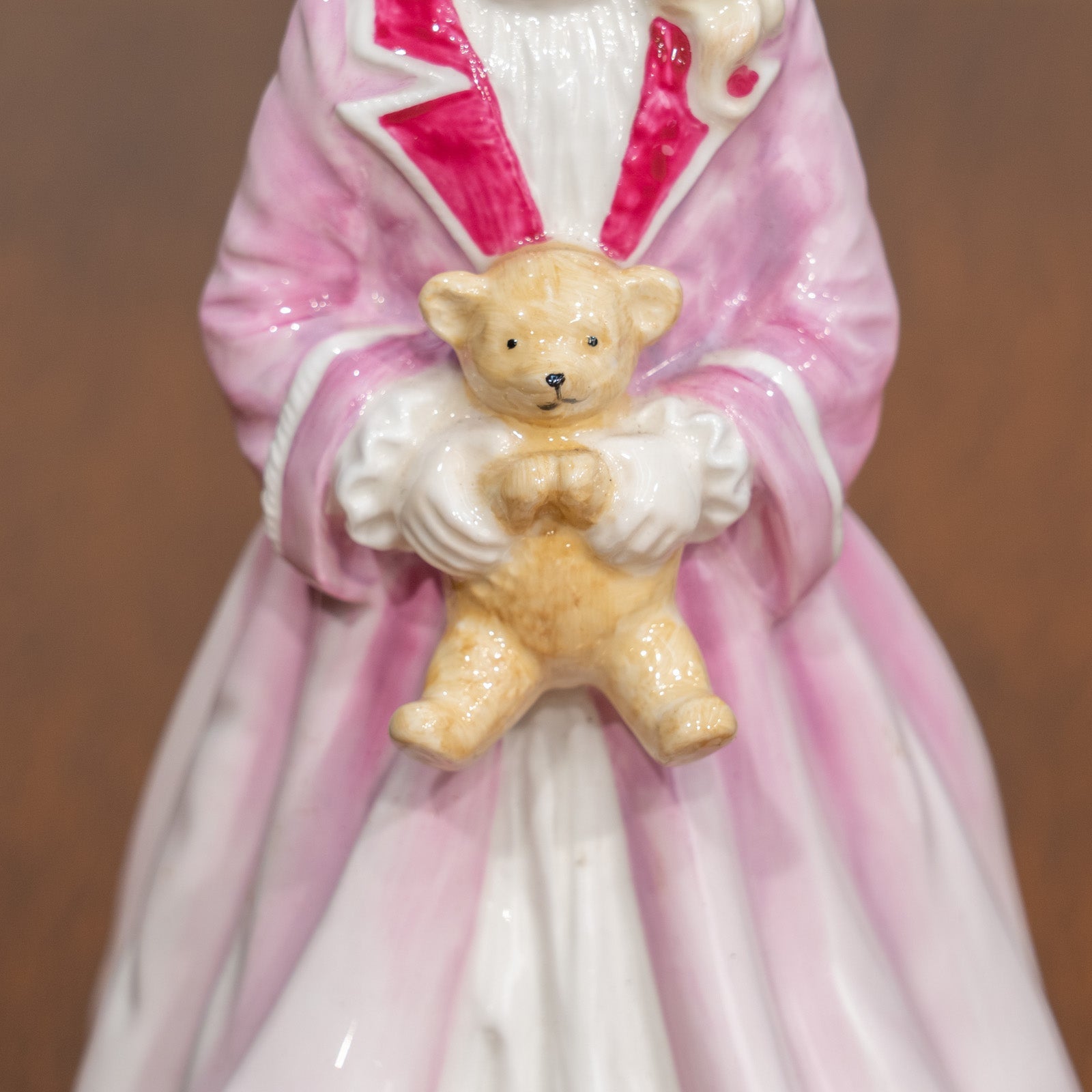 テディベアを抱いた少女がピンクのコートを着ている可愛らしい姿が描かれています。