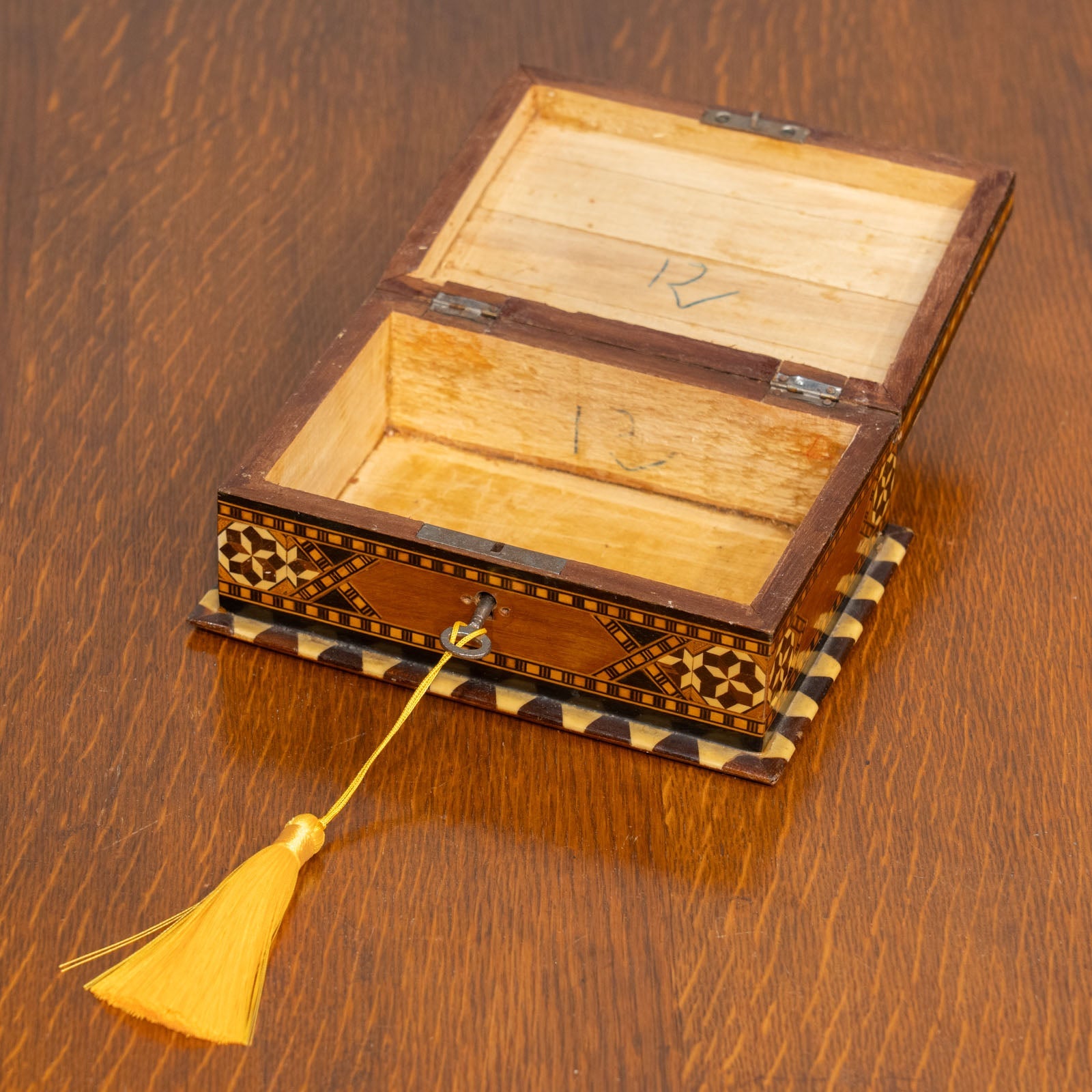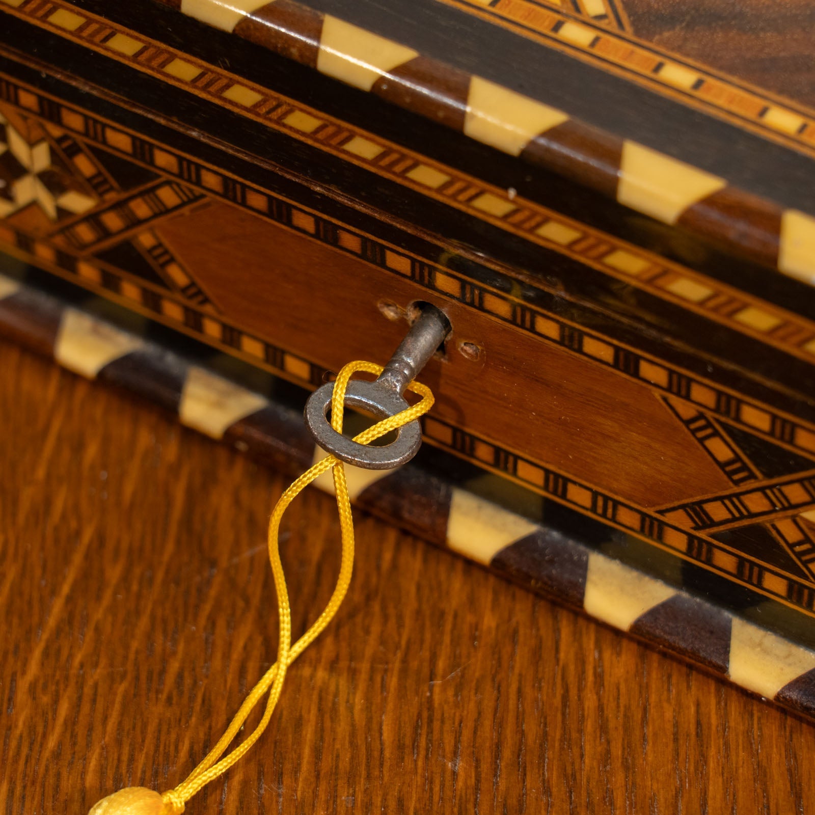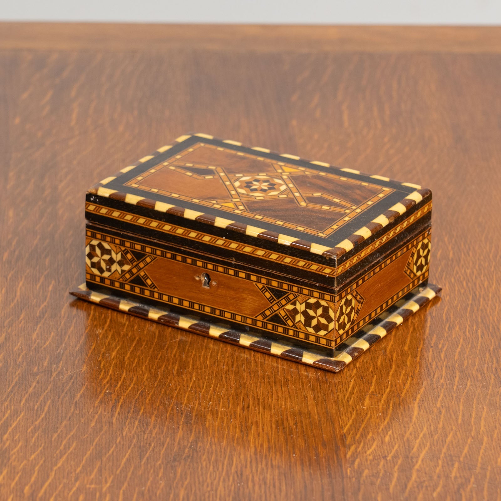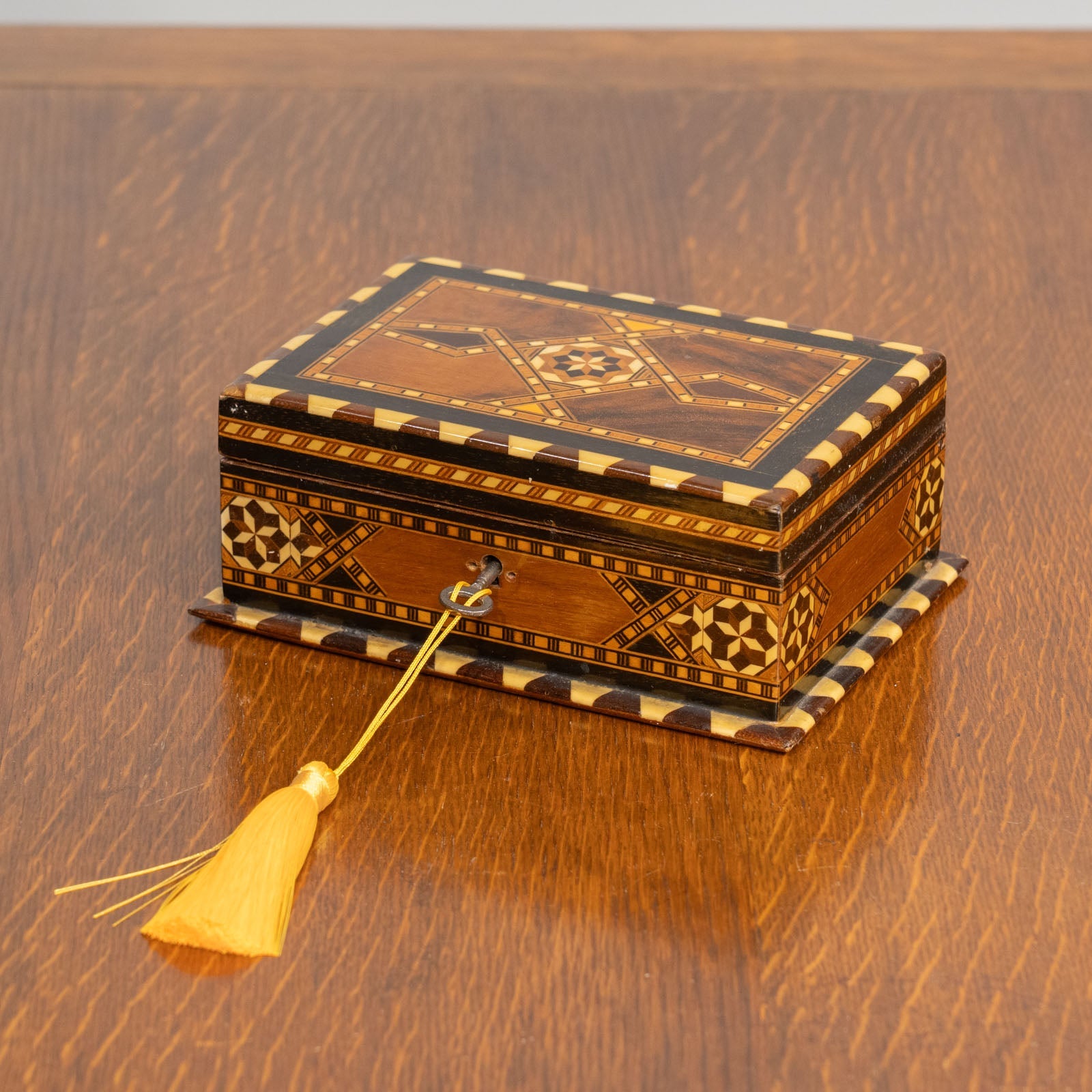 幾何学模様を緻密に組み合わせたインレイ(象嵌細工)が美しく、職人技が生み出す繊細な装飾が目を惹きます。
