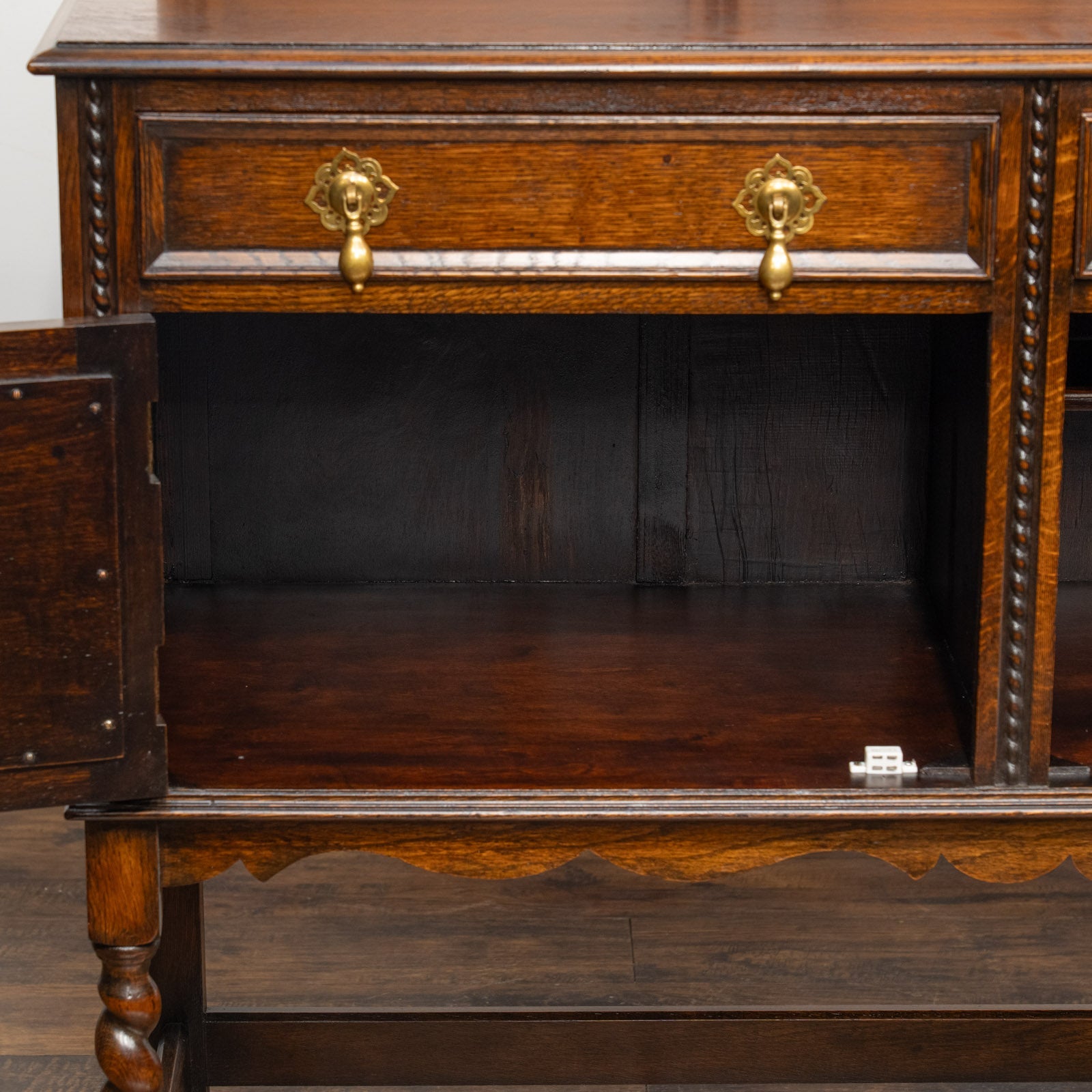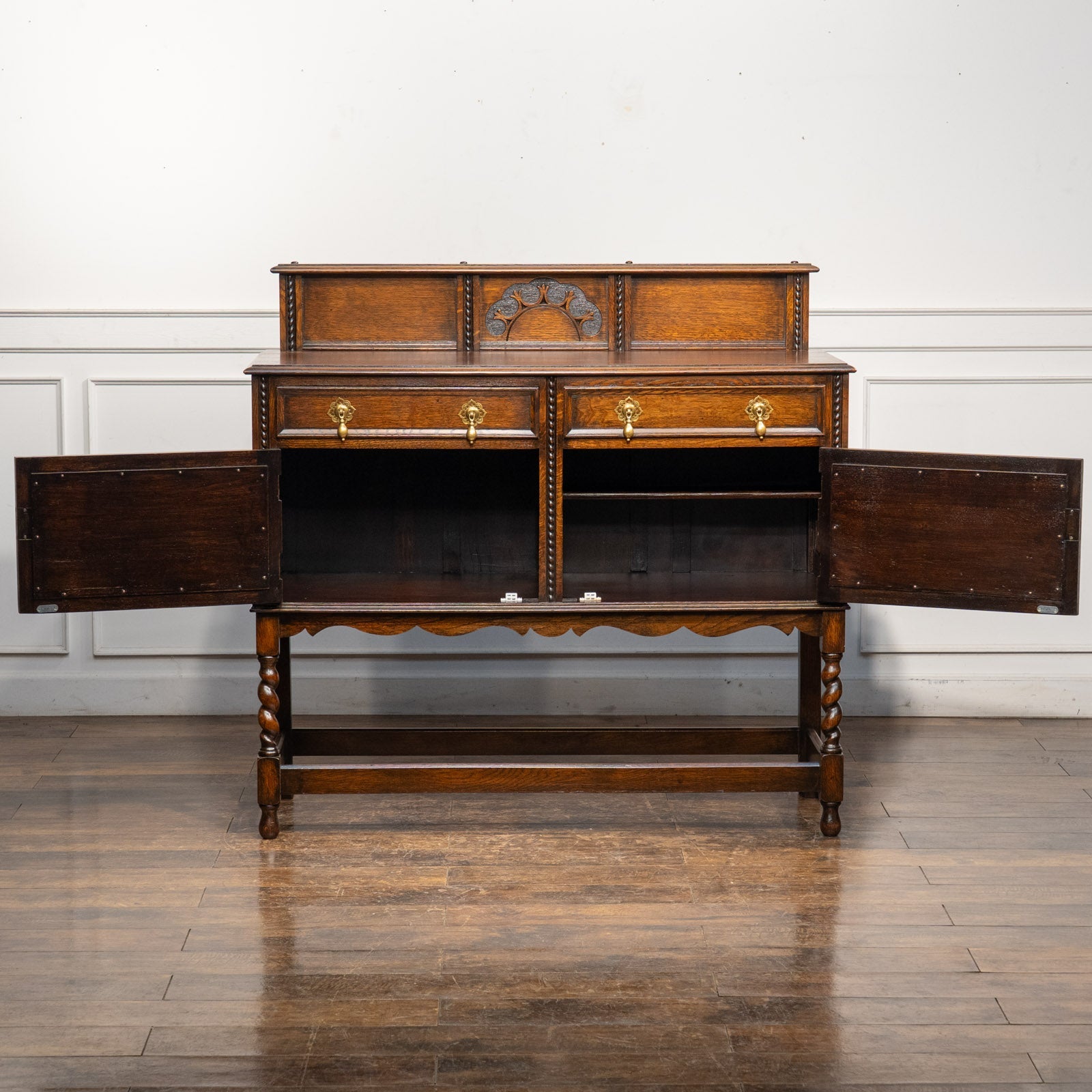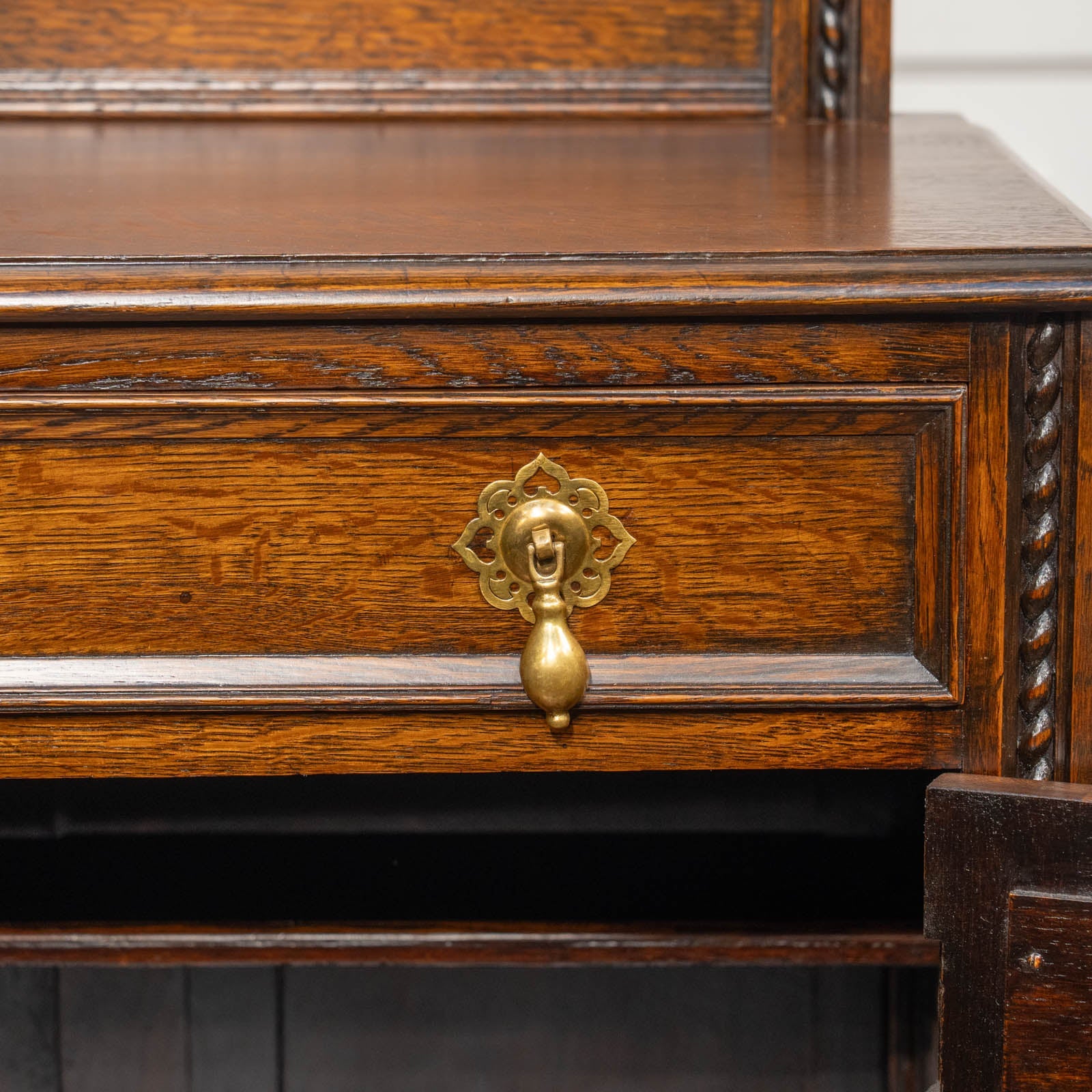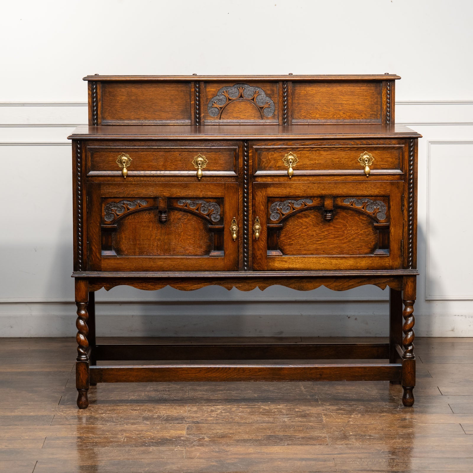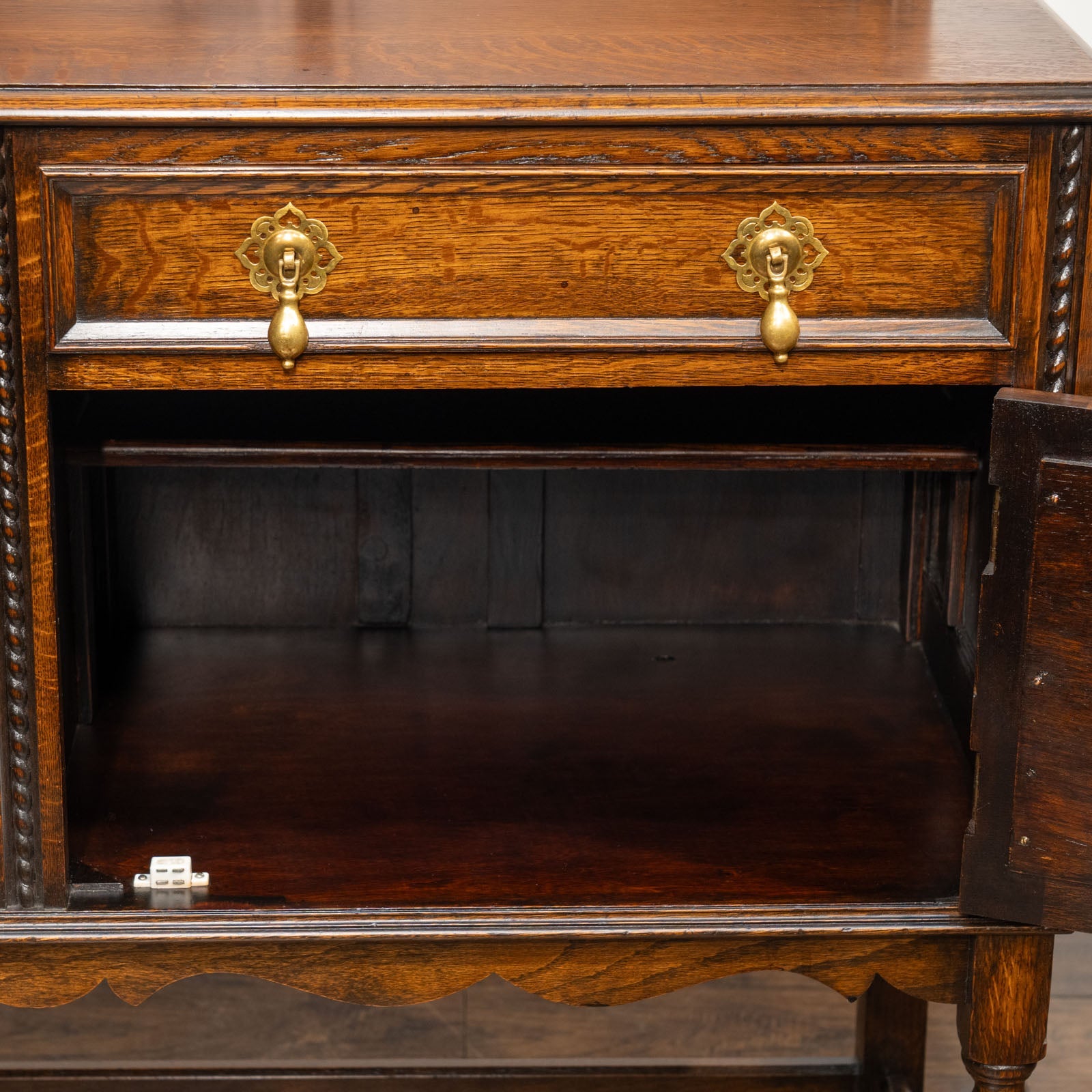 アーチを模した扉の装飾やドロップハンドルのデザインも美しく、ツイストレッグも上品でアンティークらしい空間作りにぴったりです。
