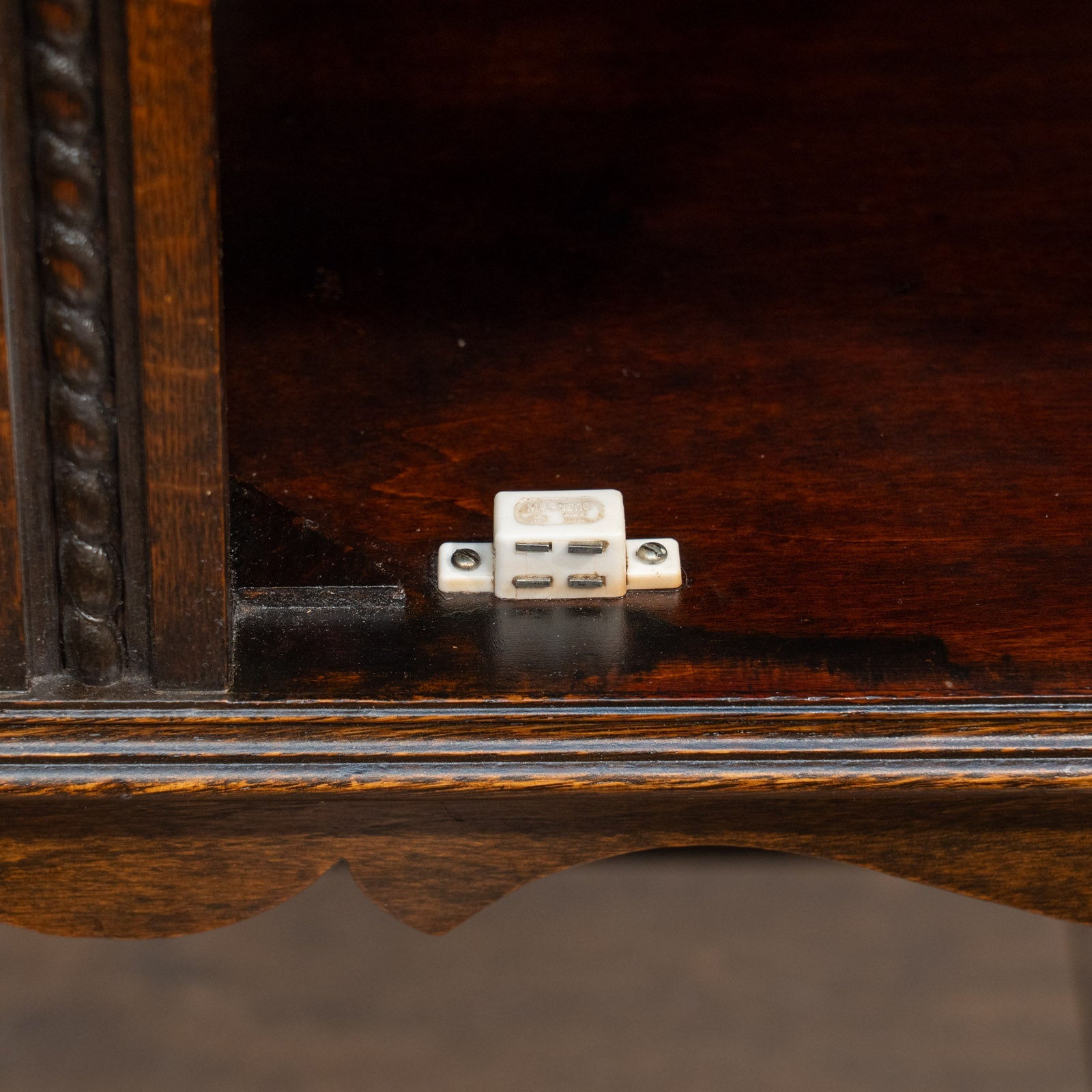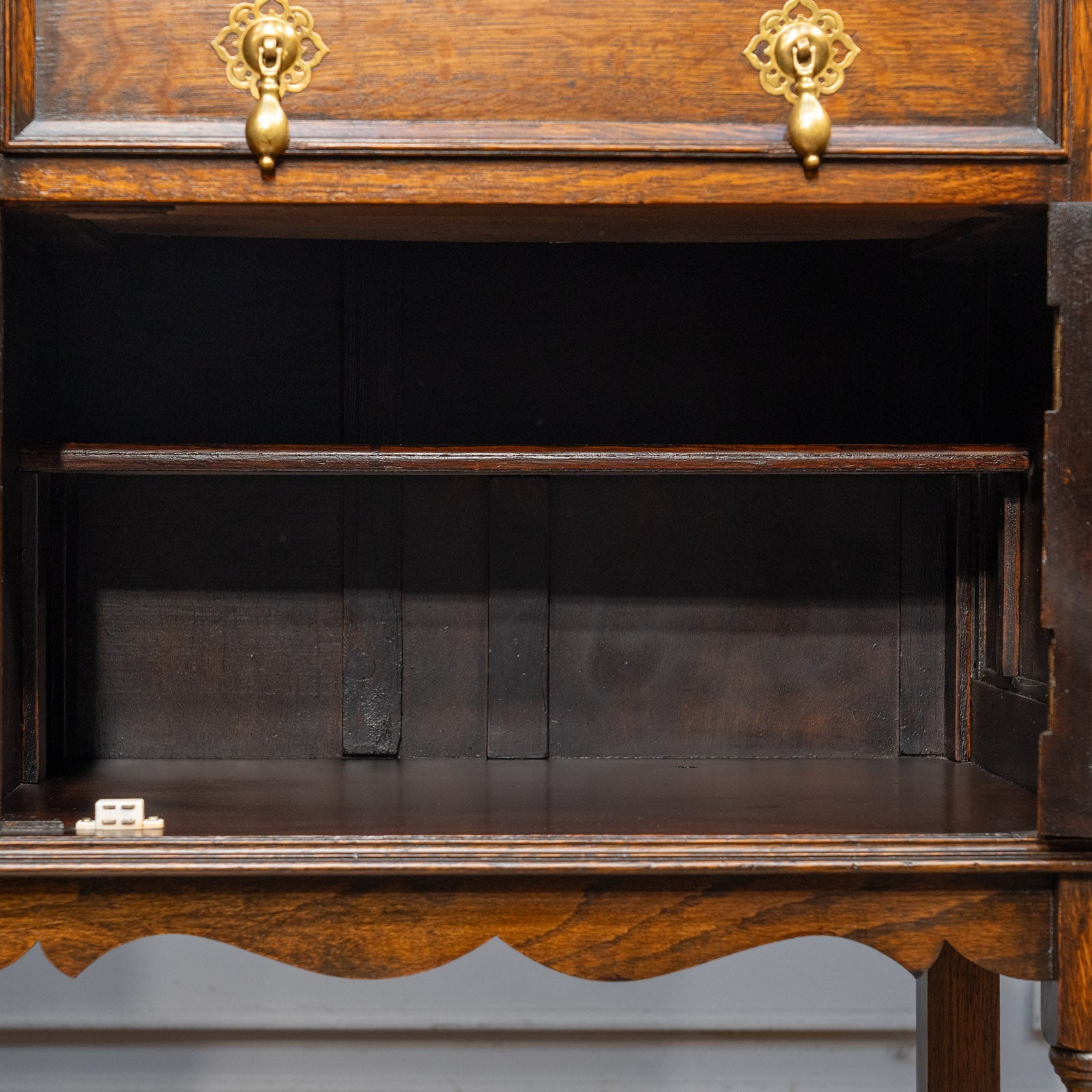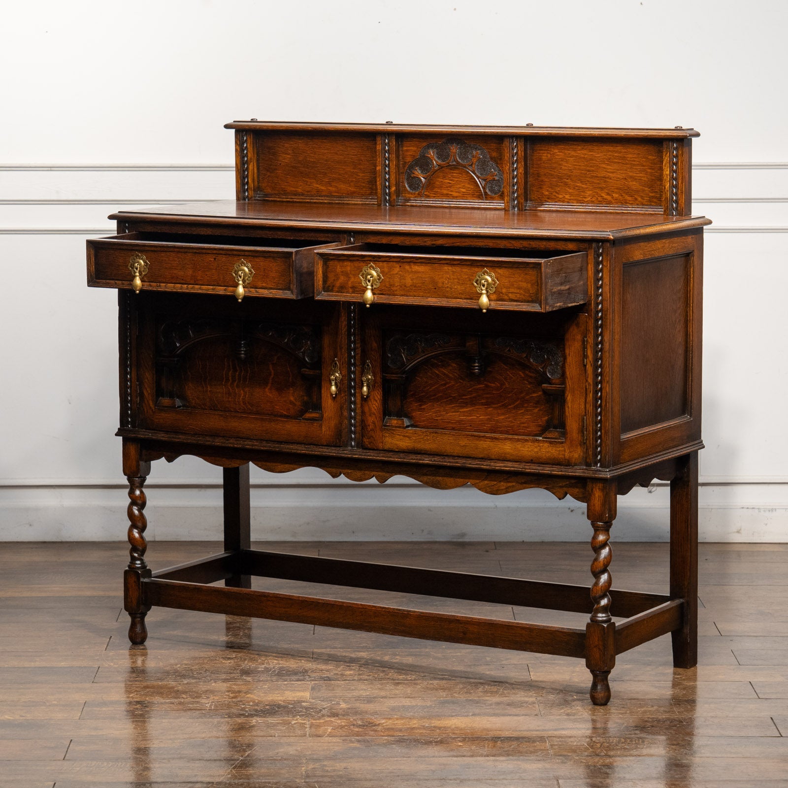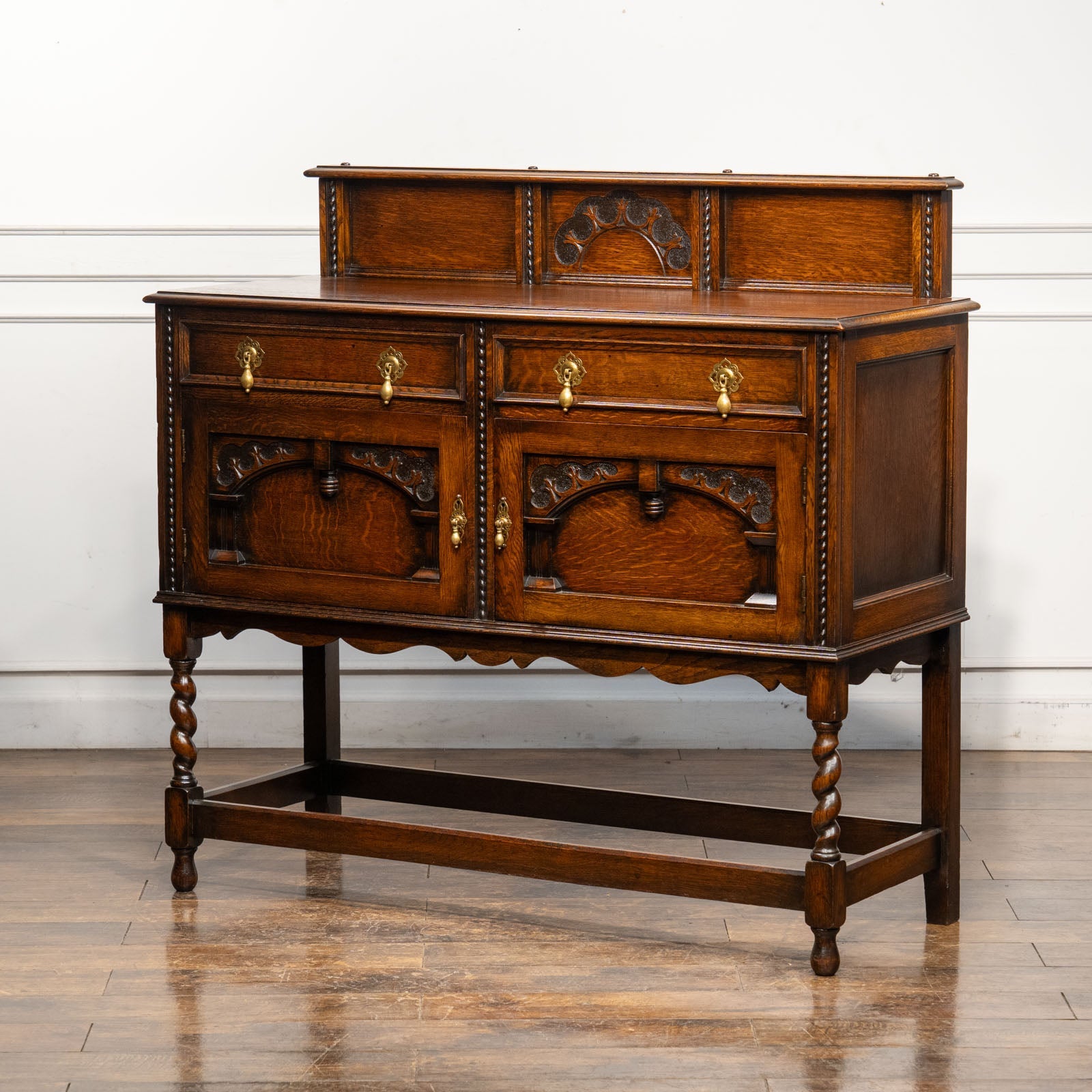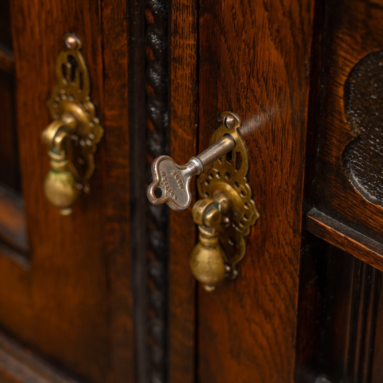 アーチを模した扉の装飾やドロップハンドルのデザインも美しく、ツイストレッグも上品でアンティークらしい空間作りにぴったりです。