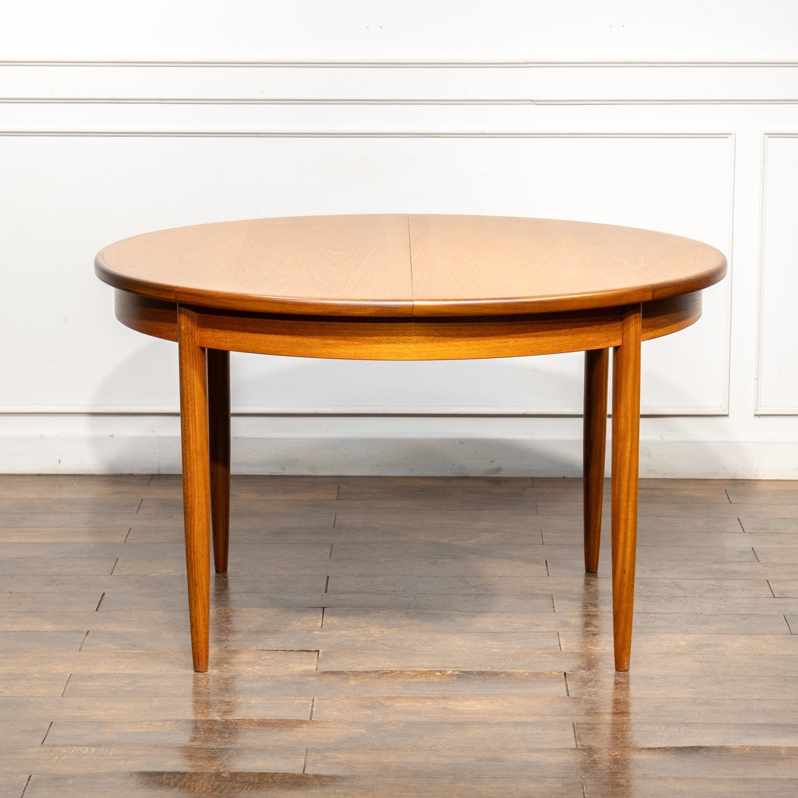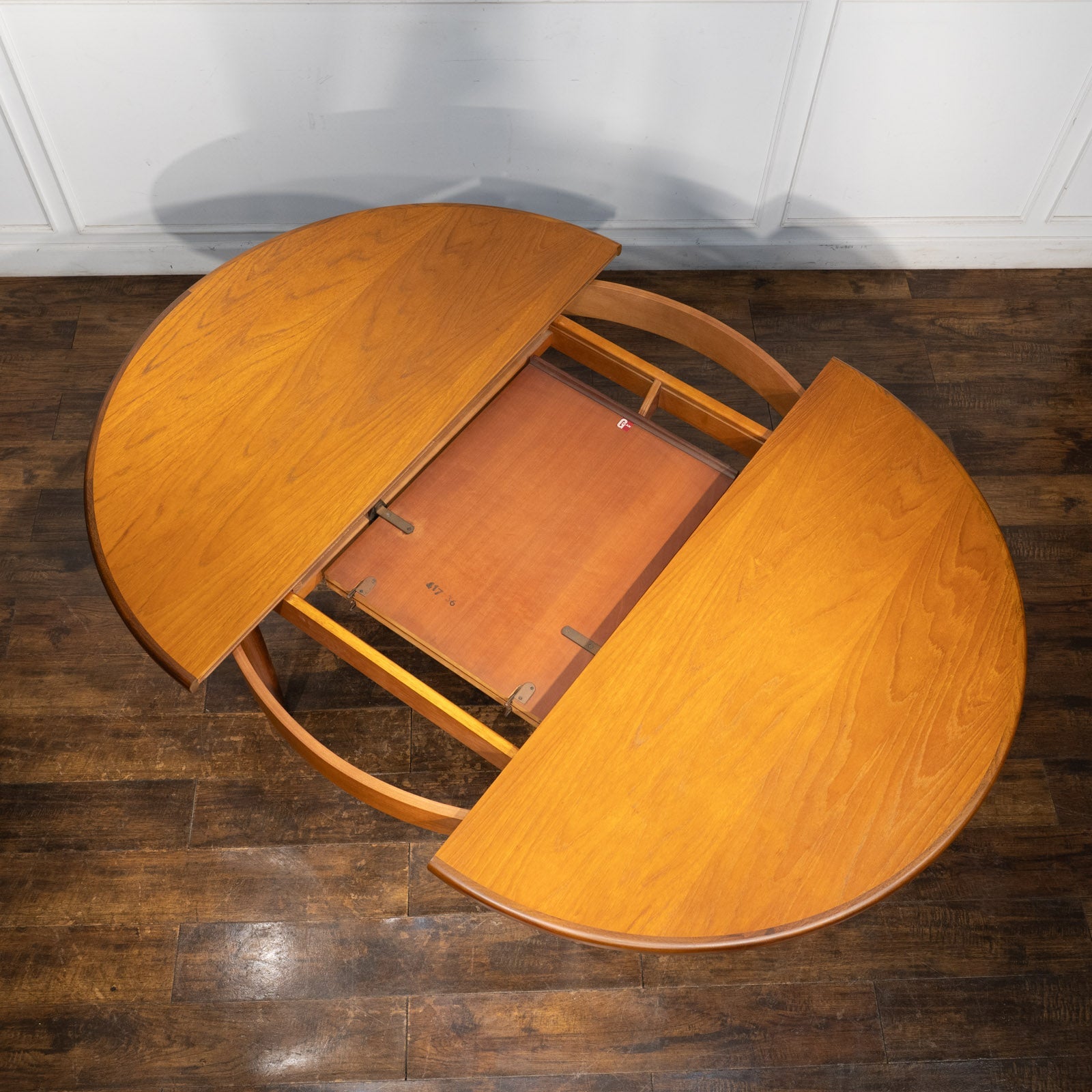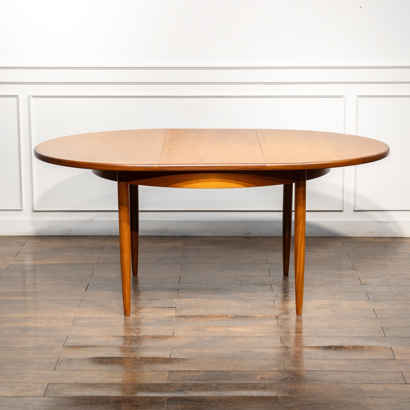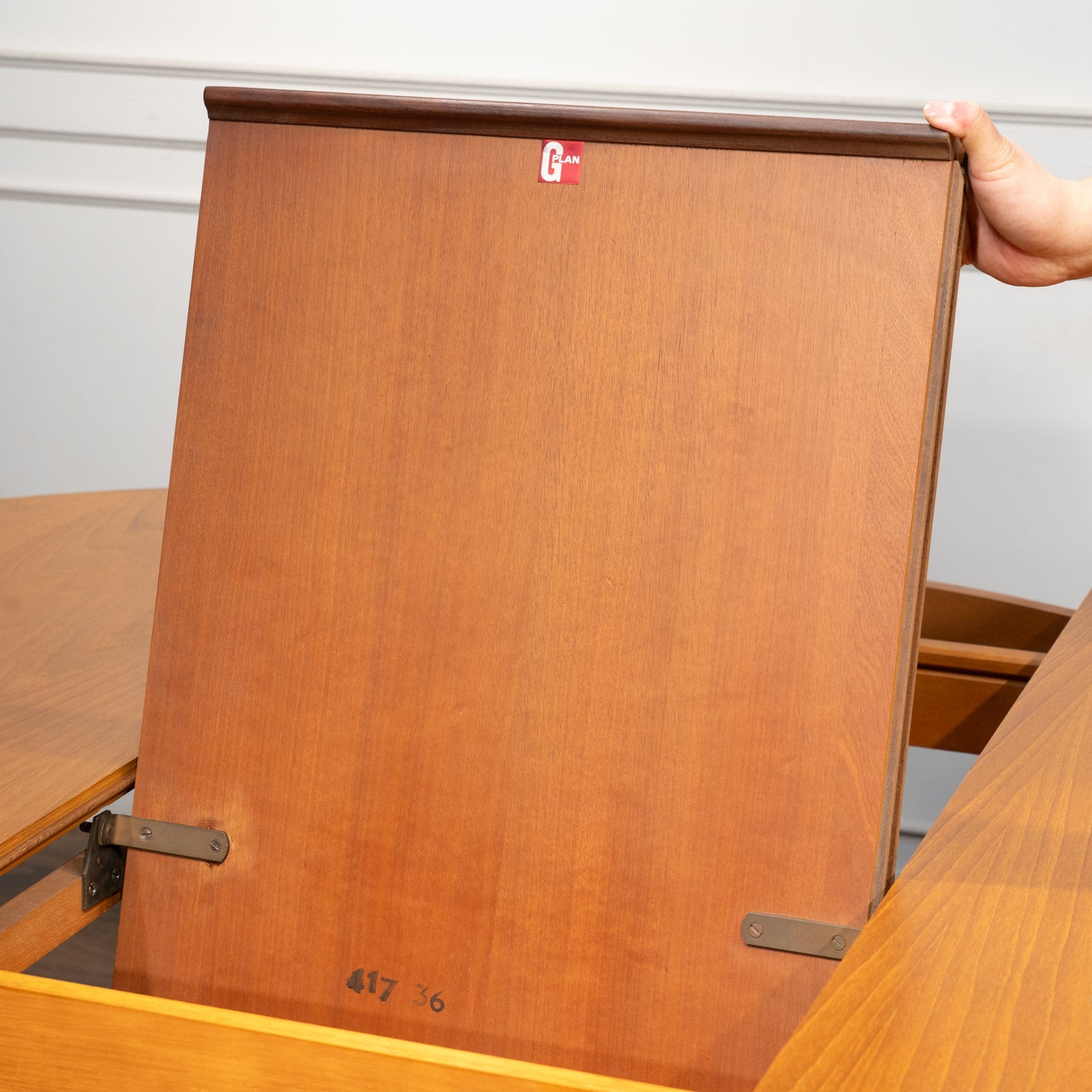 Victor Bramwell Wilkins(ビクター・ブラムウェル・ウィルキンス)デザインのG-PLAN定番のダイニングテーブルで、甲板の下の受けに収納されている補助天板を広げることで大きさが変えられます。