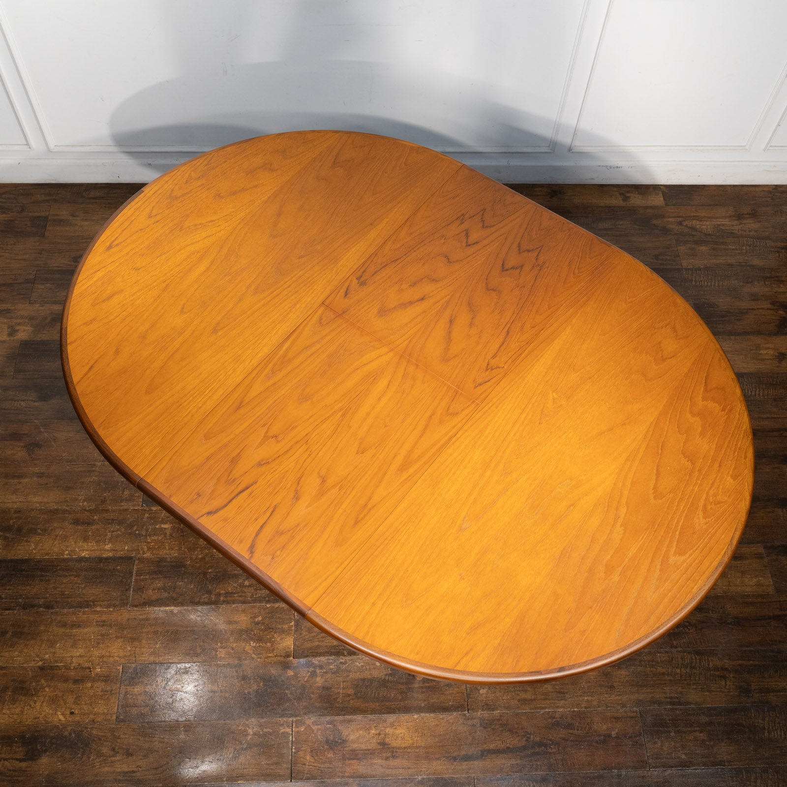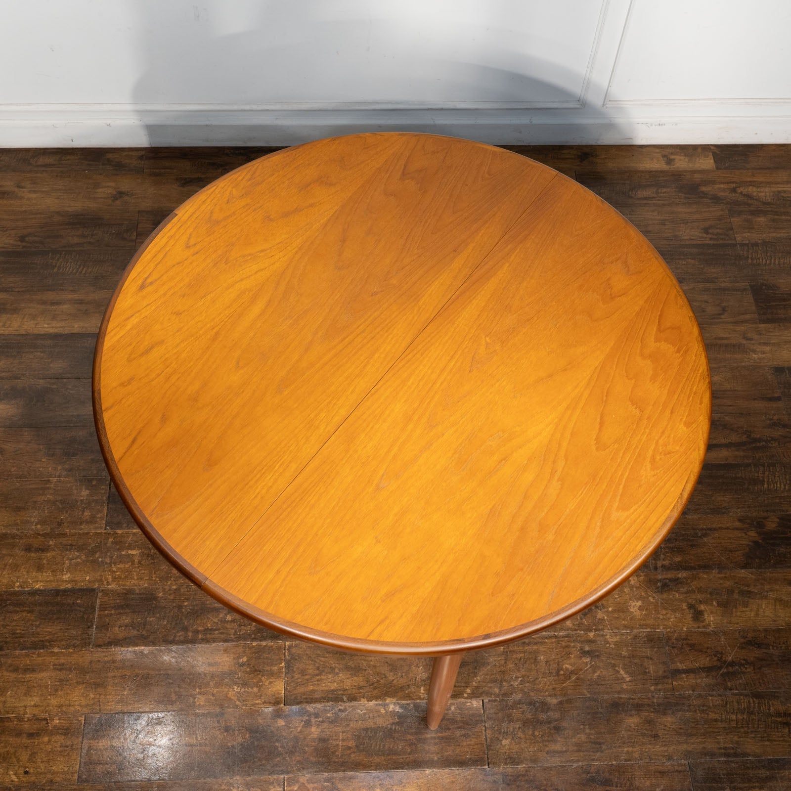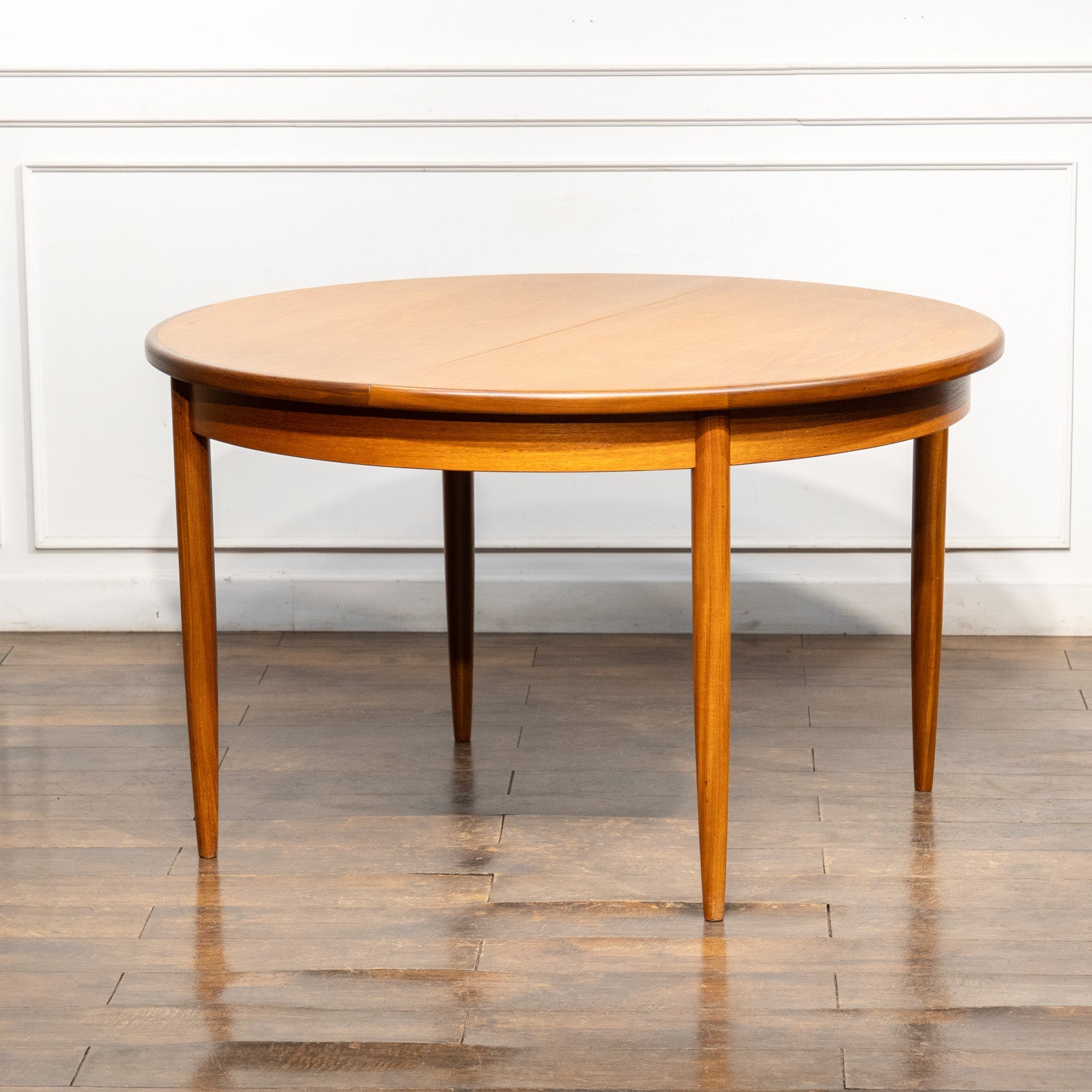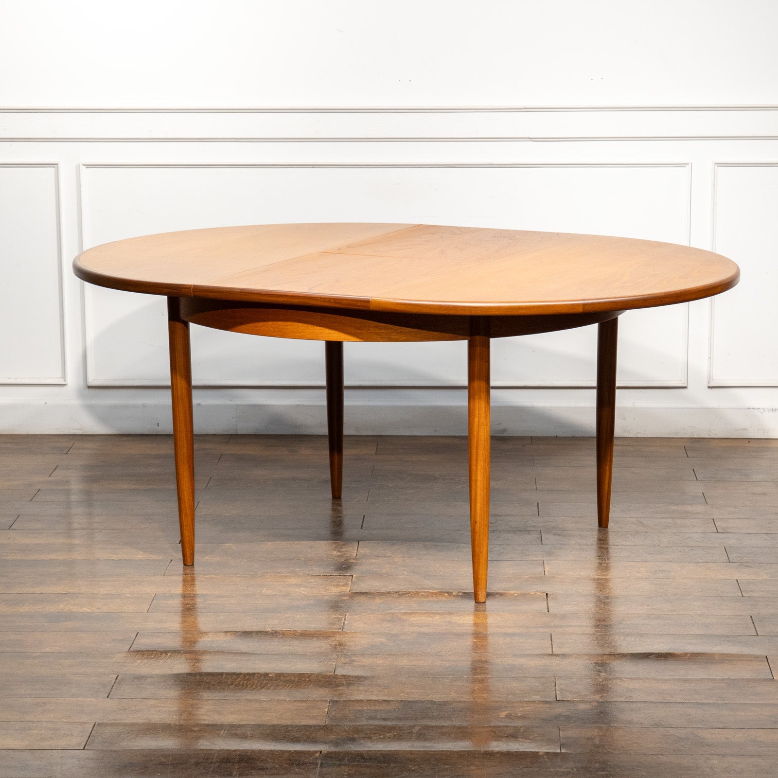 Victor Bramwell Wilkins(ビクター・ブラムウェル・ウィルキンス)デザインのG-PLAN定番のダイニングテーブルで、甲板の下の受けに収納されている補助天板を広げることで大きさが変えられます。