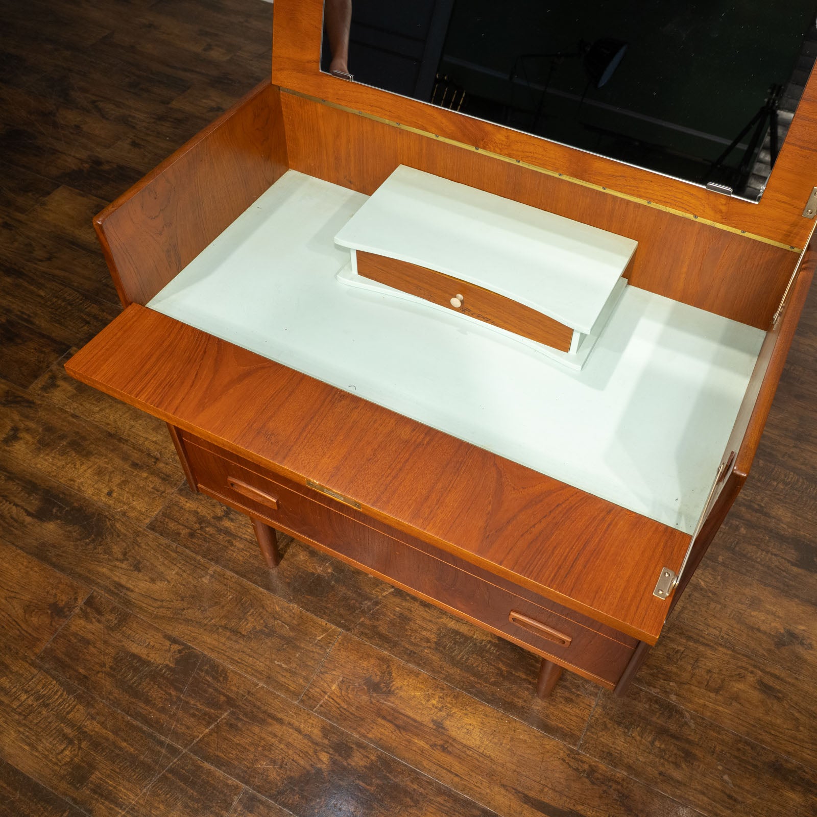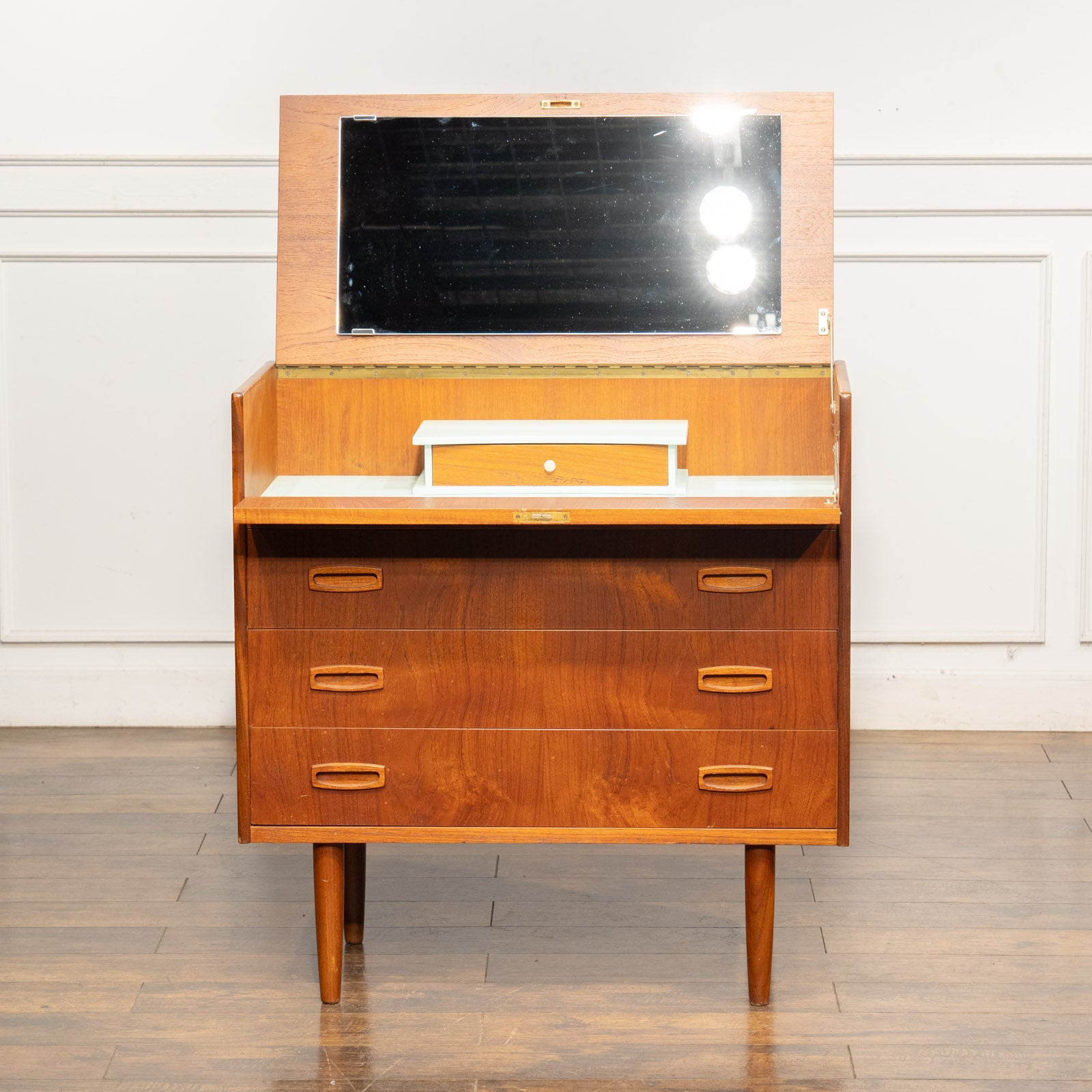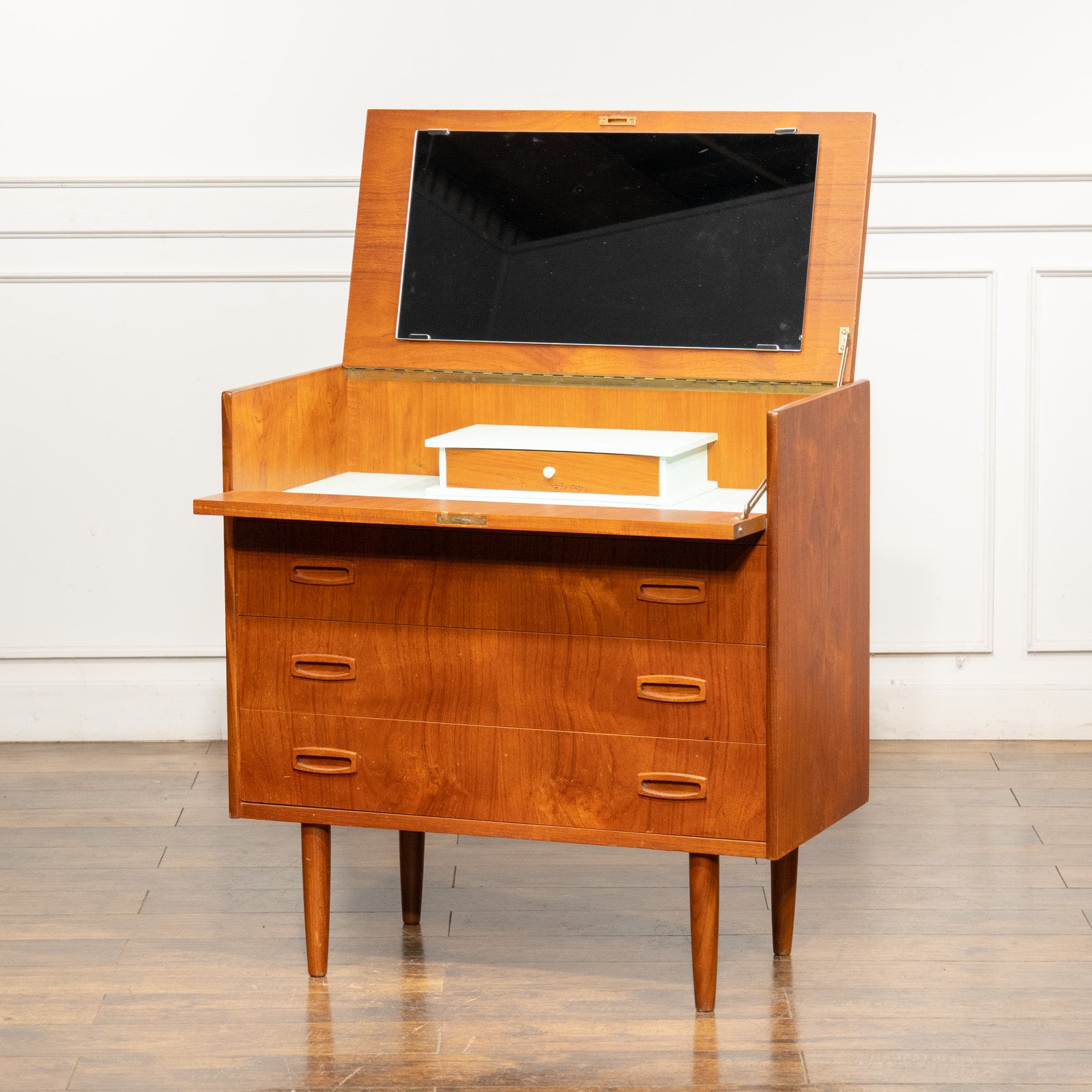 一見シンプルな北欧スタイルのチェストですが、天板を上に開いて最上段のダミーの引き出しを手前に倒すとドレッサーに変身します。